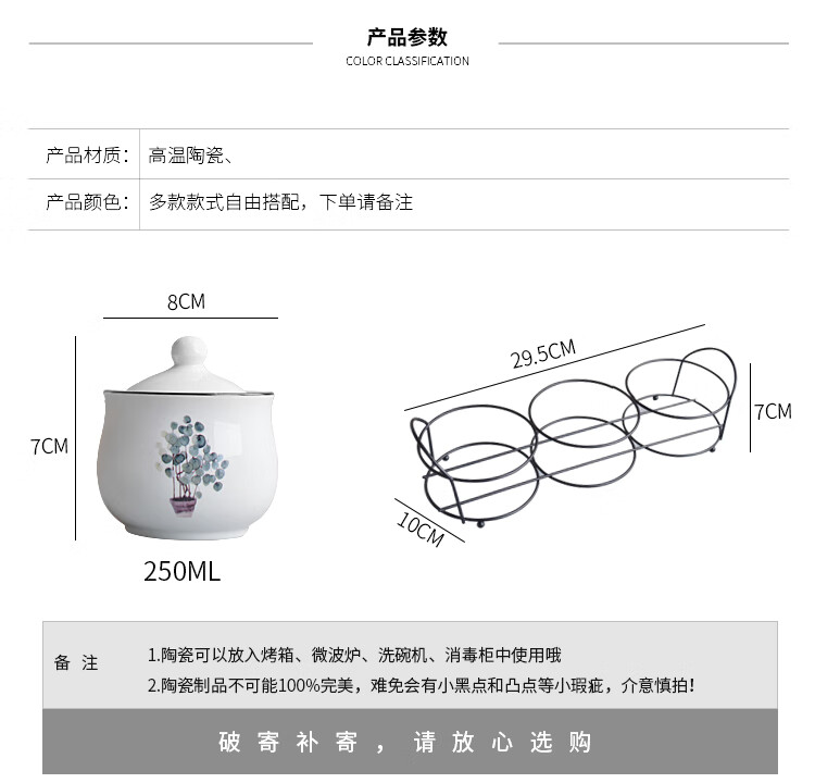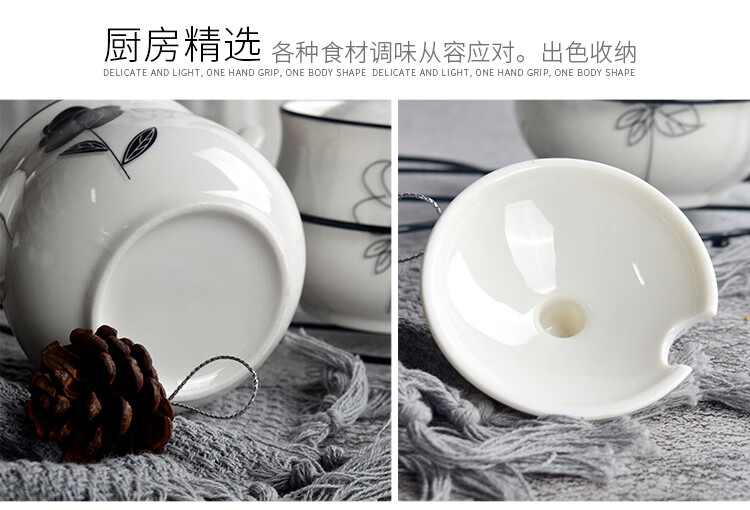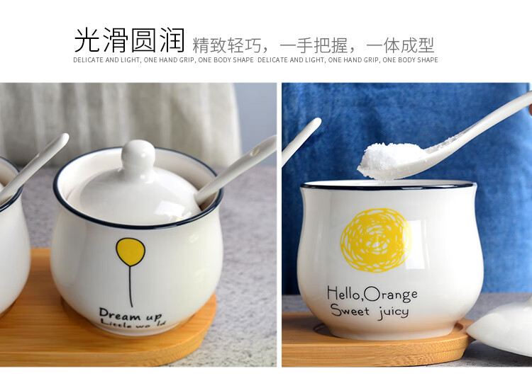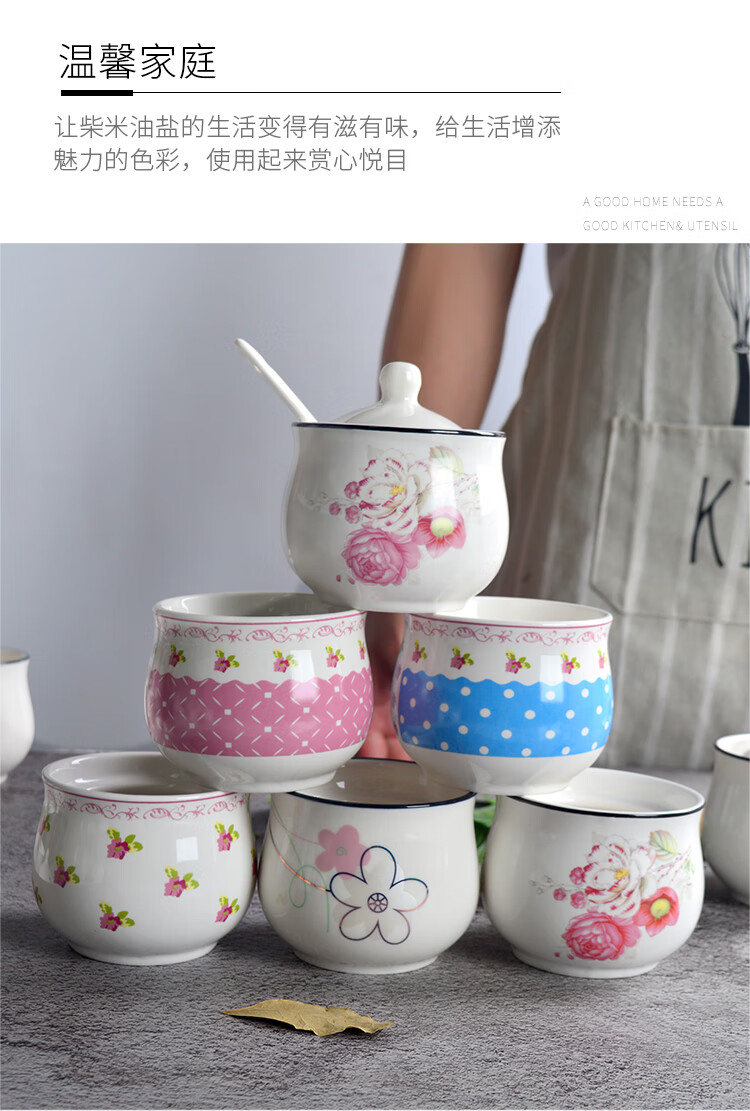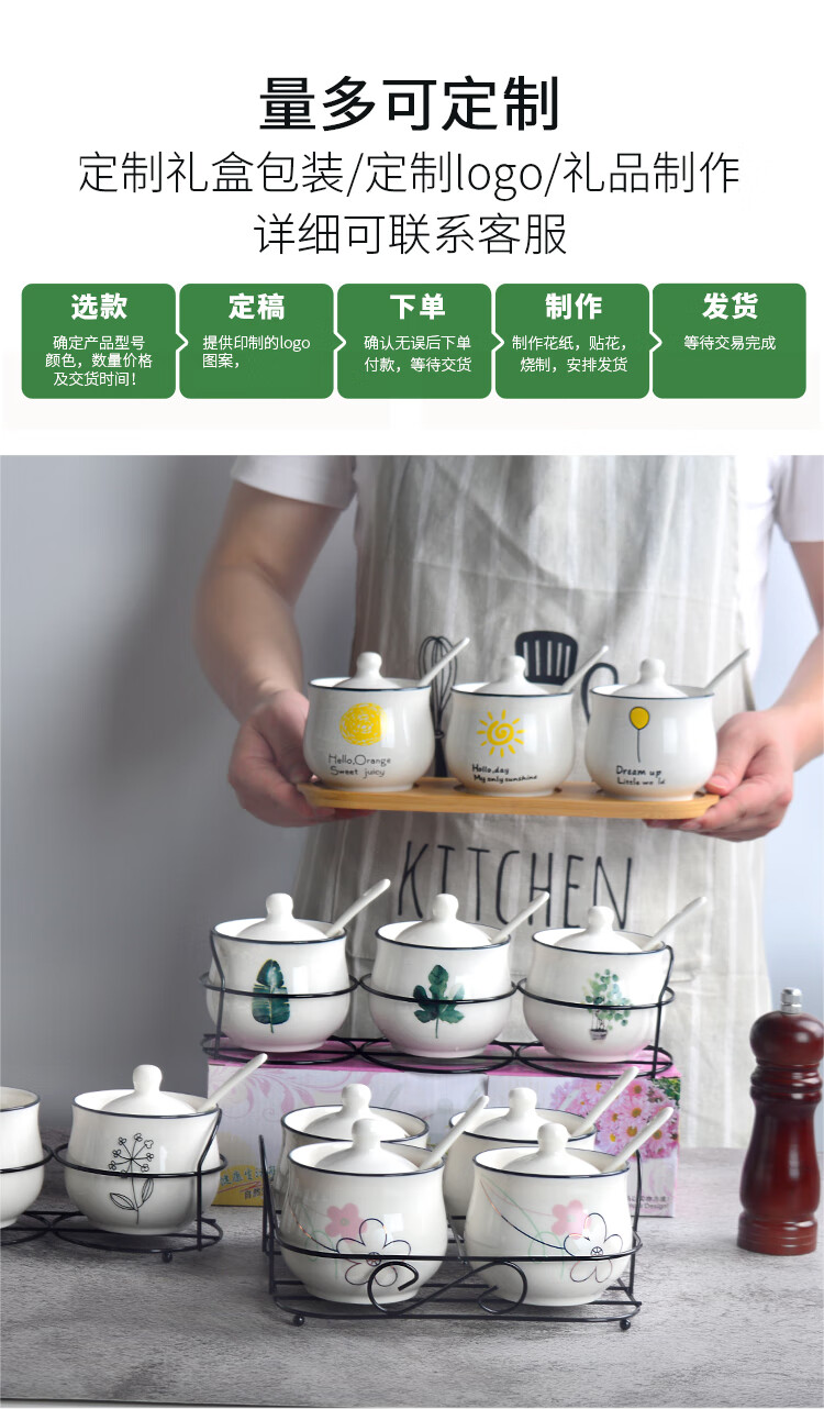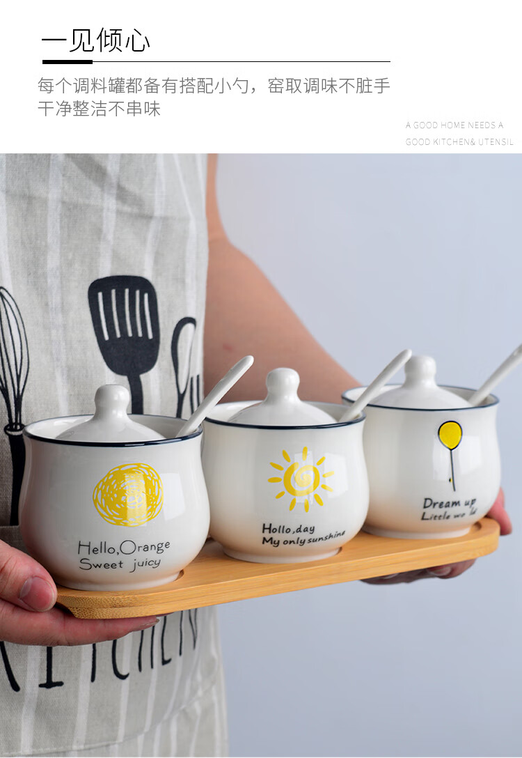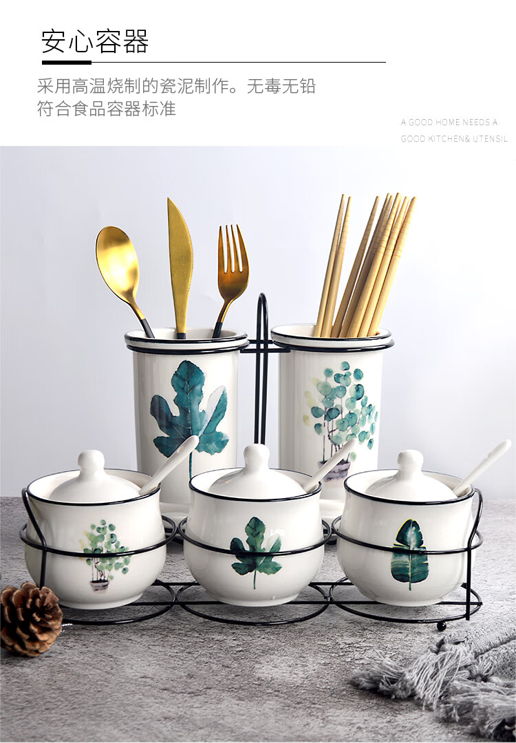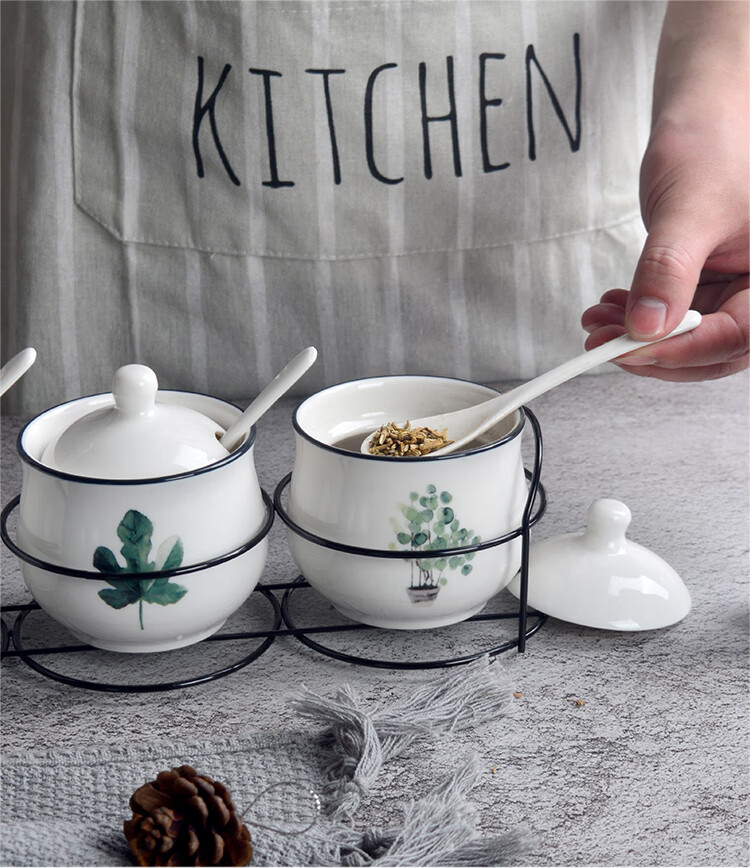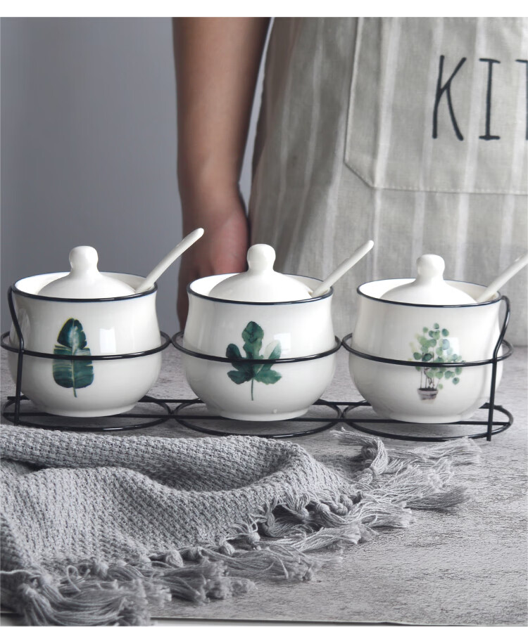 Molin Ceramic Seasoning Jar Seasoning Box 4 Set Kitchen Supplies Household Seasoning Bottle 3-piece Set Salt Shaker MSG Chili Single Green Leaf Three-piece Set (with Stand)
