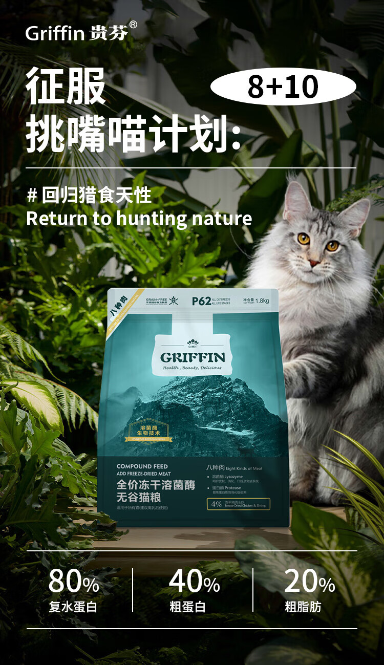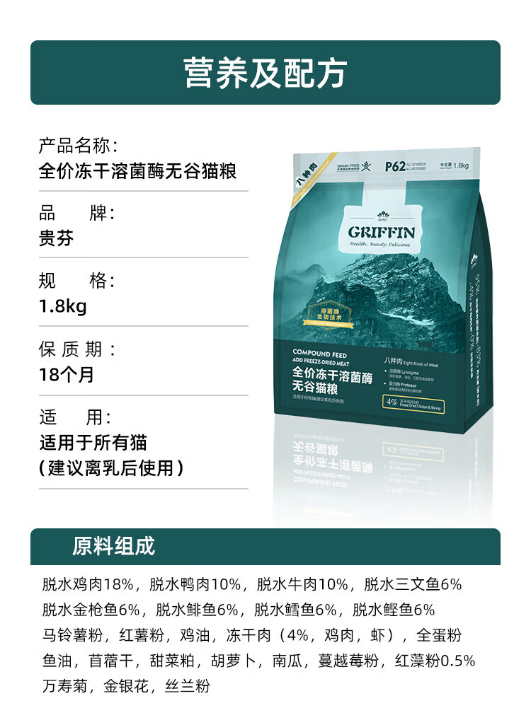 GRIFFIN Cat Food P62 Grain-Free Freeze-Dried Double Mix Full Price Cat Food Added Probiotics Eight Kinds of Meat Formula Red and White Meat P68 Grain-Free White Meat Cat Food 1.8kg