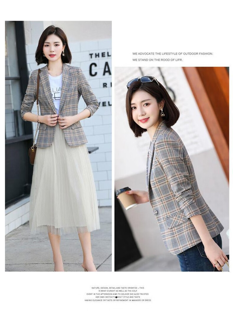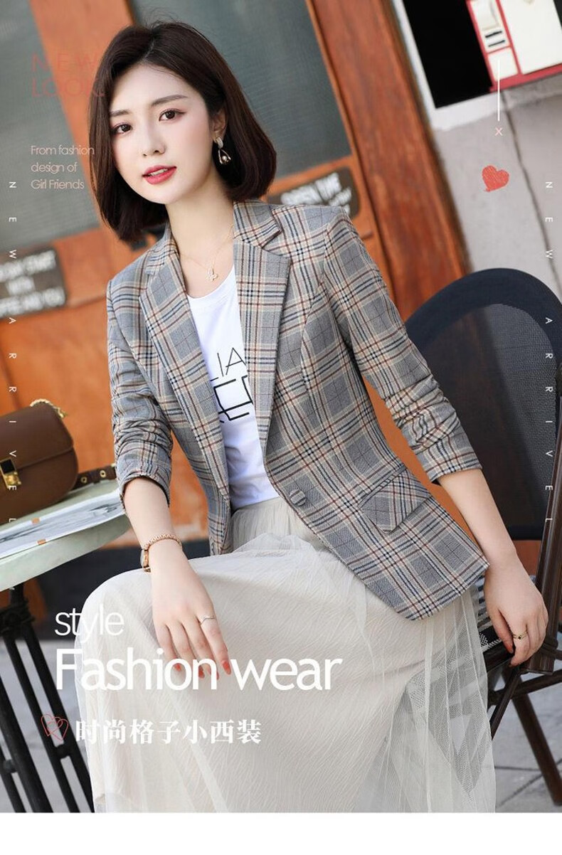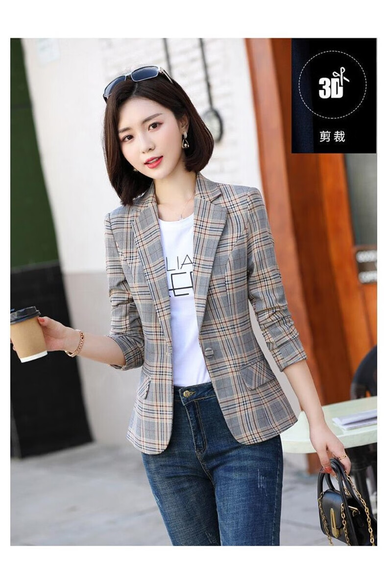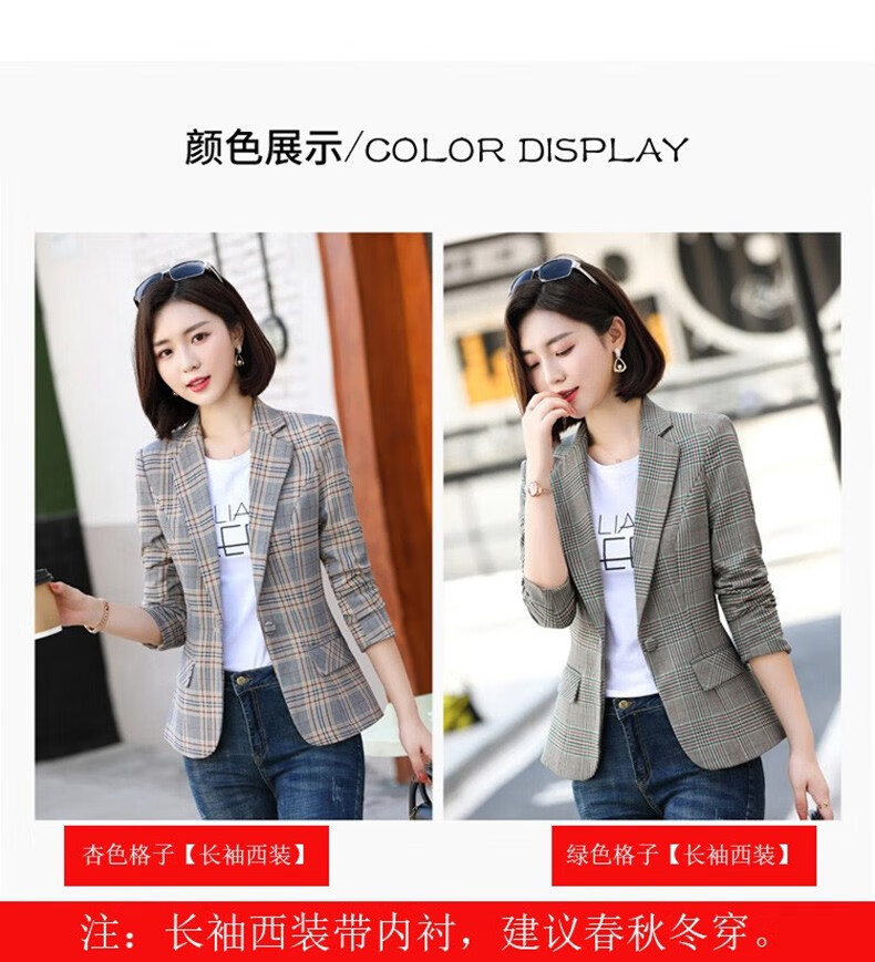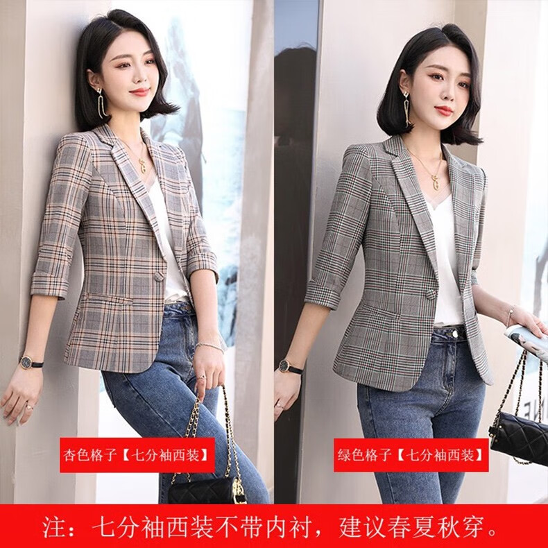 樱芭妮格子小西装外套女2025春秋新款修身显瘦小个子休闲小西服长袖上衣 8918杏格长袖 2XL (119-128斤)