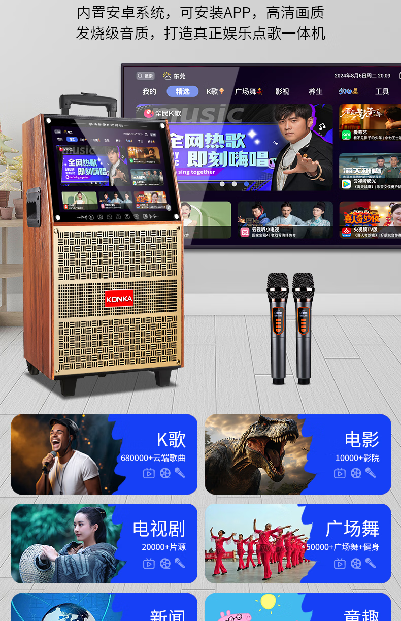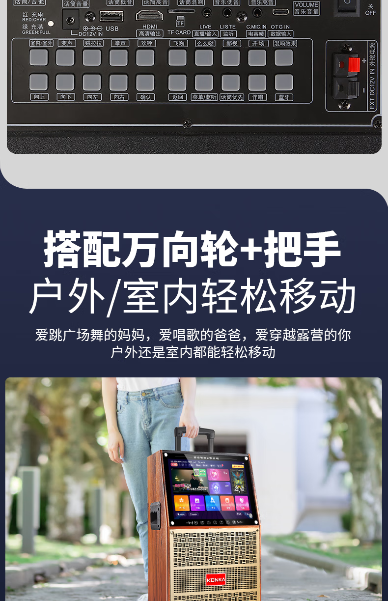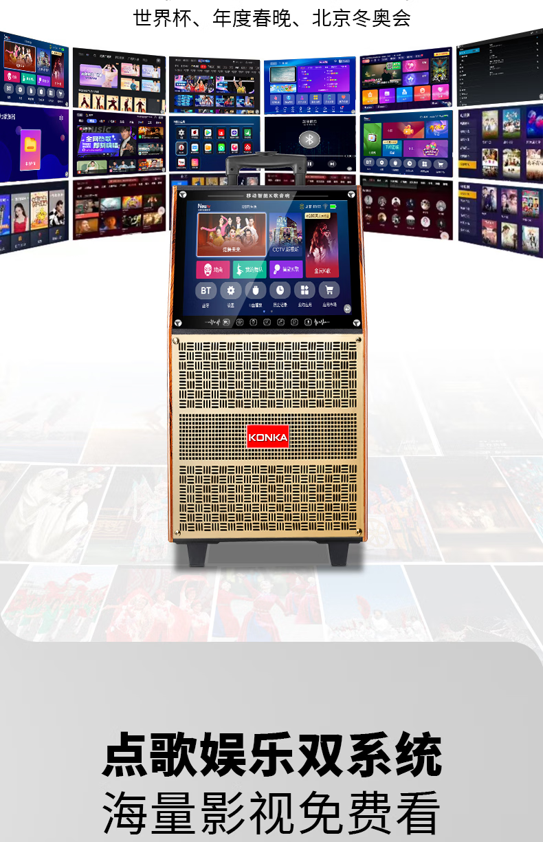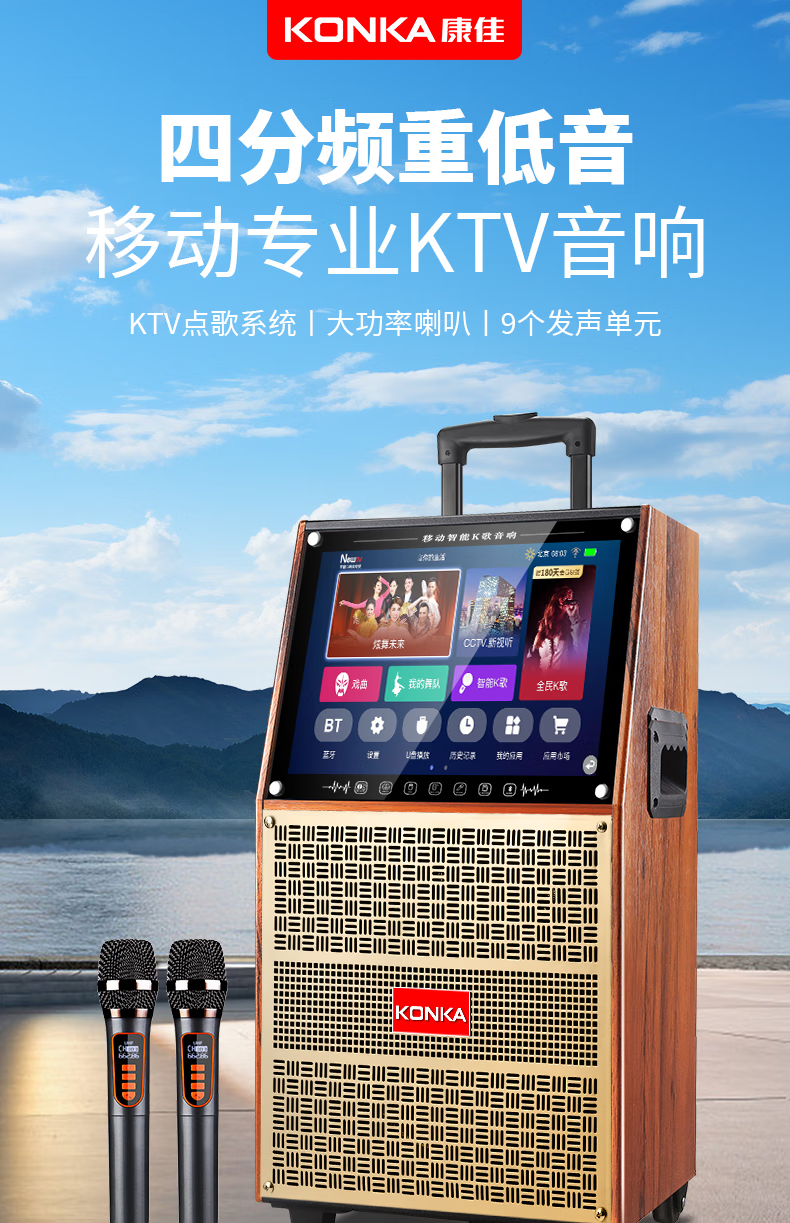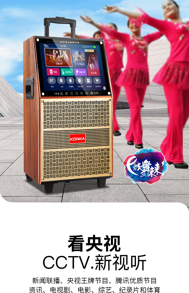 KONKA outdoor square dance trolley audio with display screen home touch screen portable wifi mobile ktv trolley speaker video and song all-in-one machine 29-inch touch screen version + dual microphones + 32GU disk