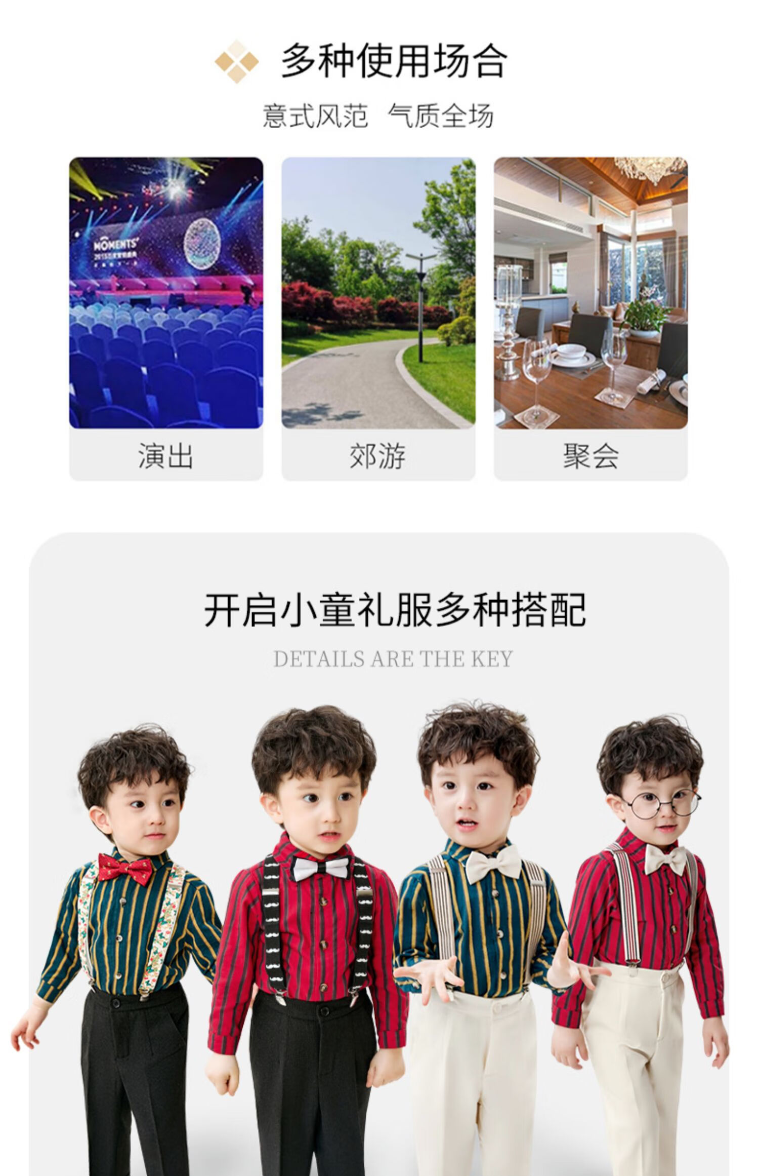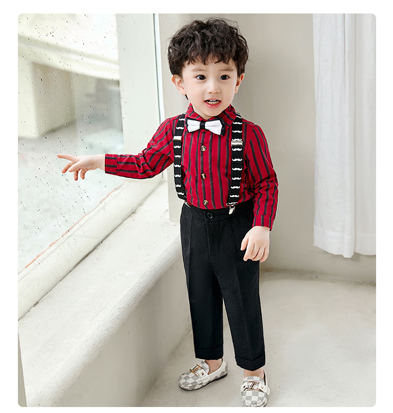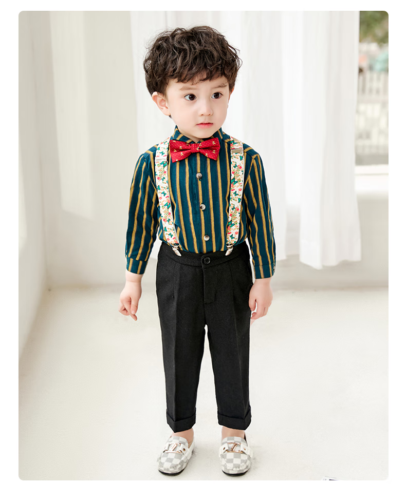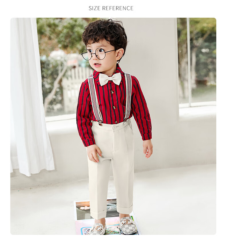 Romon boy suspender dress suit handsome British baby first birthday party suit boy flower girl suit long-sleeved shirt + beige trousers + suspender + bow tie 120