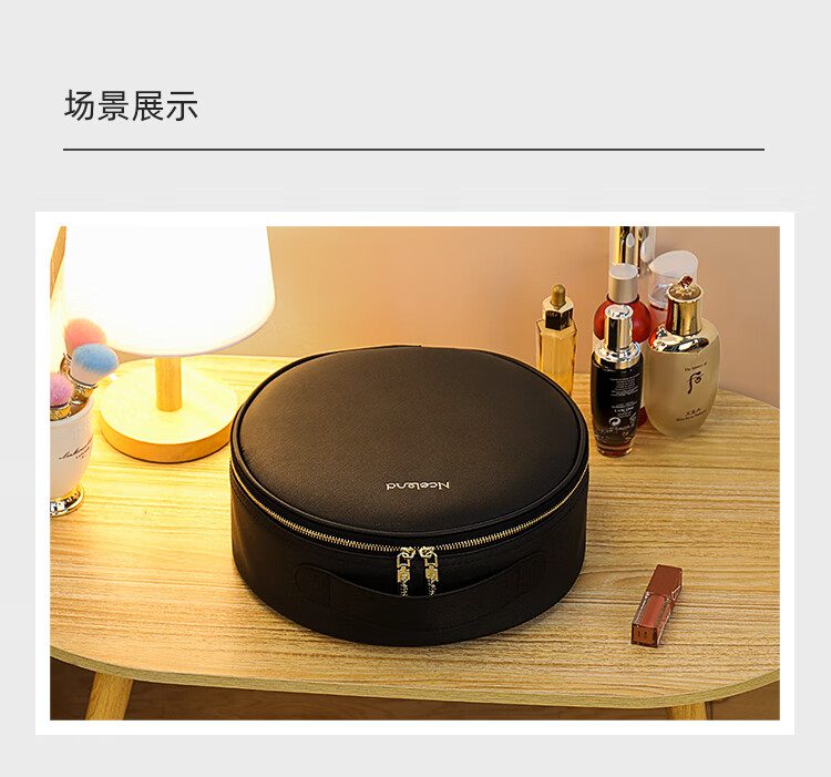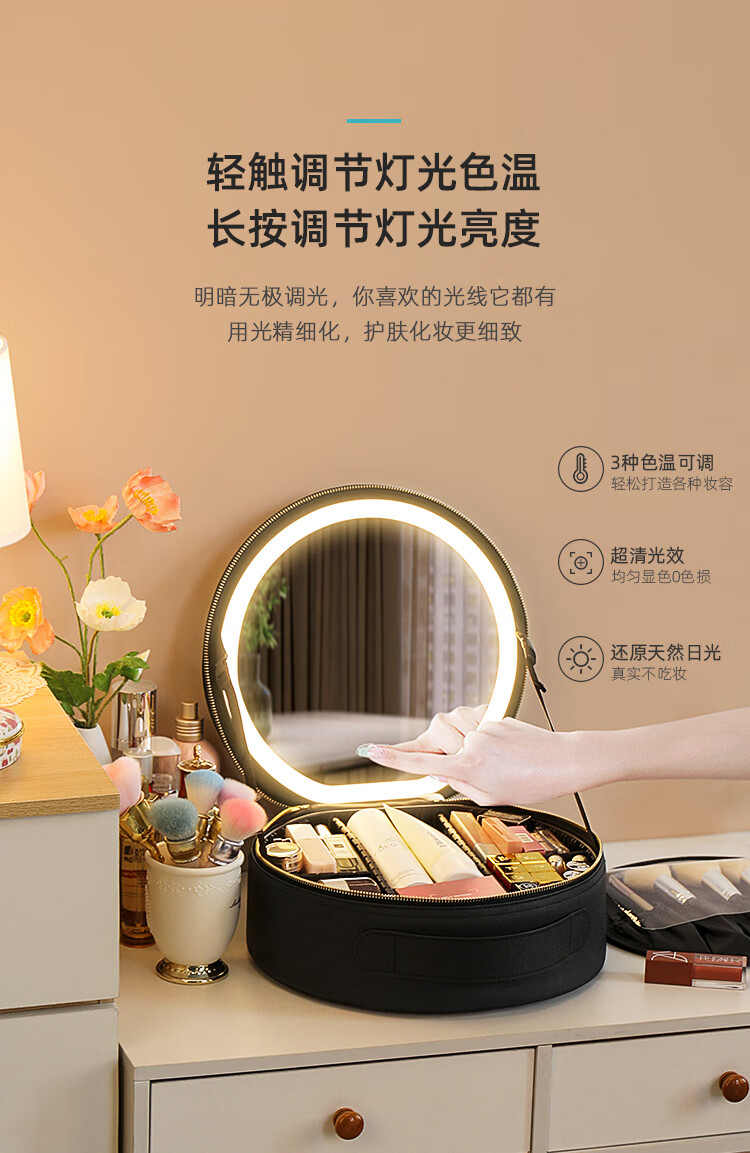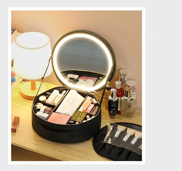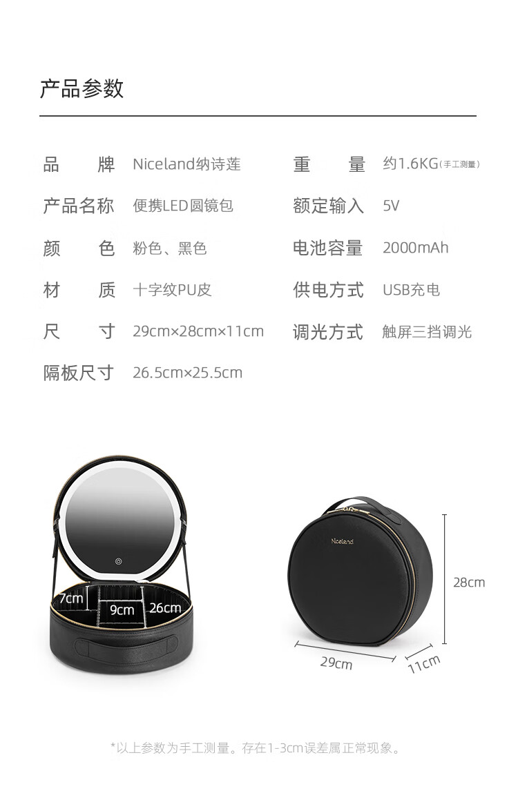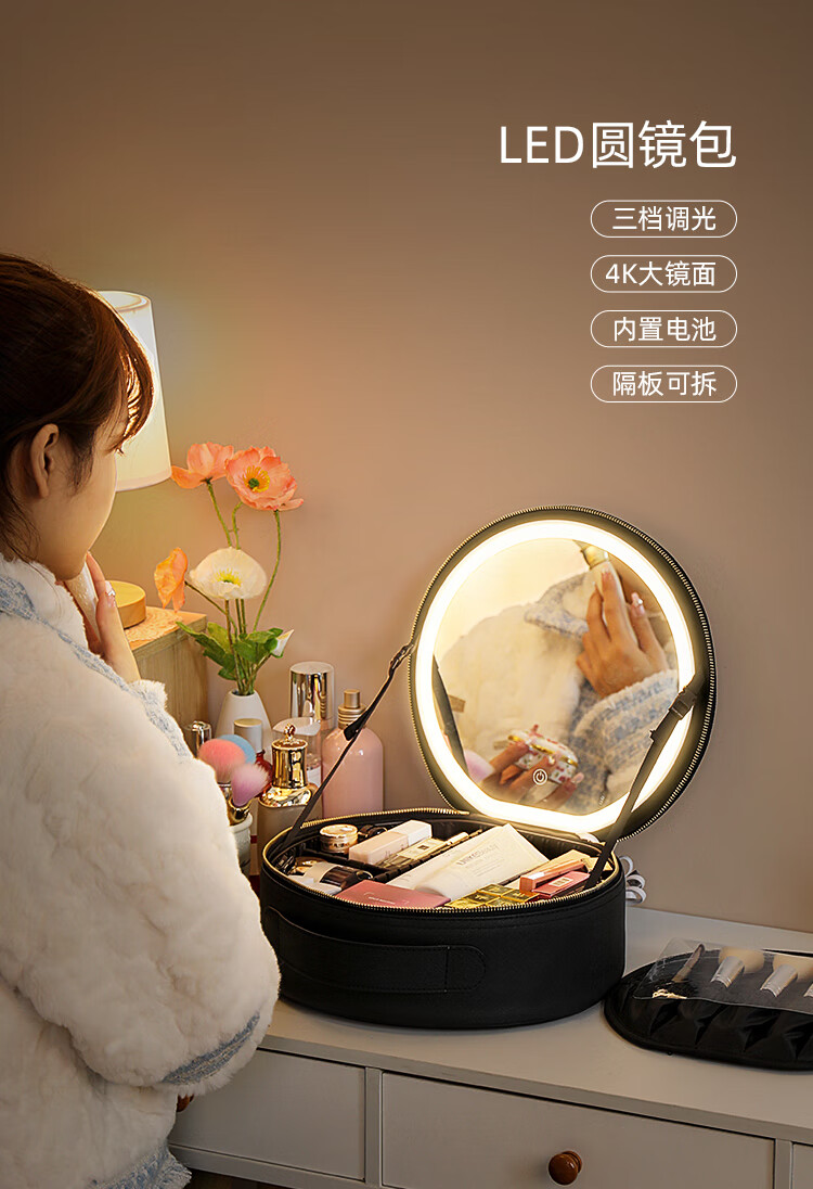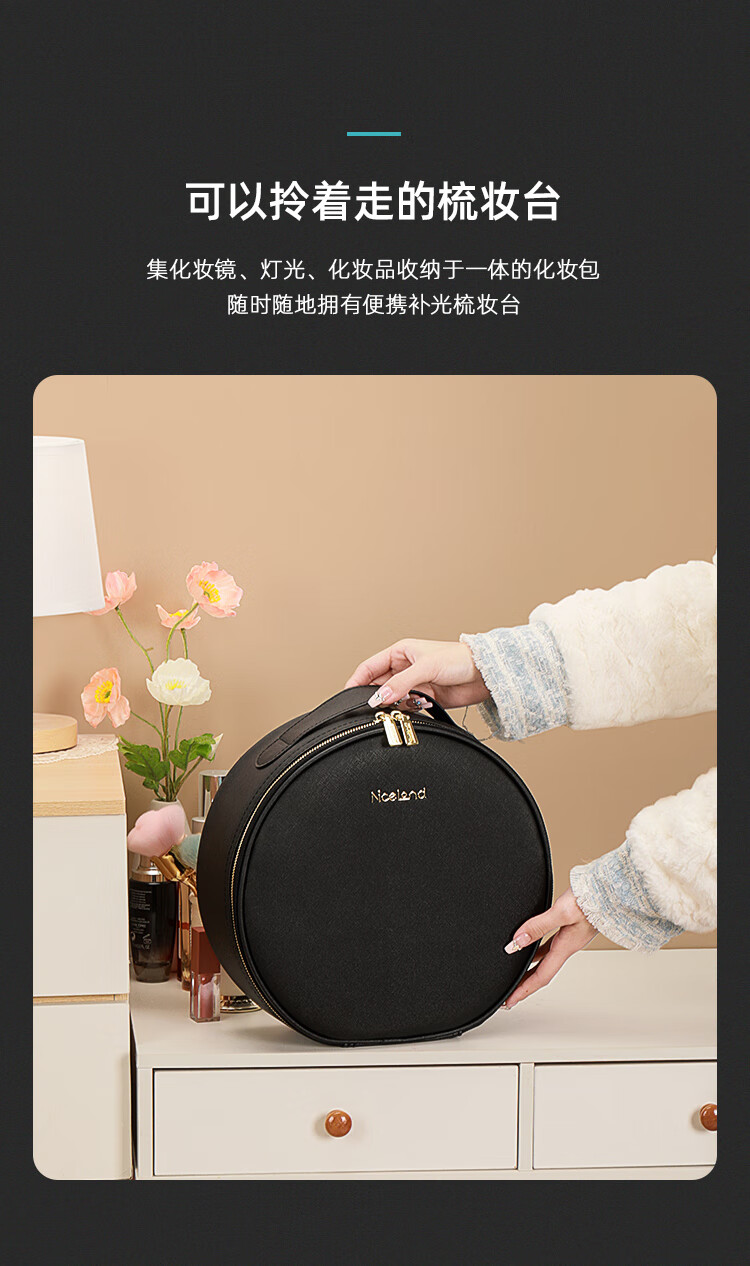 NiceLand cosmetics bag with LED light, round mirror cosmetics storage bag, large capacity, portable hand strap, battery, black