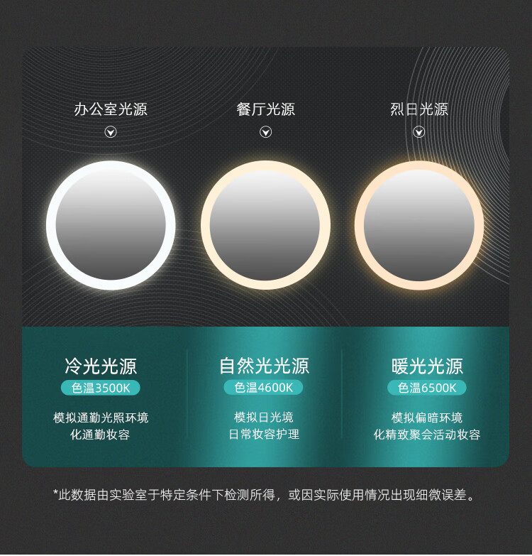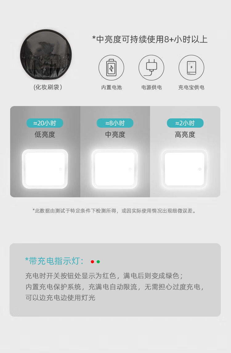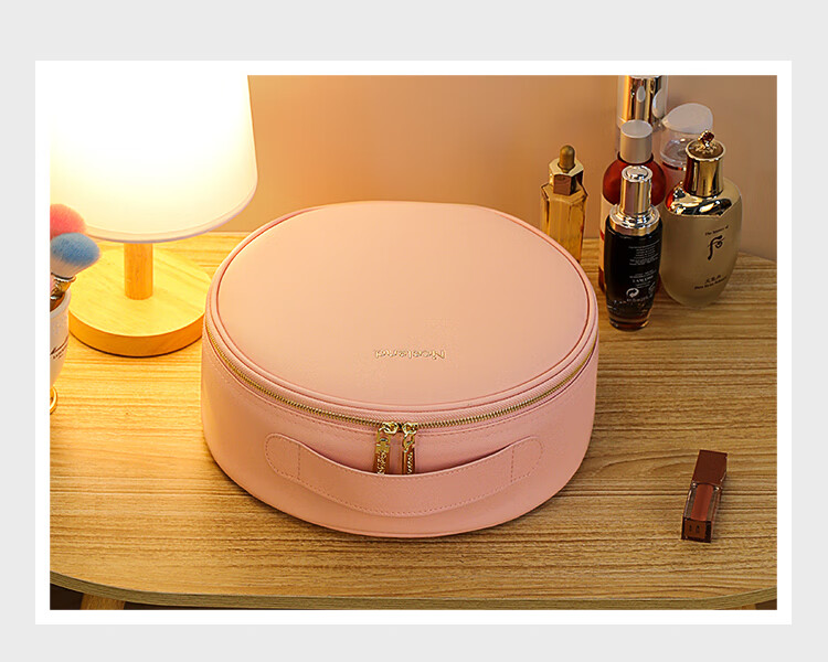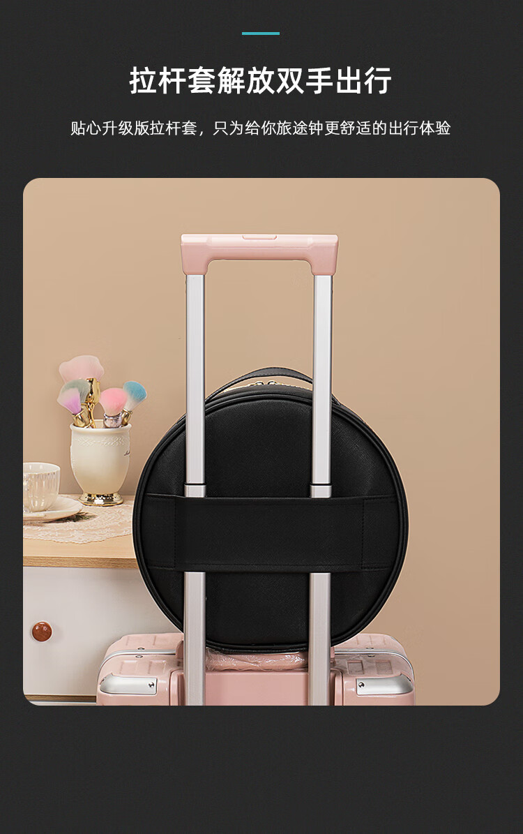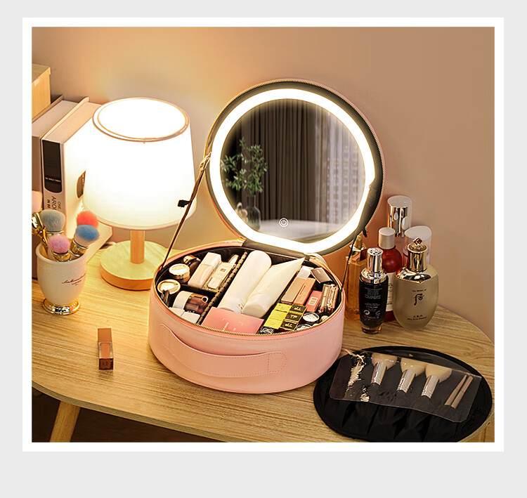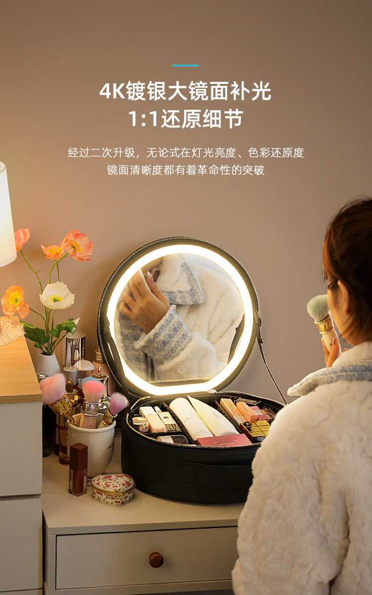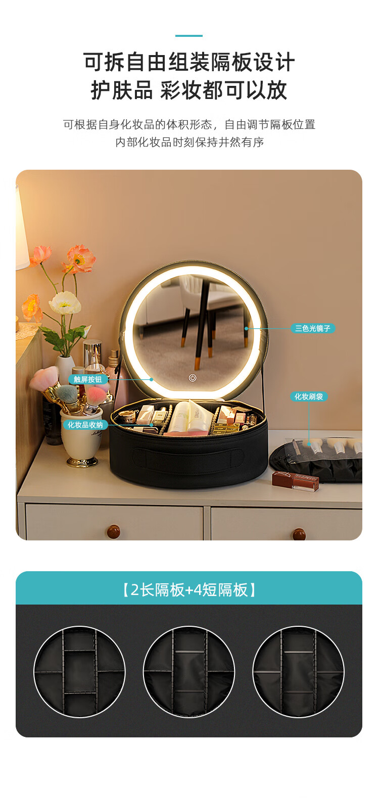 NiceLand cosmetics bag with LED light, round mirror cosmetics storage bag, large capacity, portable hand strap, battery, black
