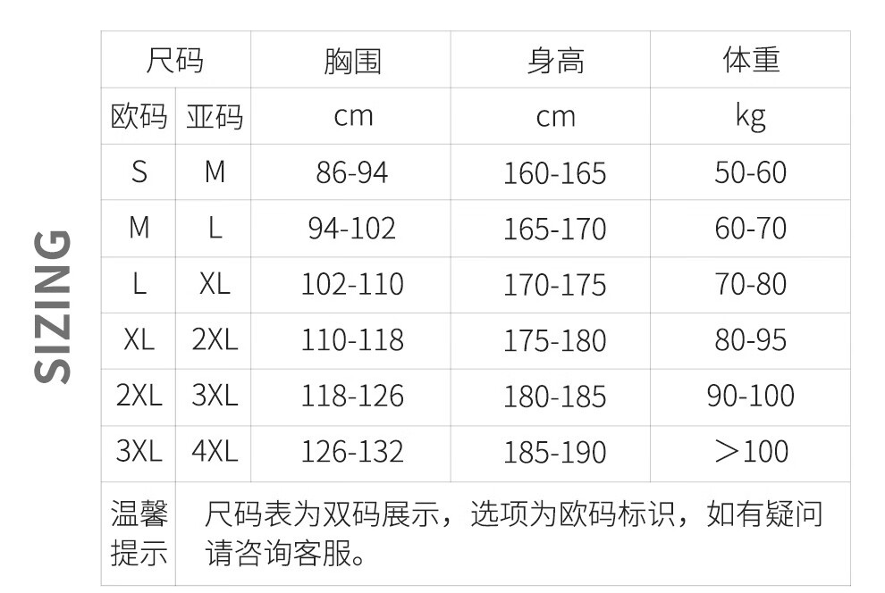 China (cm) 165 / 88-90 170 / 96-98 175 / 108-110 180 / 118-122 185 / 126-130