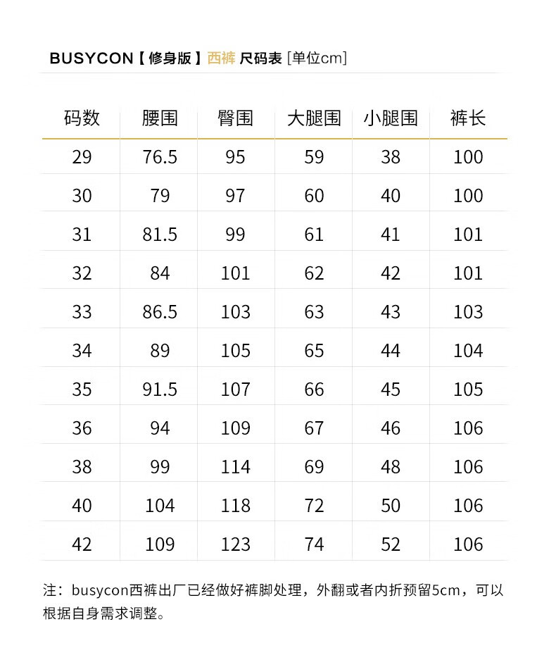 Outseam (cm) 99 cm 101.5 cm 104 cm 106.5 cm 109 cm