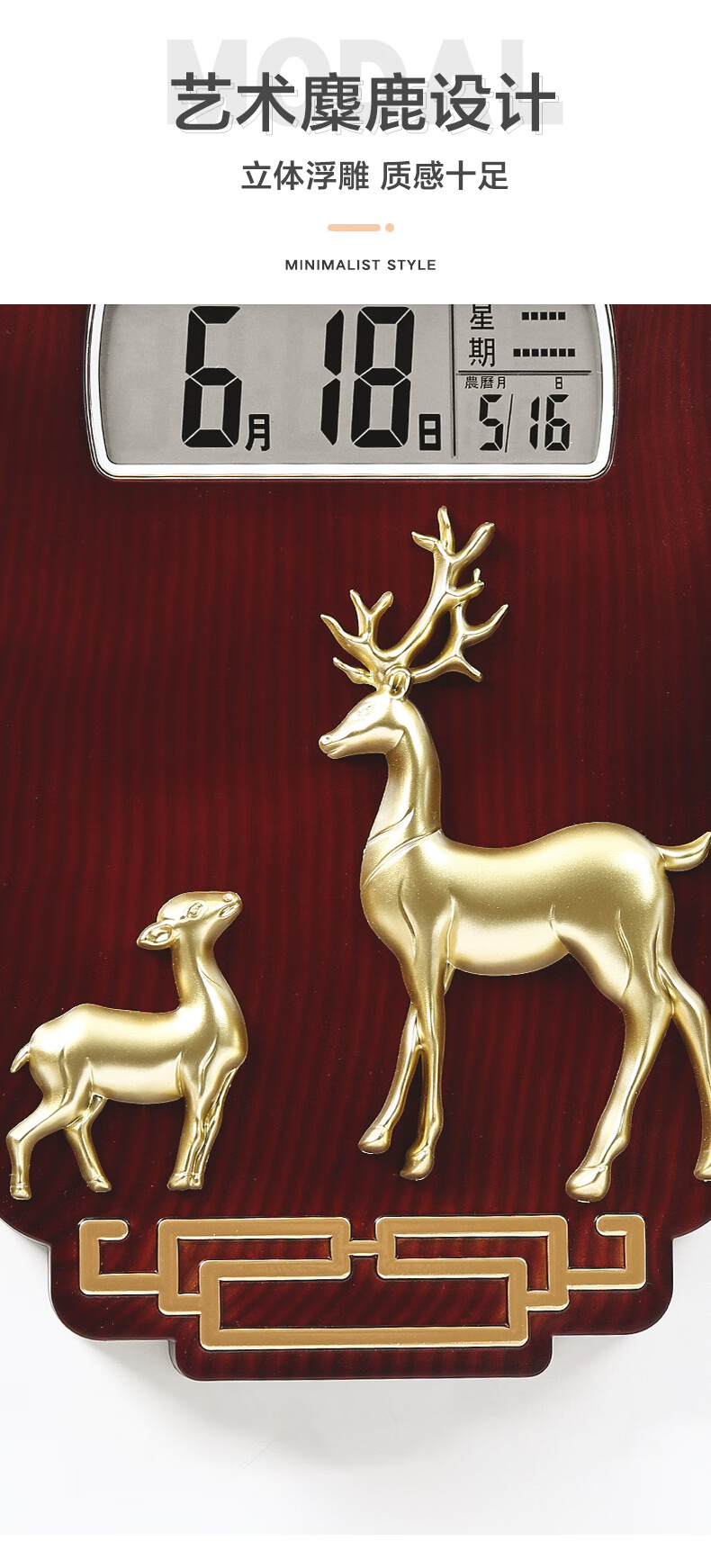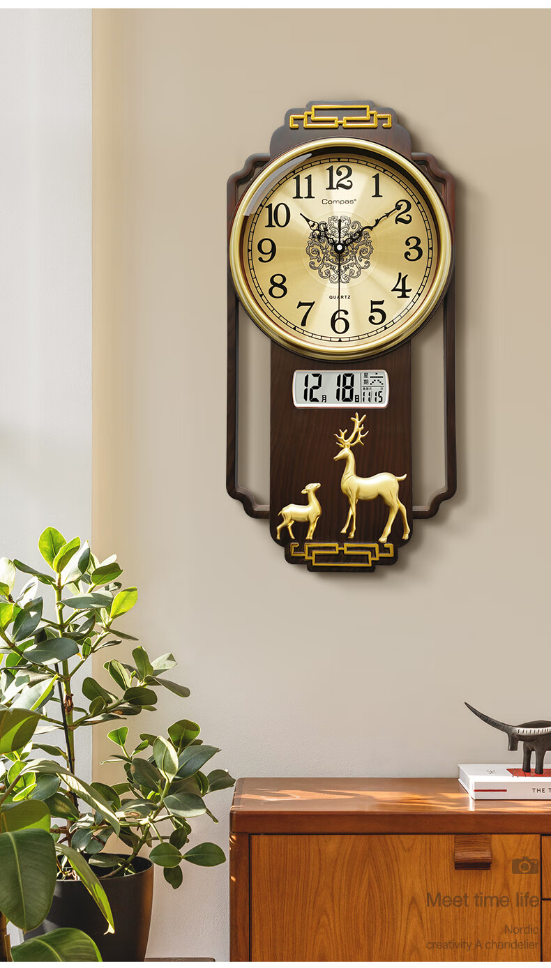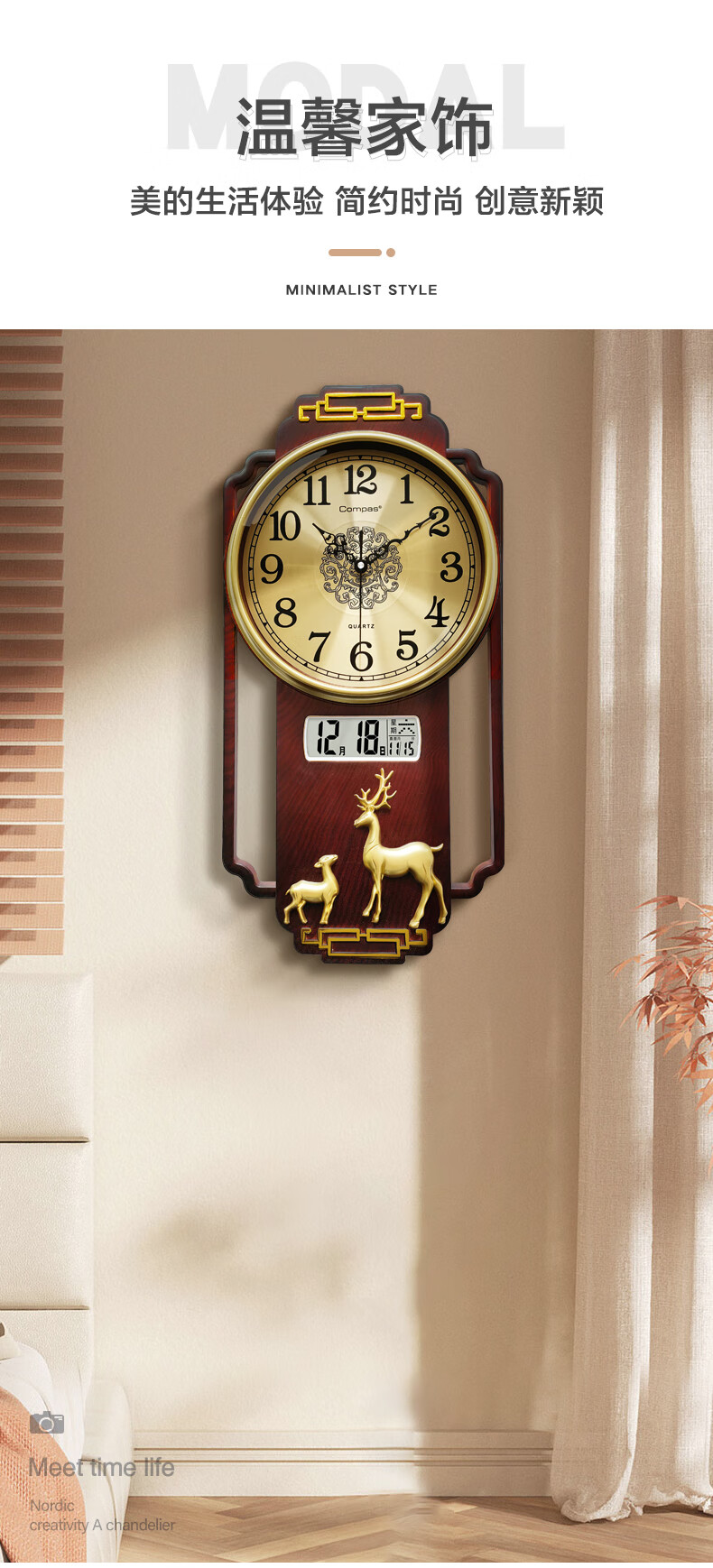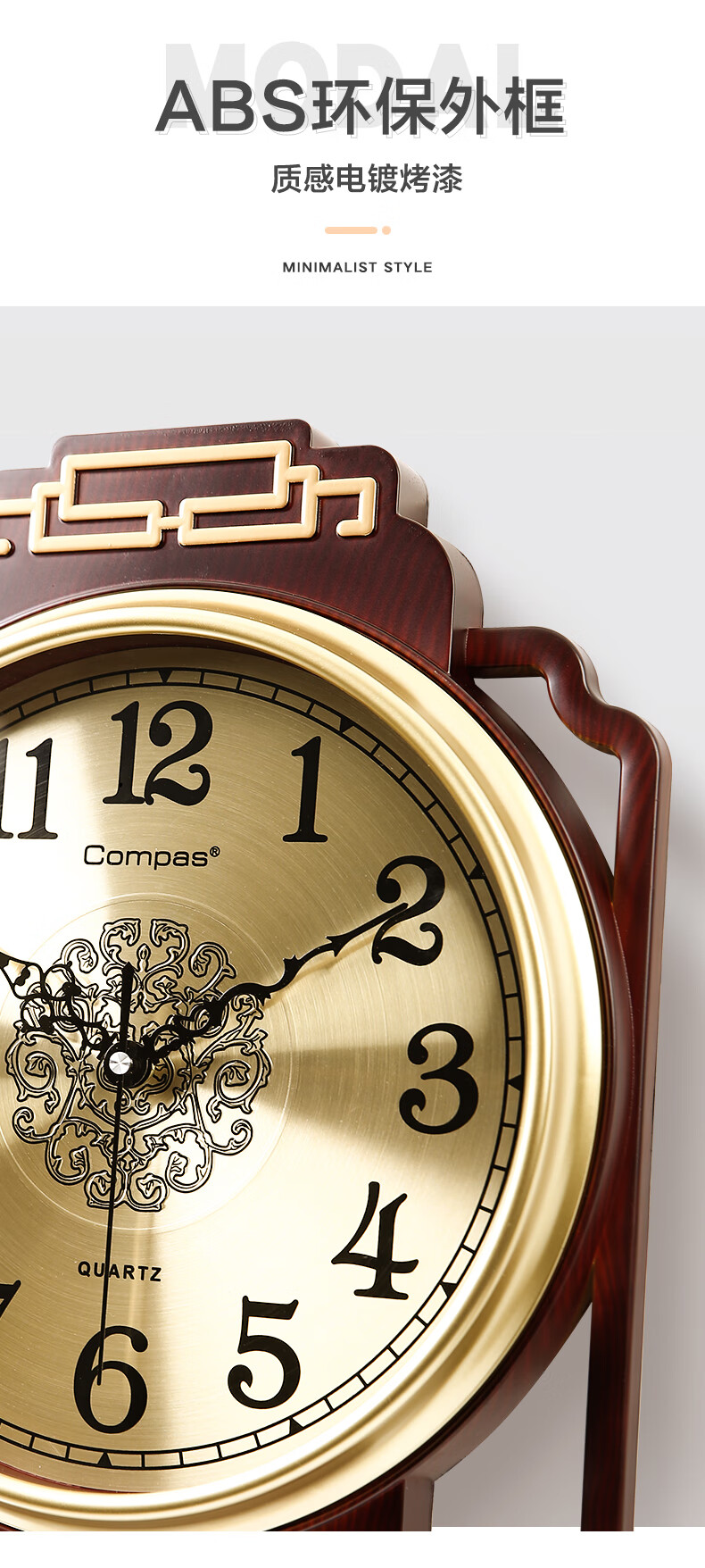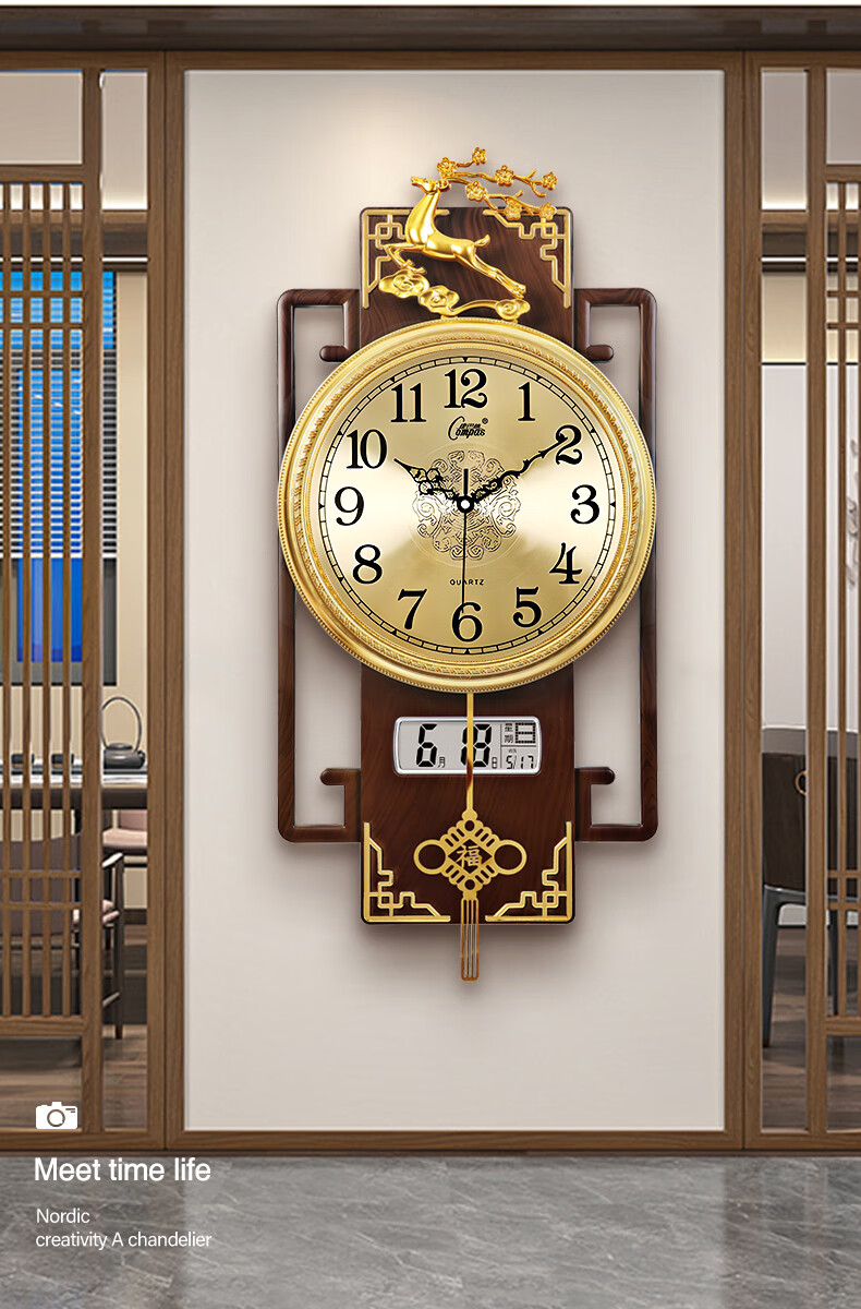 Compas new Chinese style light luxury calendar wall clock 2025 new home fashion clock living room clock wall hanging high-end atmosphere Fulu red wood grain (AI intelligent automatic time setting)