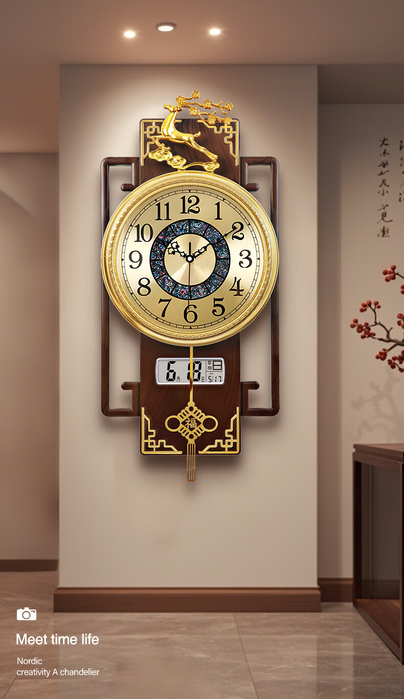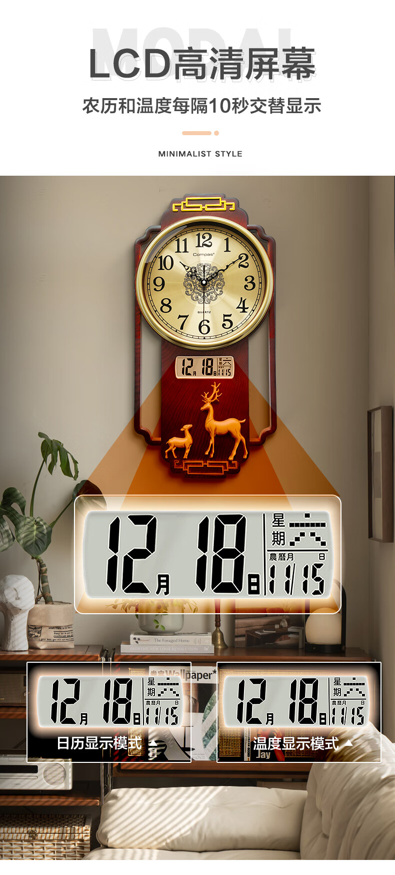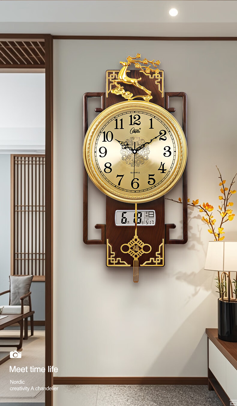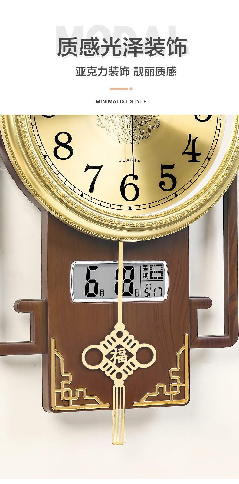 Compas new Chinese style light luxury calendar wall clock 2025 new home fashion clock living room clock wall hanging high-end atmosphere Fulu red wood grain (AI intelligent automatic time setting)