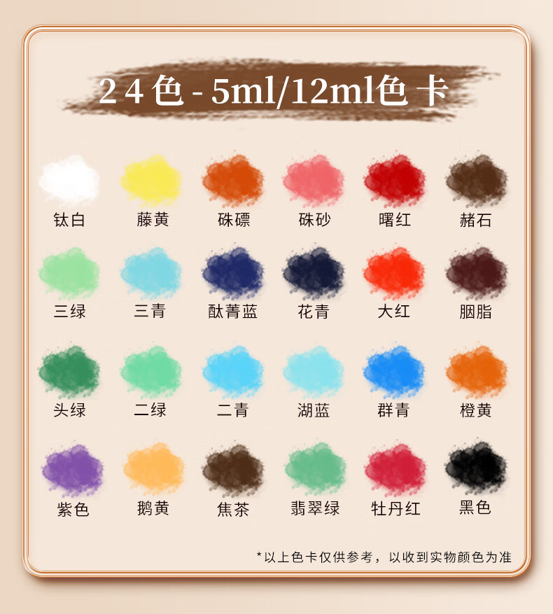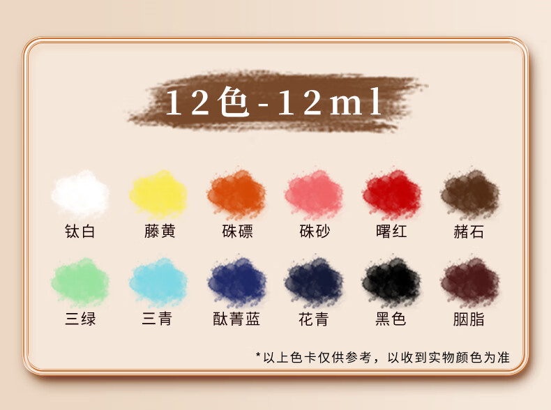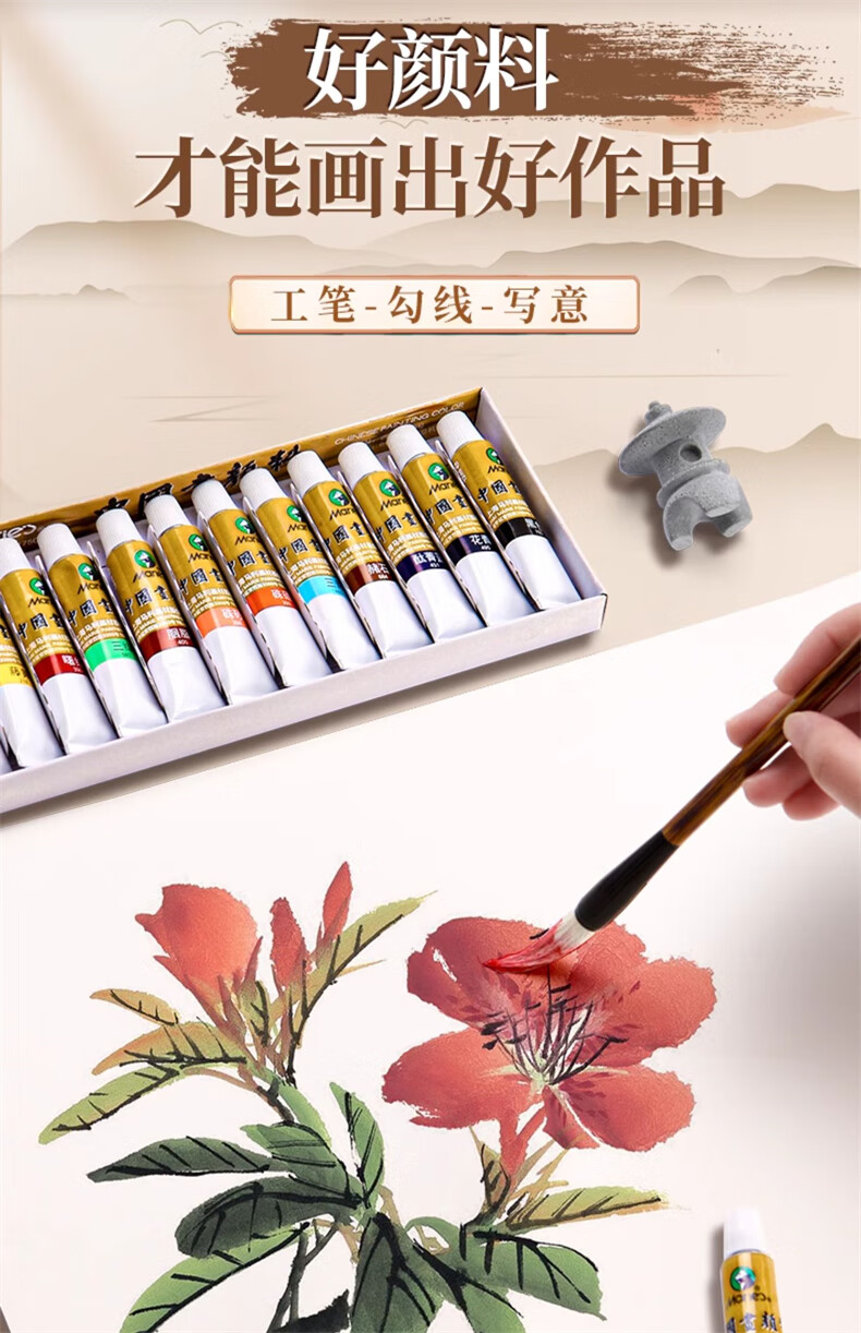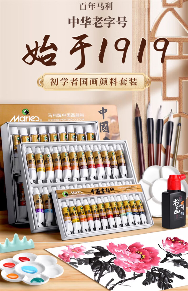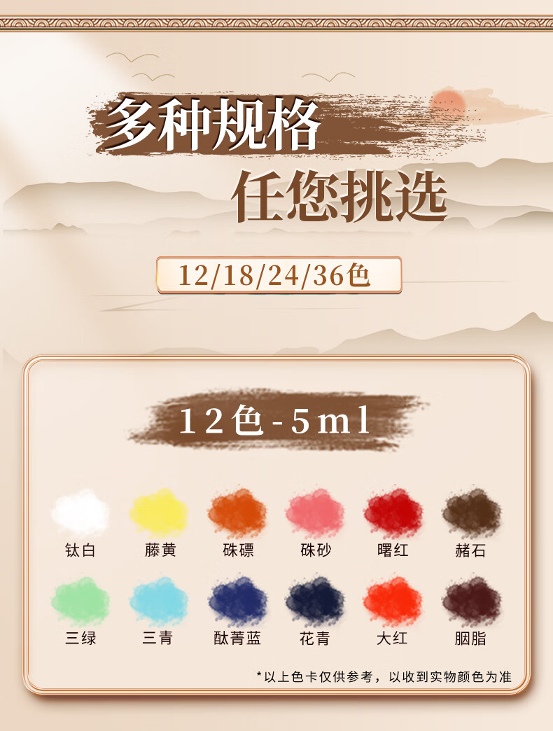 Marie s Chinese painting pigments, 24 colors of Chinese painting pigments for ink painting, introductory brush set for beginners, brush, rice paper and ink entry-level painting art tool set, 12 colors, 5ml, single box of paint + 1 brush, official standard configuration