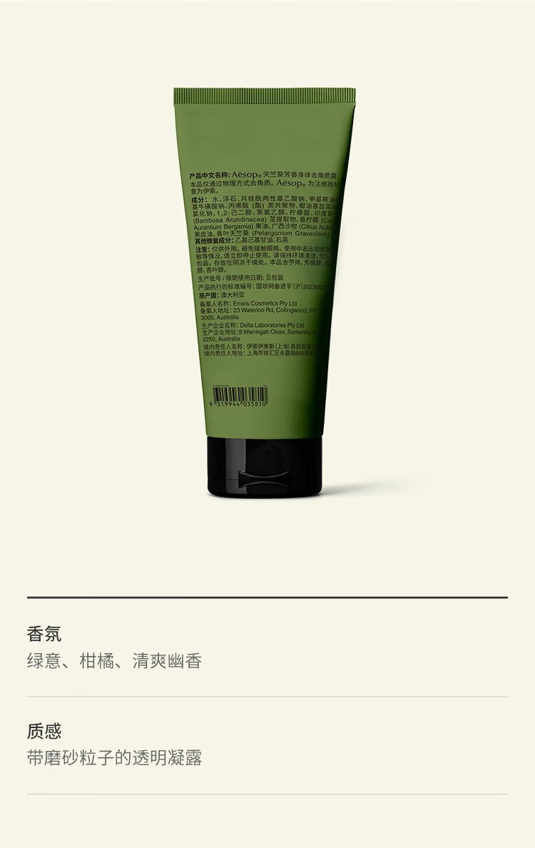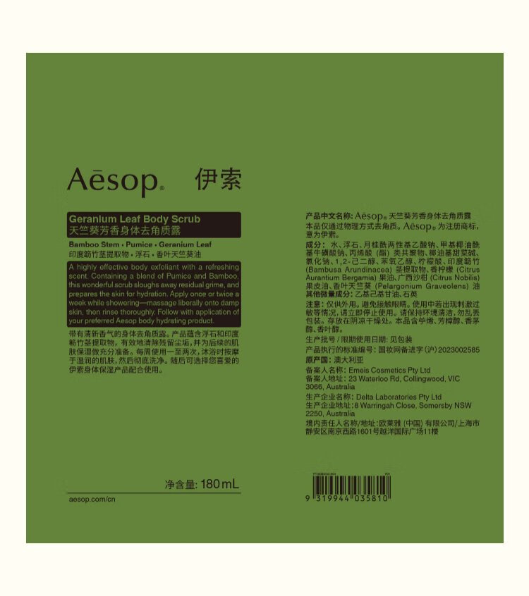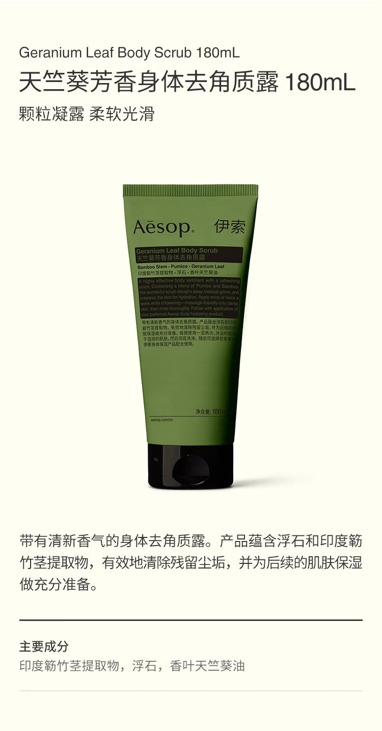 Aesop Geranium Aroma Body Scrub 180mL Bath Salt Scrub Double 11 Birthday Gift for Men and Women