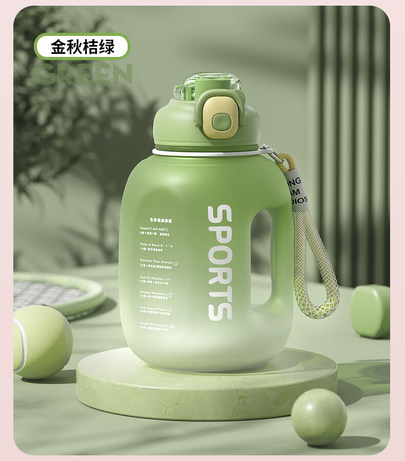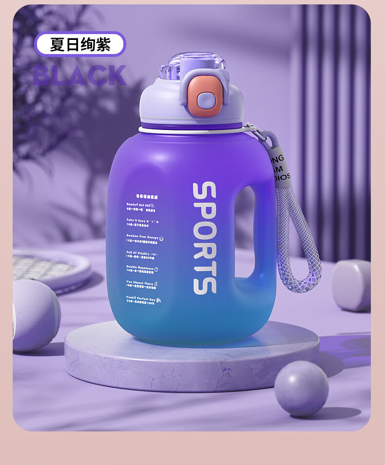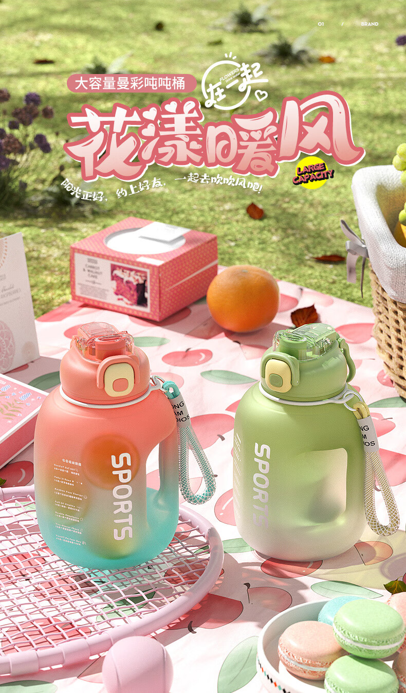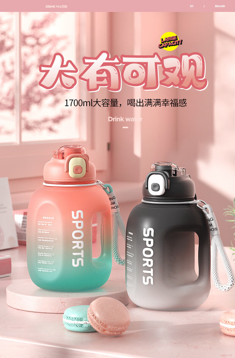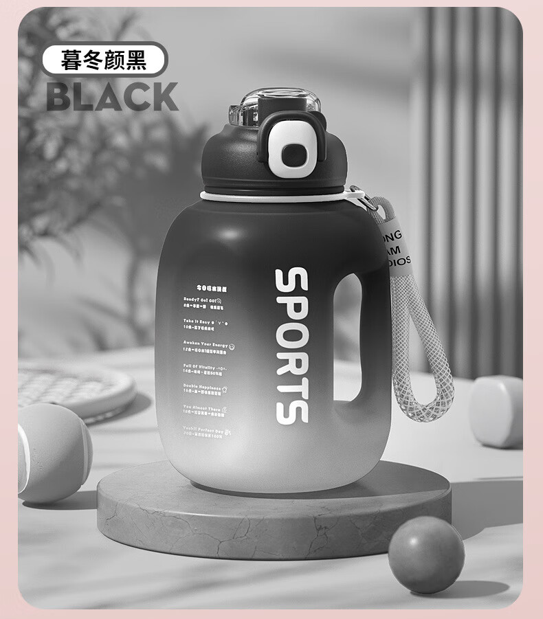 WINTERPALACE ton barrel sports water bottle large capacity plastic cup for men and women with big belly straw outdoor fitness ton pier space cup Mu Dongyan black 1700ml ton barrel