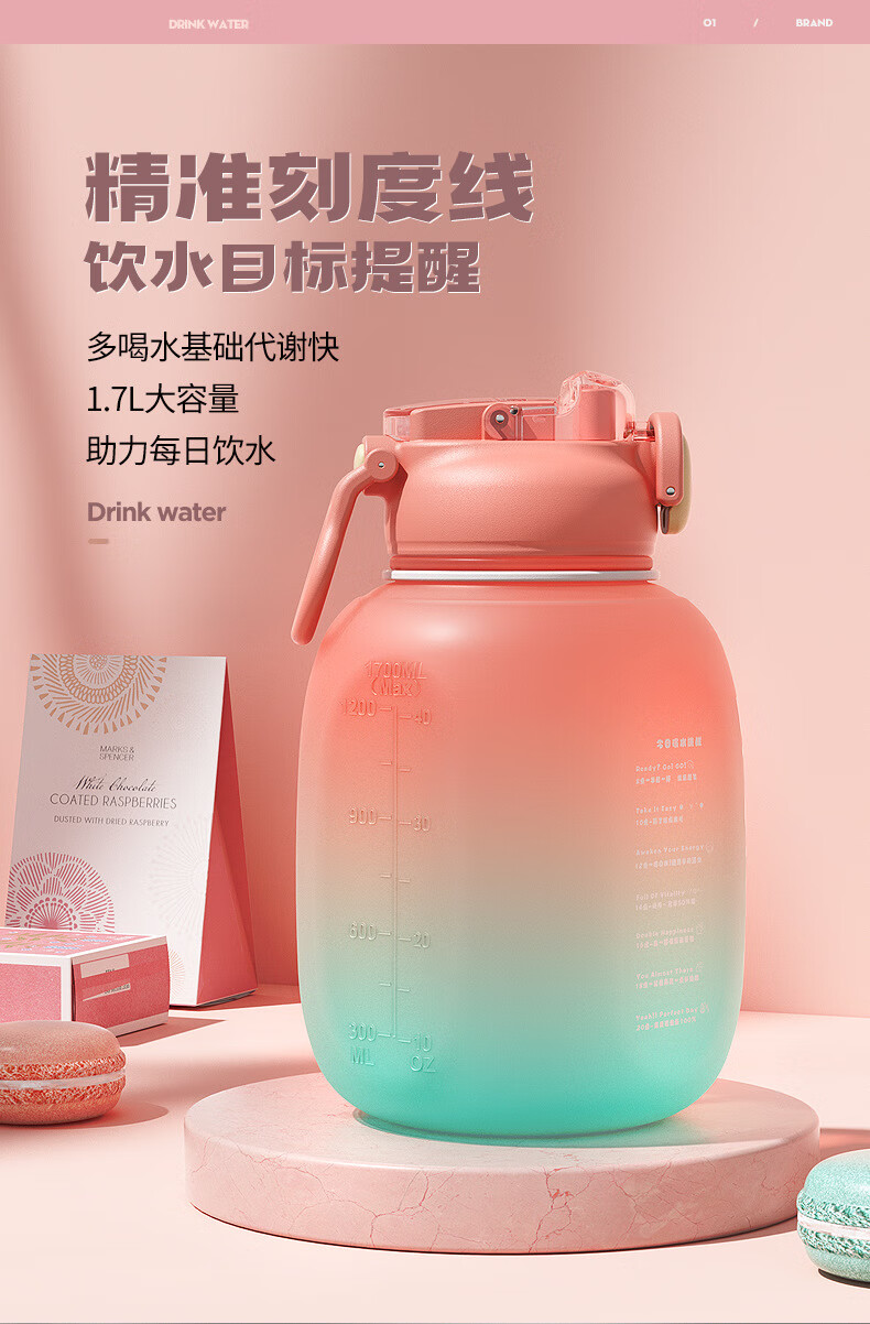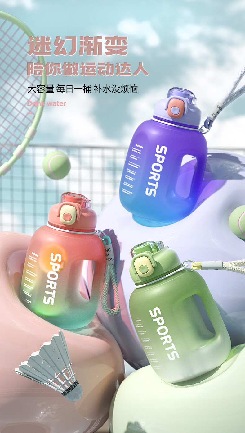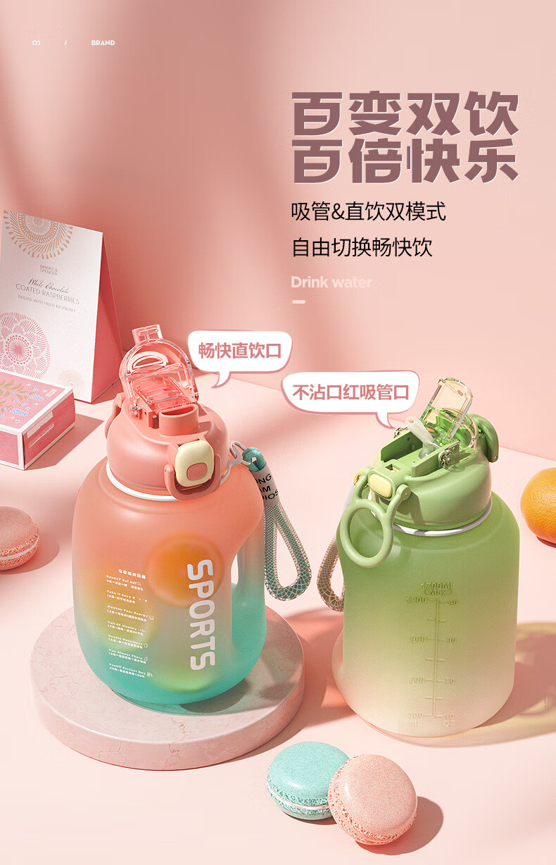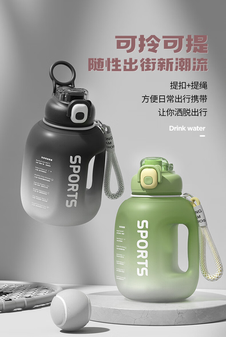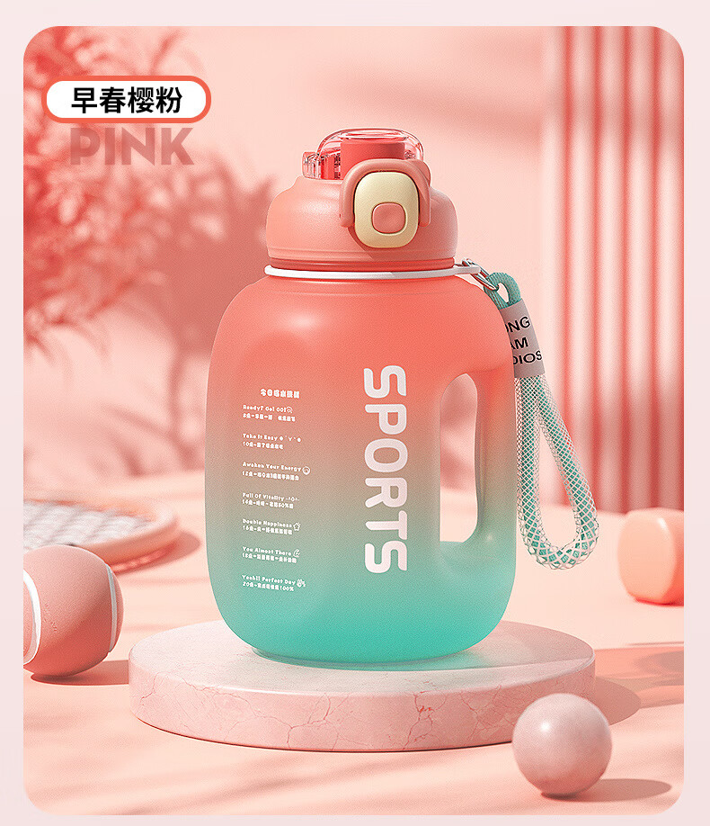 WINTERPALACE ton barrel sports water bottle large capacity plastic cup for men and women with big belly straw outdoor fitness ton pier space cup Mu Dongyan black 1700ml ton barrel