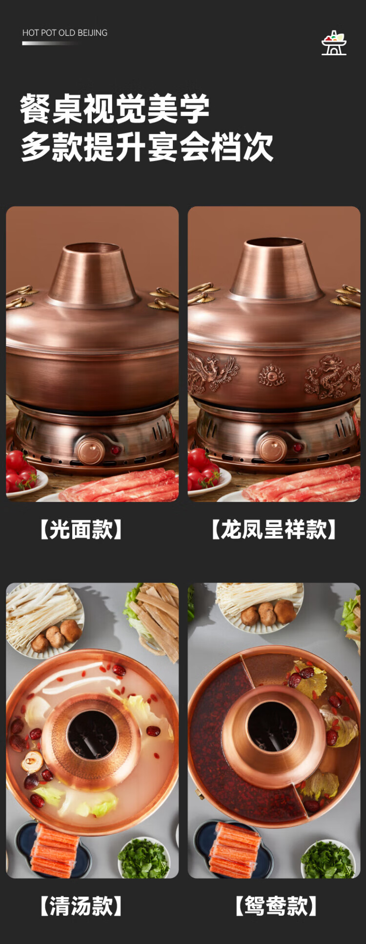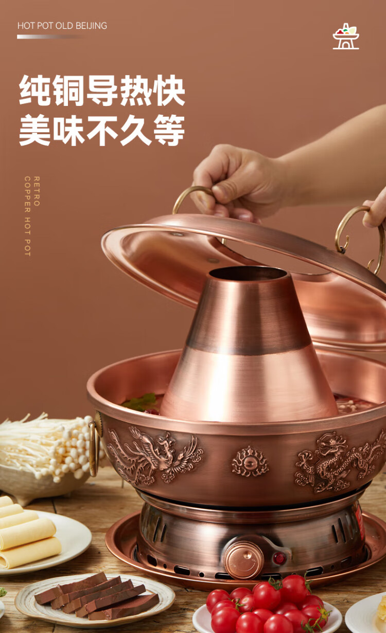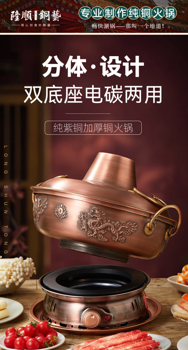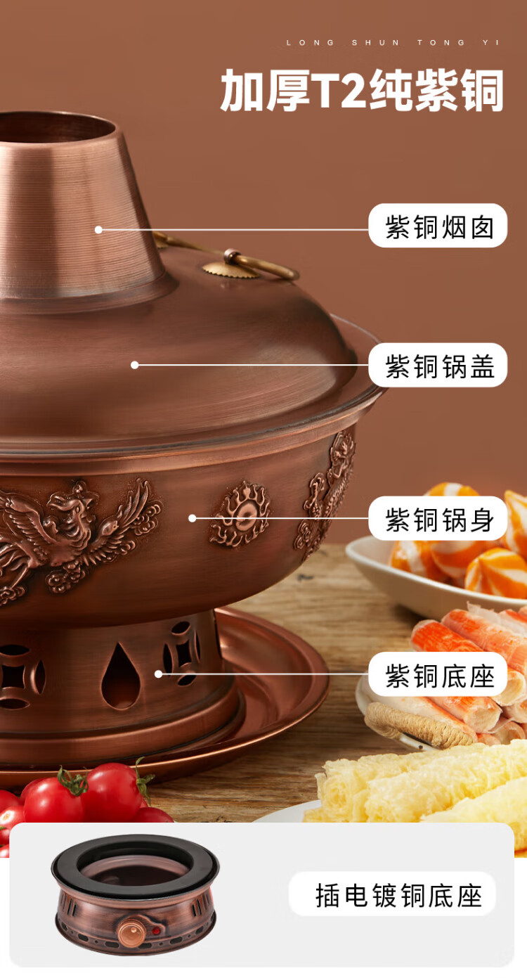 Longshun Copper Art Copper Hot Pot Carbon and Electric Dual-Purpose Split Pure Copper Thickened Copper Pot Hot Pot Pot Old Beijing Shabu Shabu Plug-in Hot Pot 6-8 People Smooth Style 34cm Clear Soup Pot