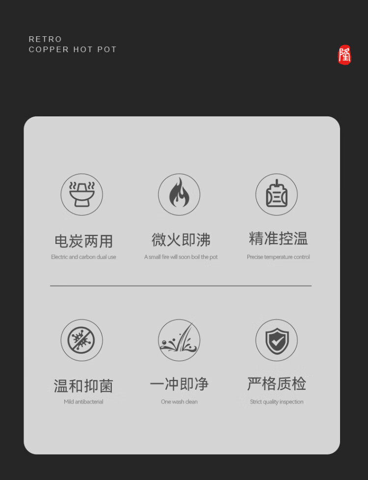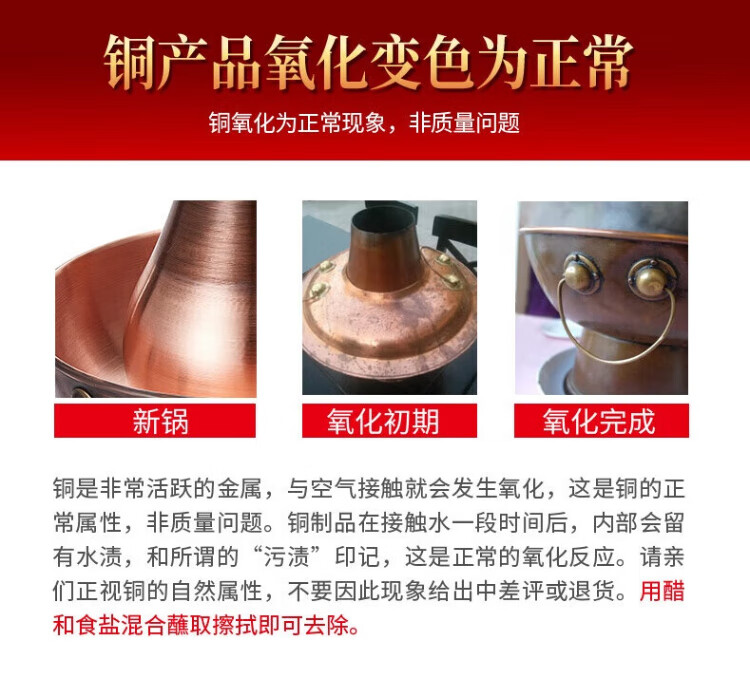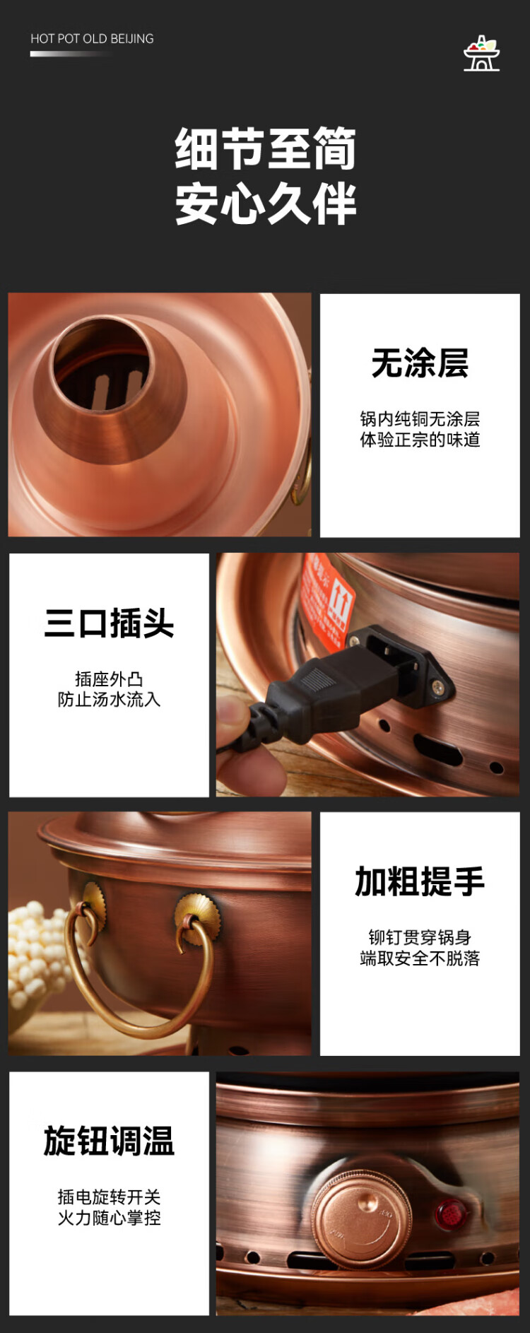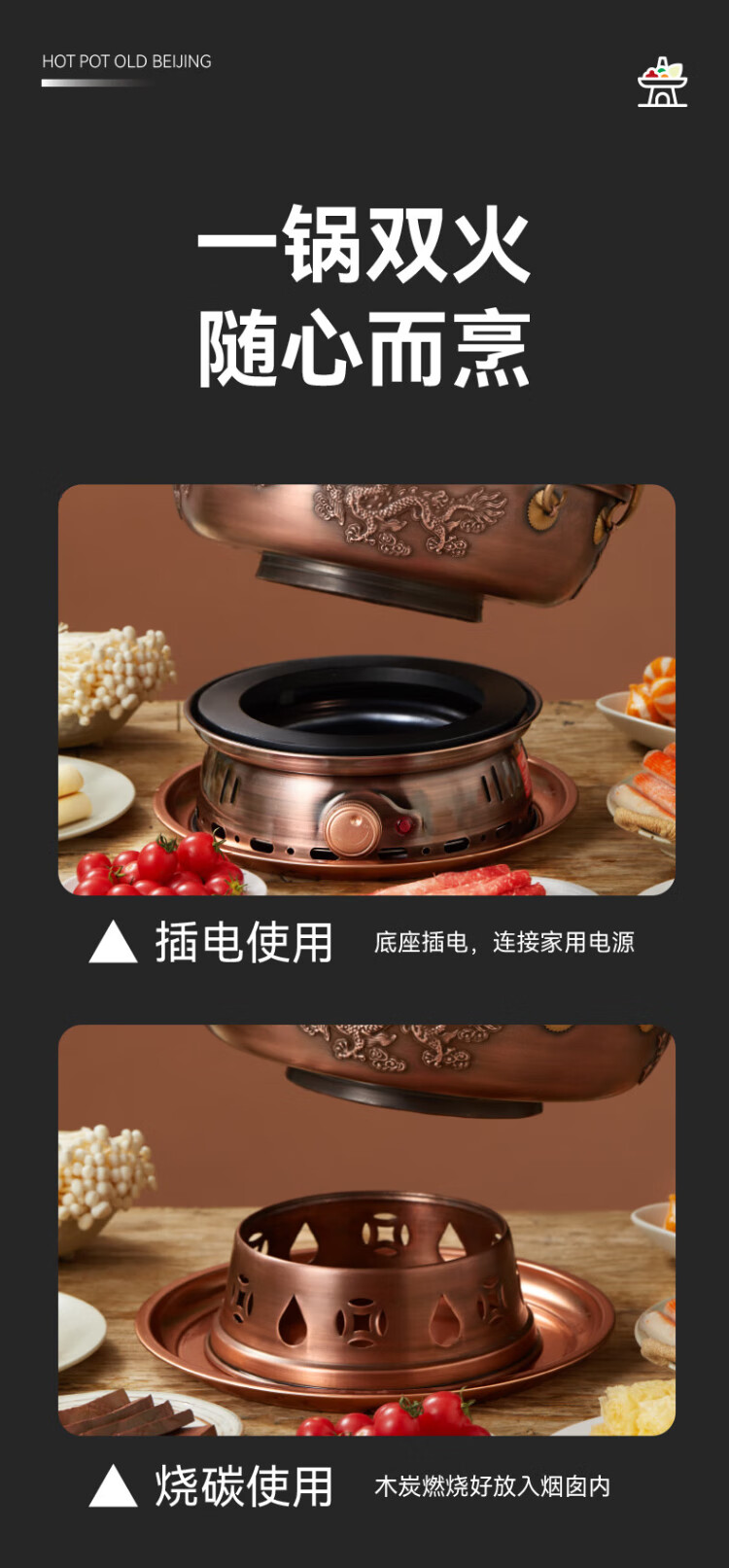 Longshun Copper Art Copper Hot Pot Carbon and Electric Dual-Purpose Split Pure Copper Thickened Copper Pot Hot Pot Pot Old Beijing Shabu Shabu Plug-in Hot Pot 6-8 People Smooth Style 34cm Clear Soup Pot