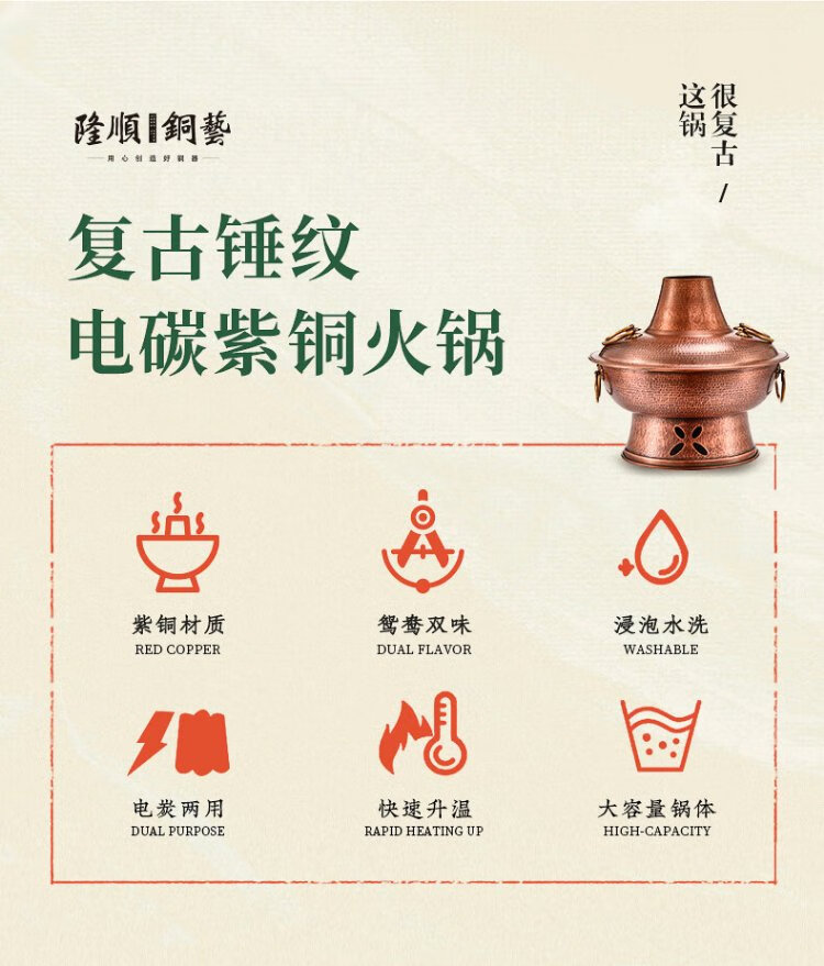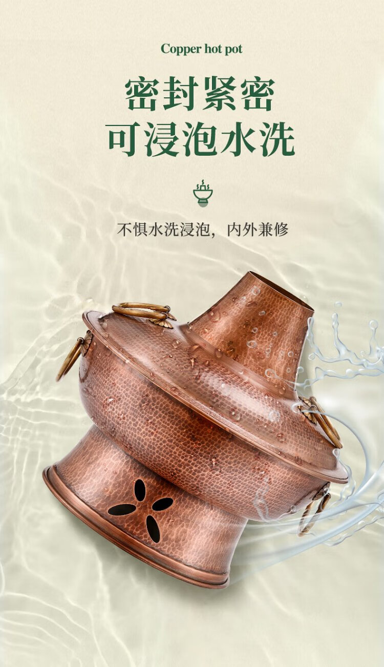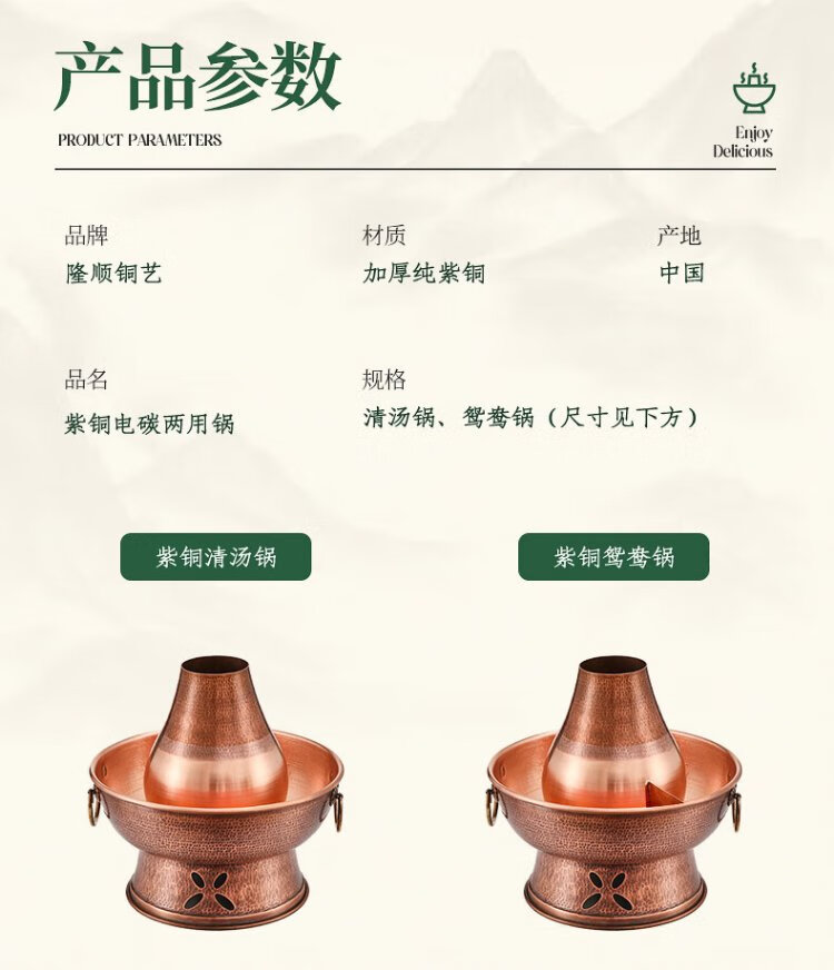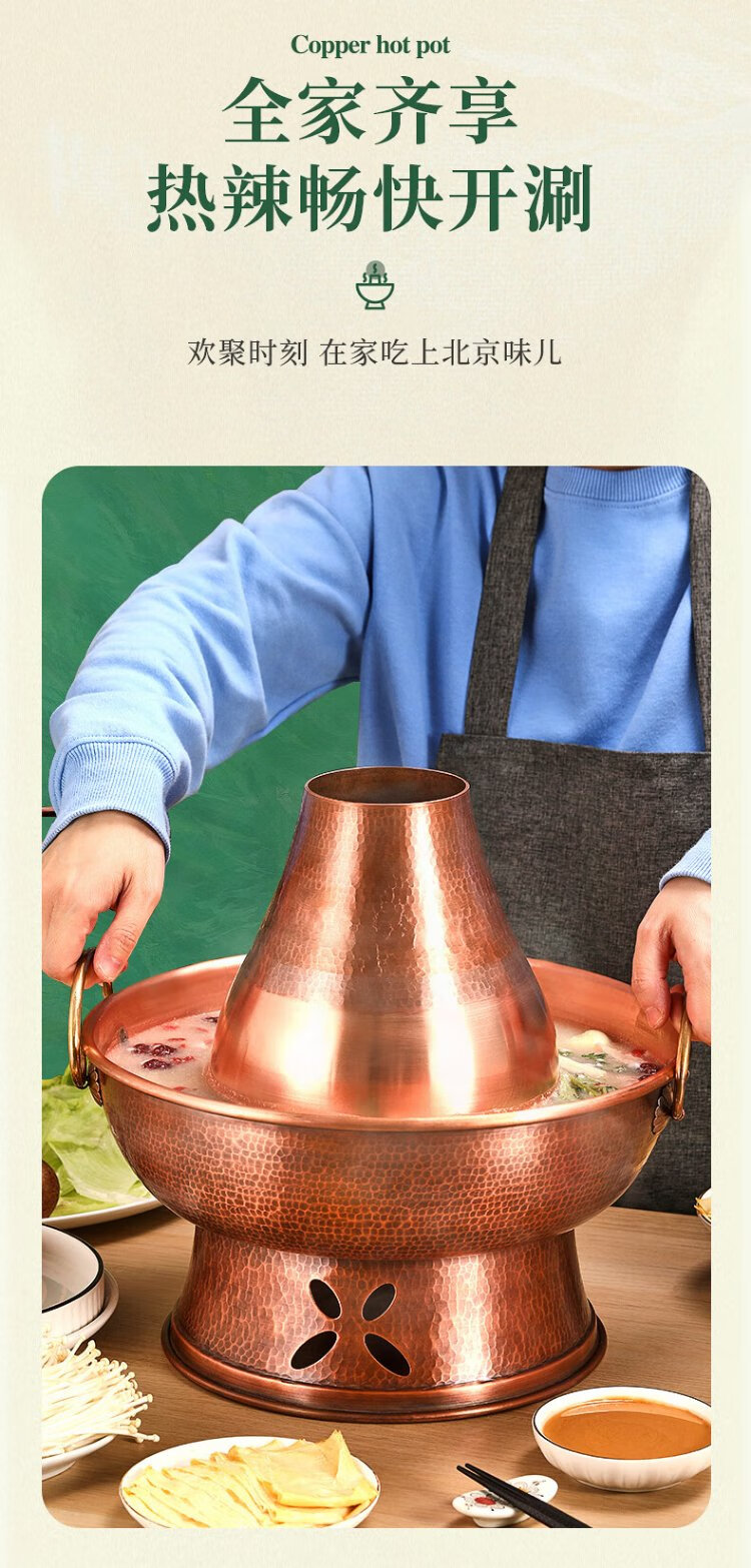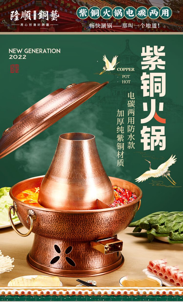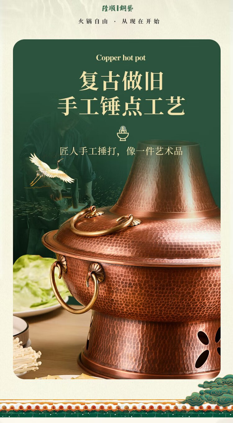 Longshun Copper Art Copper Hot Pot Pure Copper Carbon Electric Dual-Purpose Charcoal Plug-in Pure Copper Old Beijing Meat Shabu Copper Pot Hot Pot Hammer Pattern Mandarin Duck Model 8-10 People 36cm