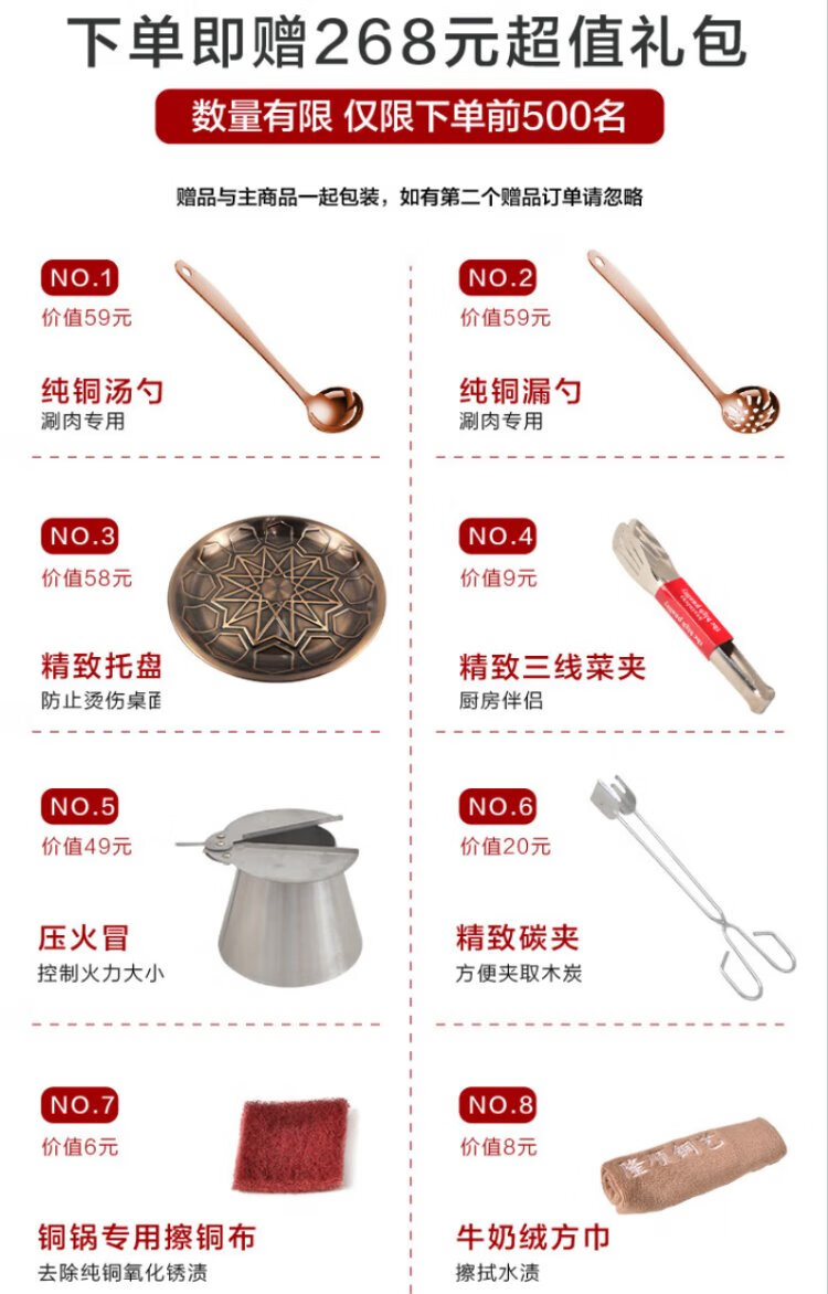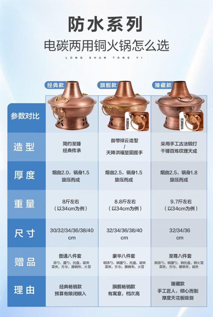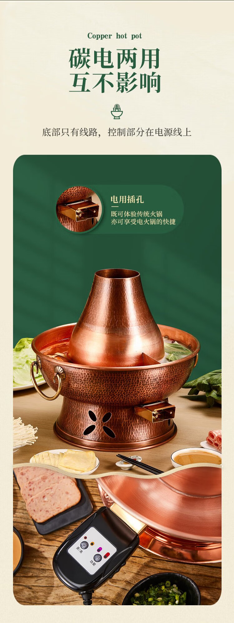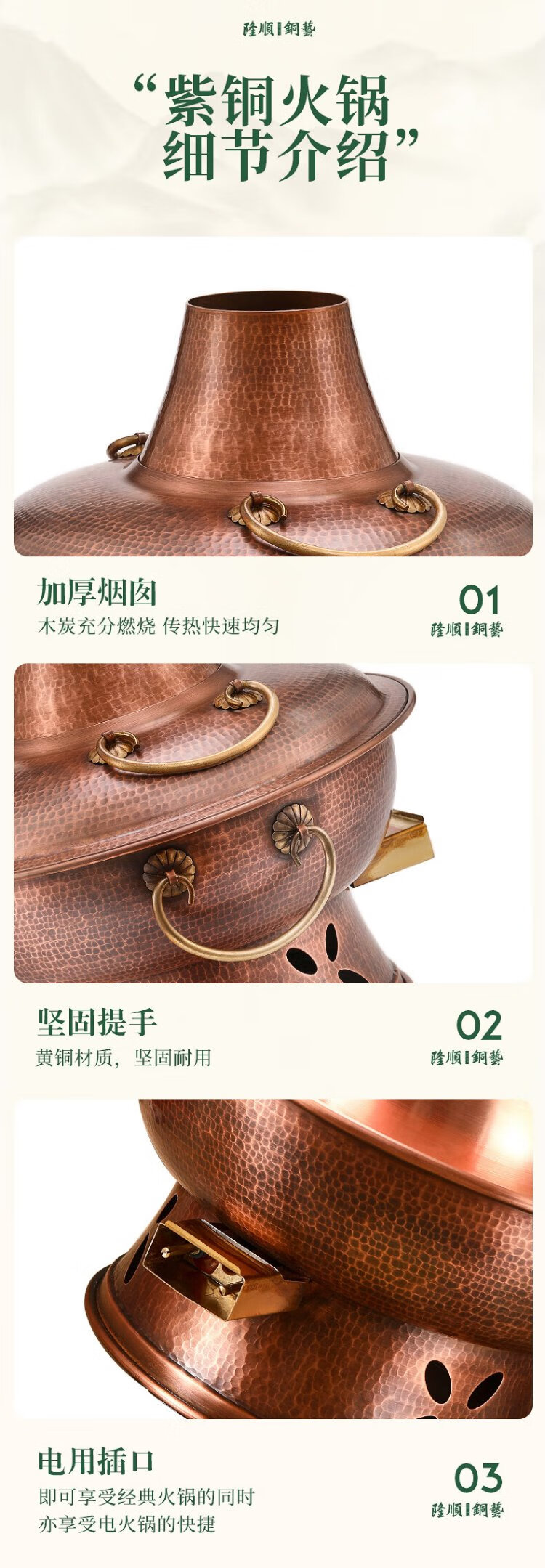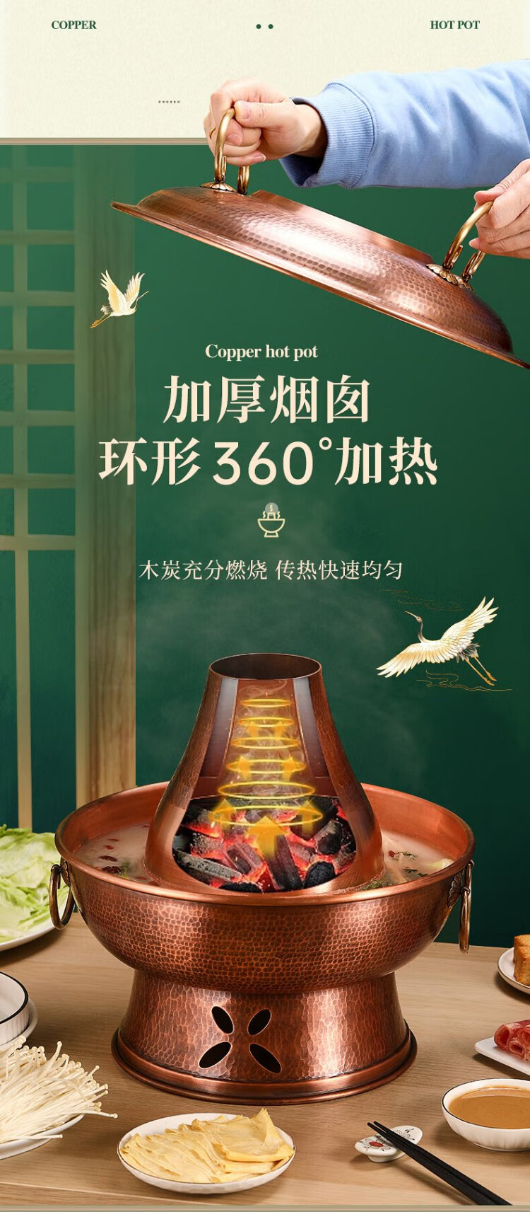 Longshun Copper Art Copper Hot Pot Pure Copper Carbon Electric Dual-Purpose Charcoal Plug-in Pure Copper Old Beijing Meat Shabu Copper Pot Hot Pot Hammer Pattern Mandarin Duck Model 8-10 People 36cm
