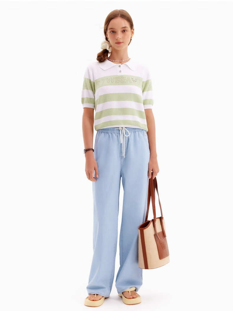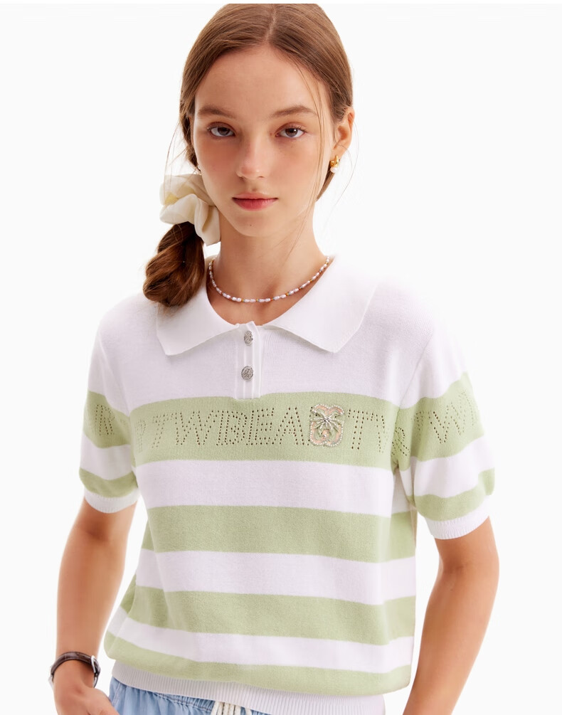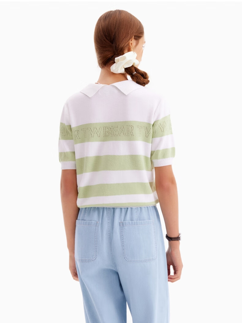 Teenie WeenieZT summer casual hollow thin comfortable striped short-sleeved sweater for women light green 155/XS