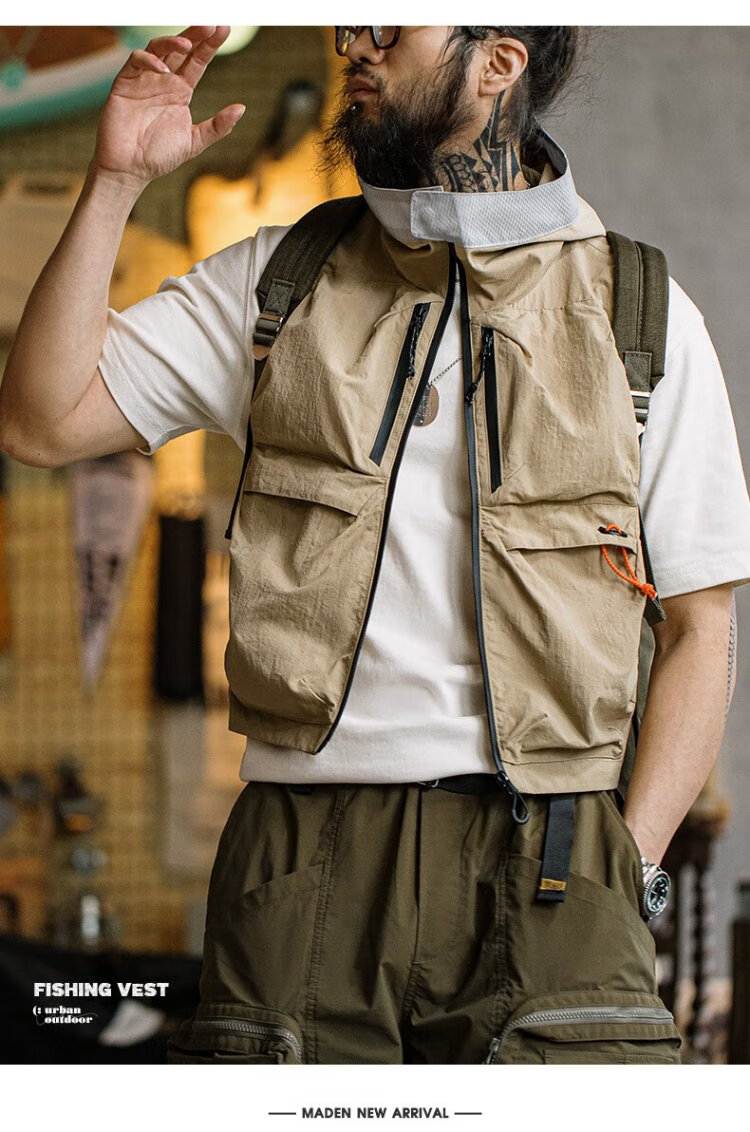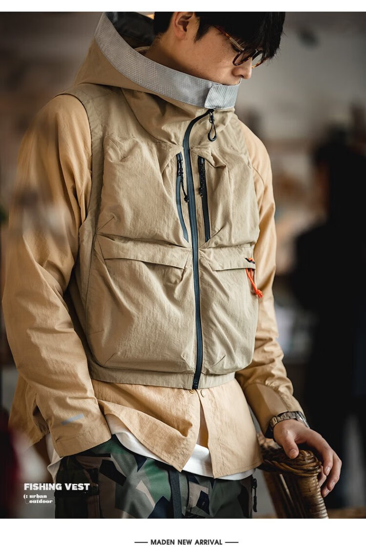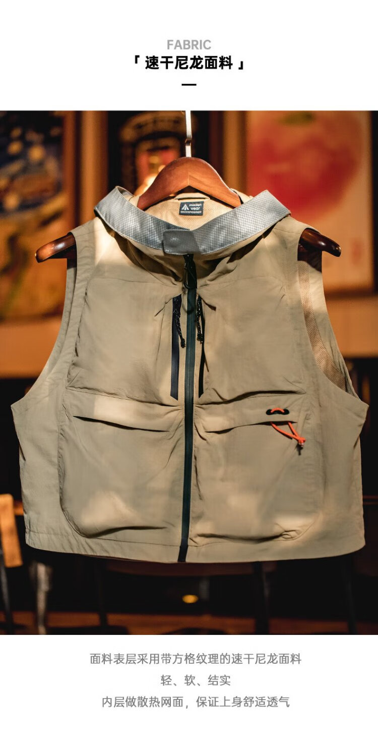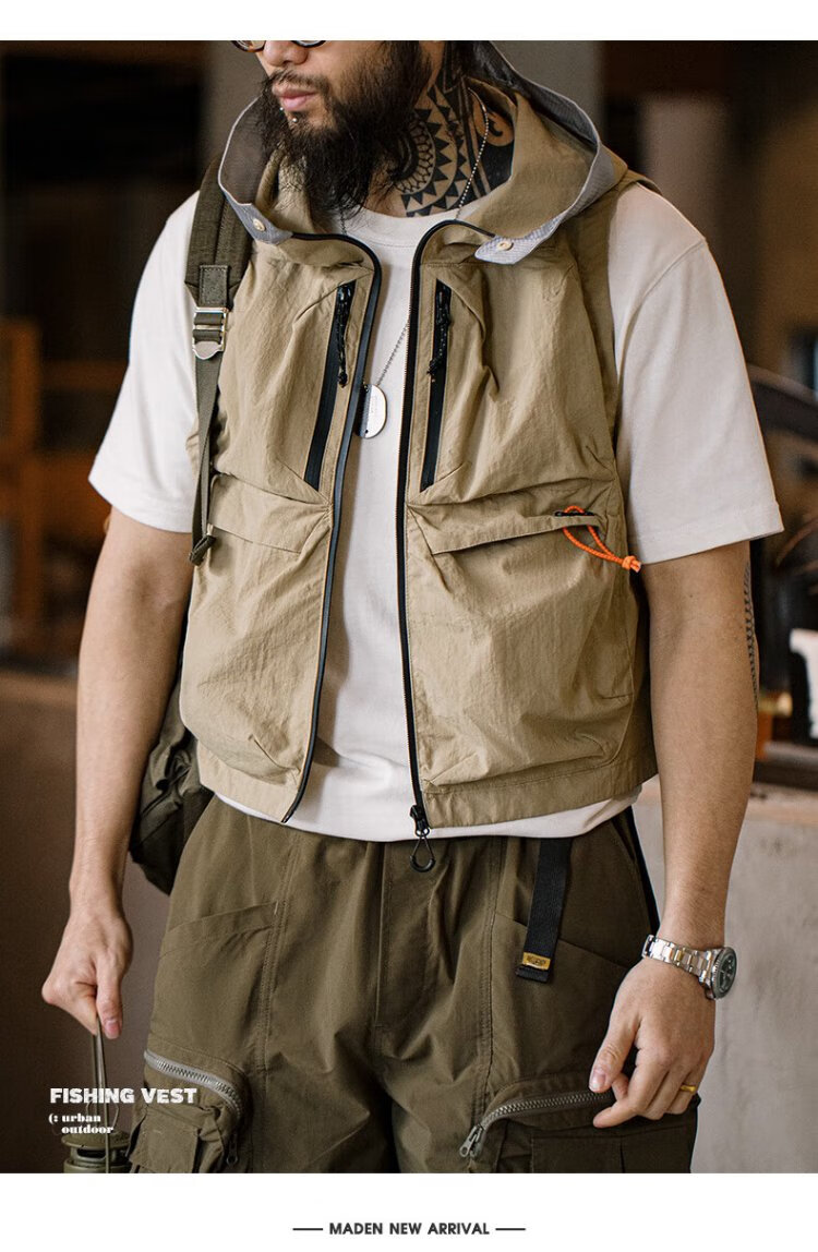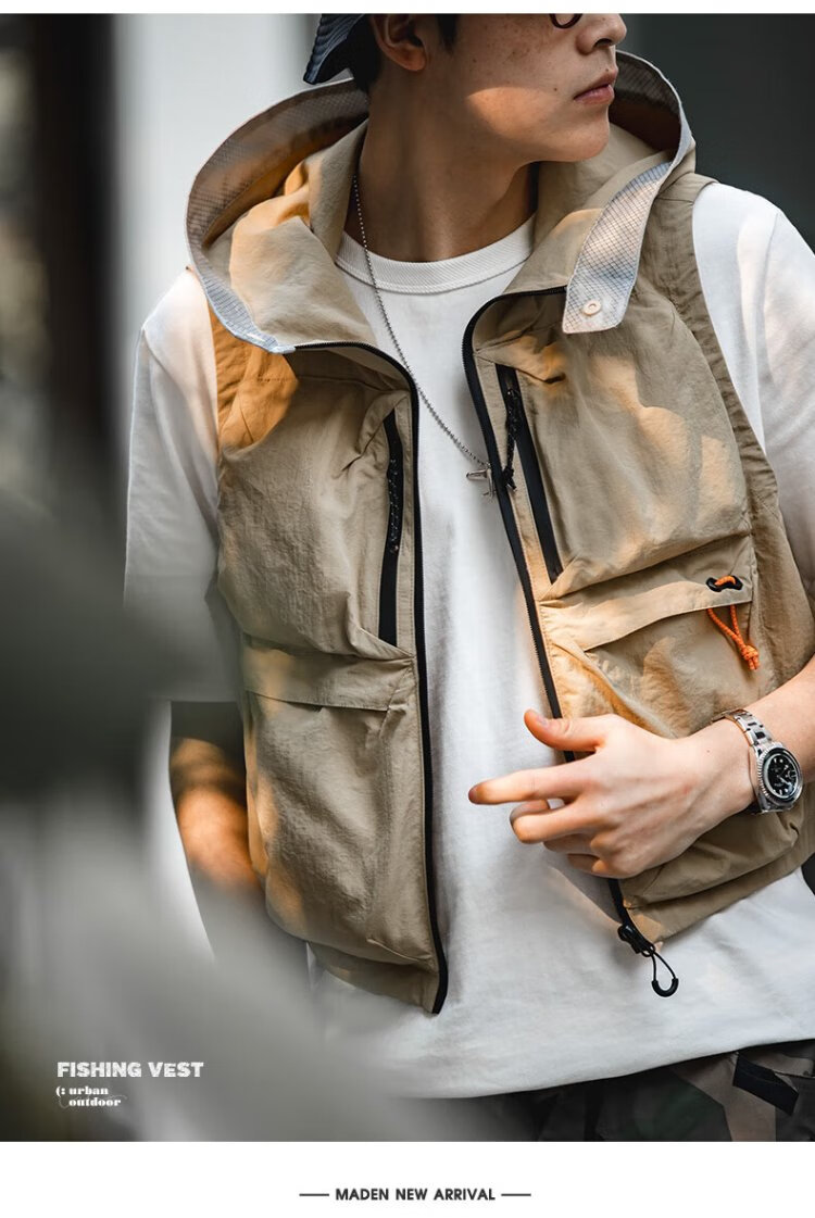 Madden Workwear Multi-pocket Hooded Vest Men's Jacket Sleeveless Outdoor Functional Wind Stacked Vest Vest Fishing Suit Khaki M