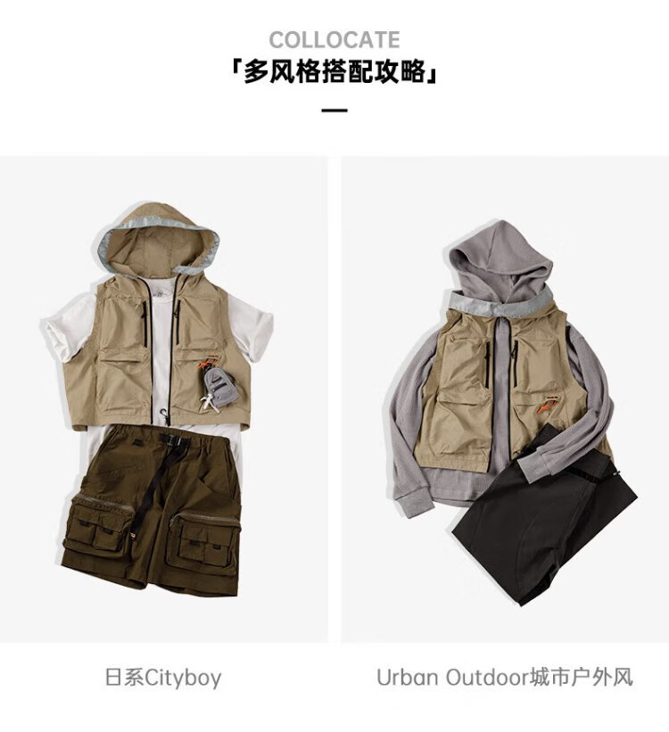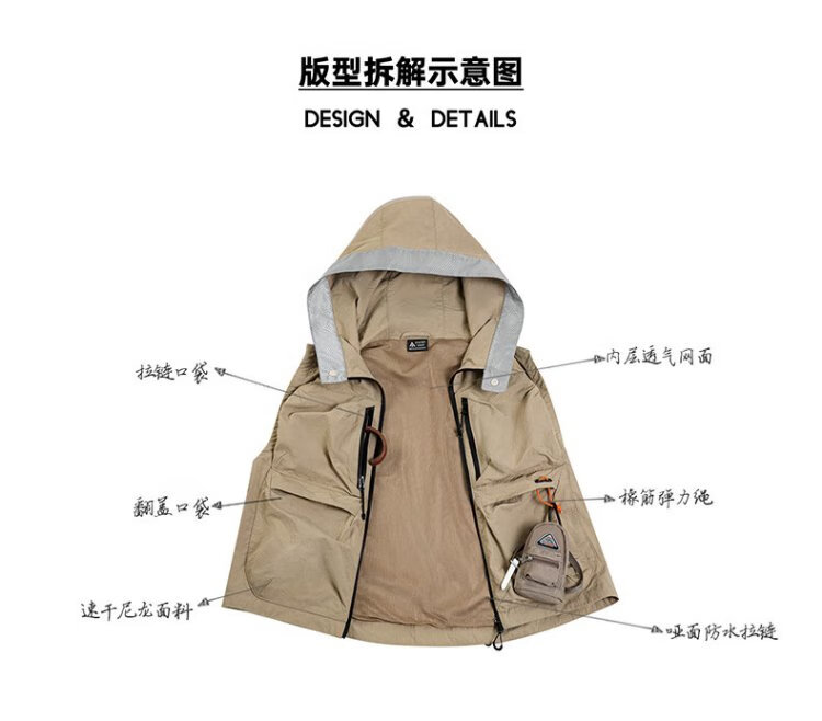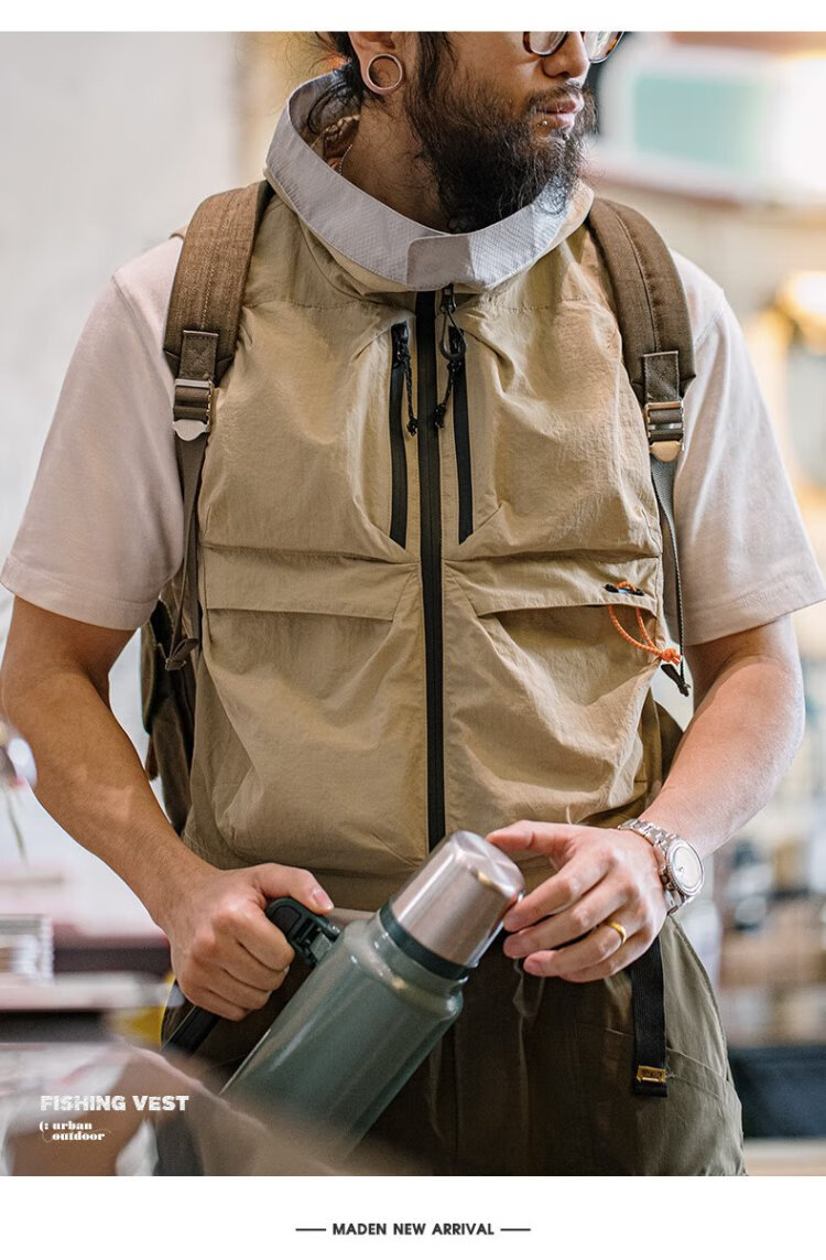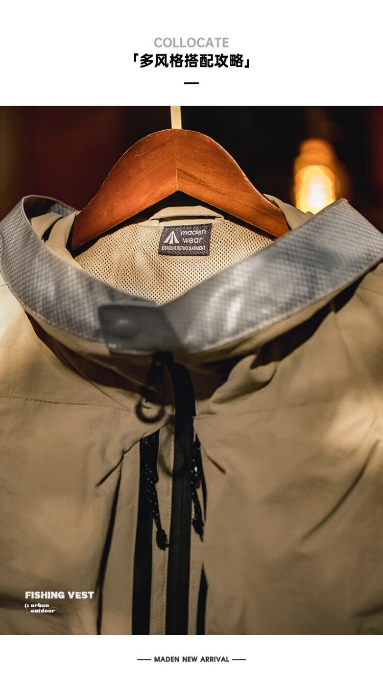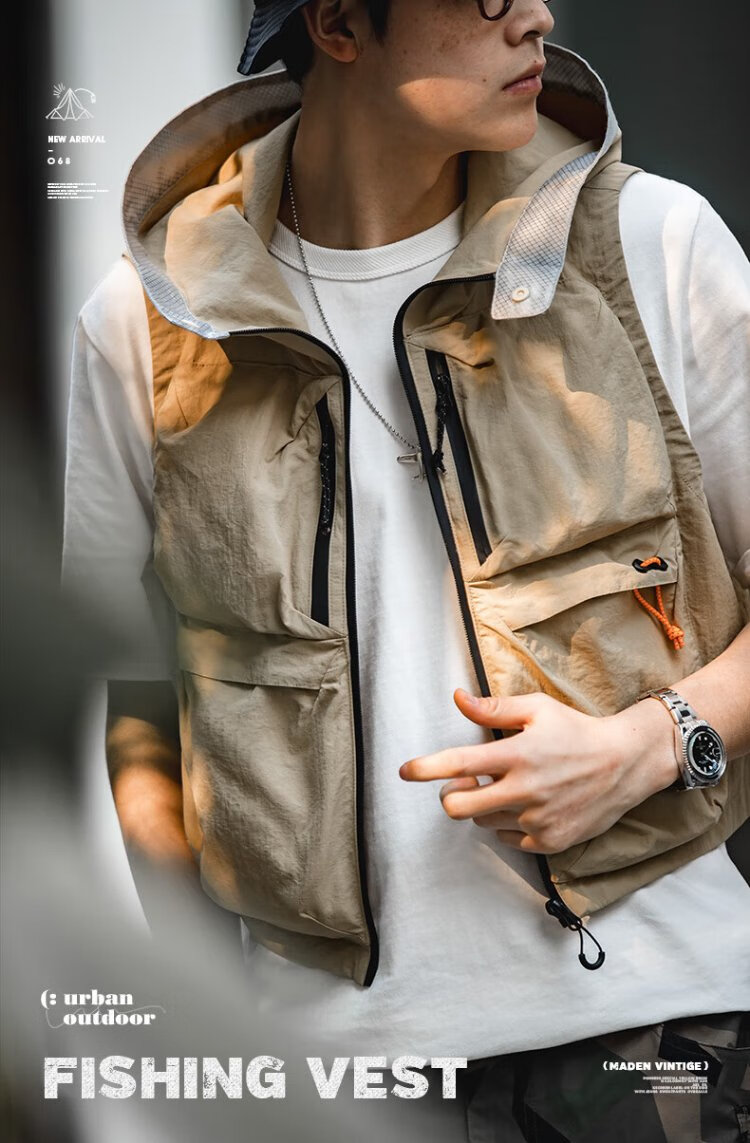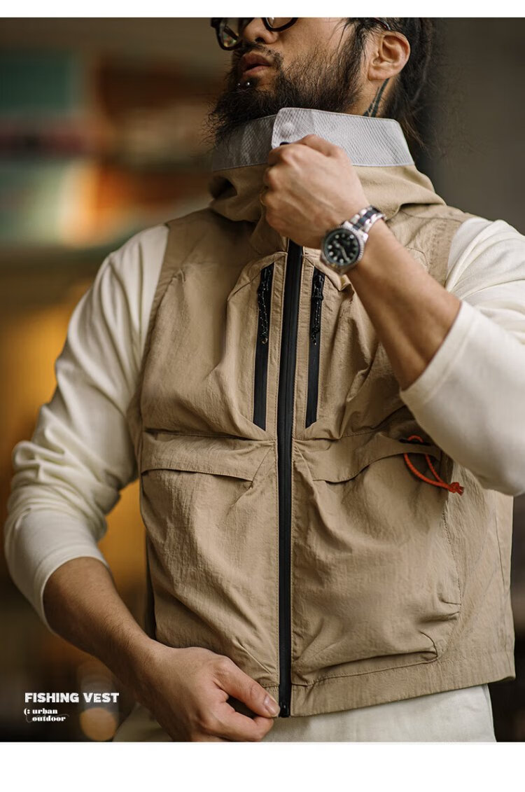 Madden Workwear Multi-pocket Hooded Vest Men's Jacket Sleeveless Outdoor Functional Wind Stacked Vest Vest Fishing Suit Khaki M