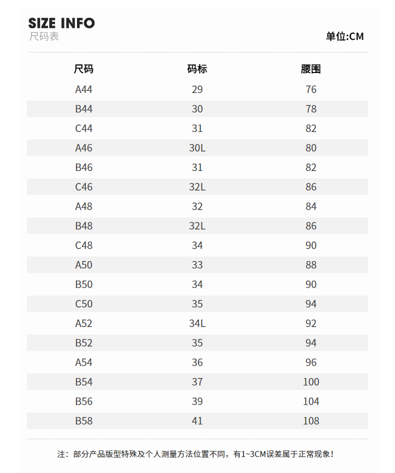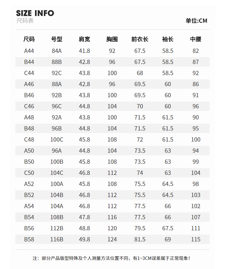 China (cm) 160-165/84-86 165-170 / 88-90 167-172 / 92-96 168-173 / 98-102 170-176 / 106-110