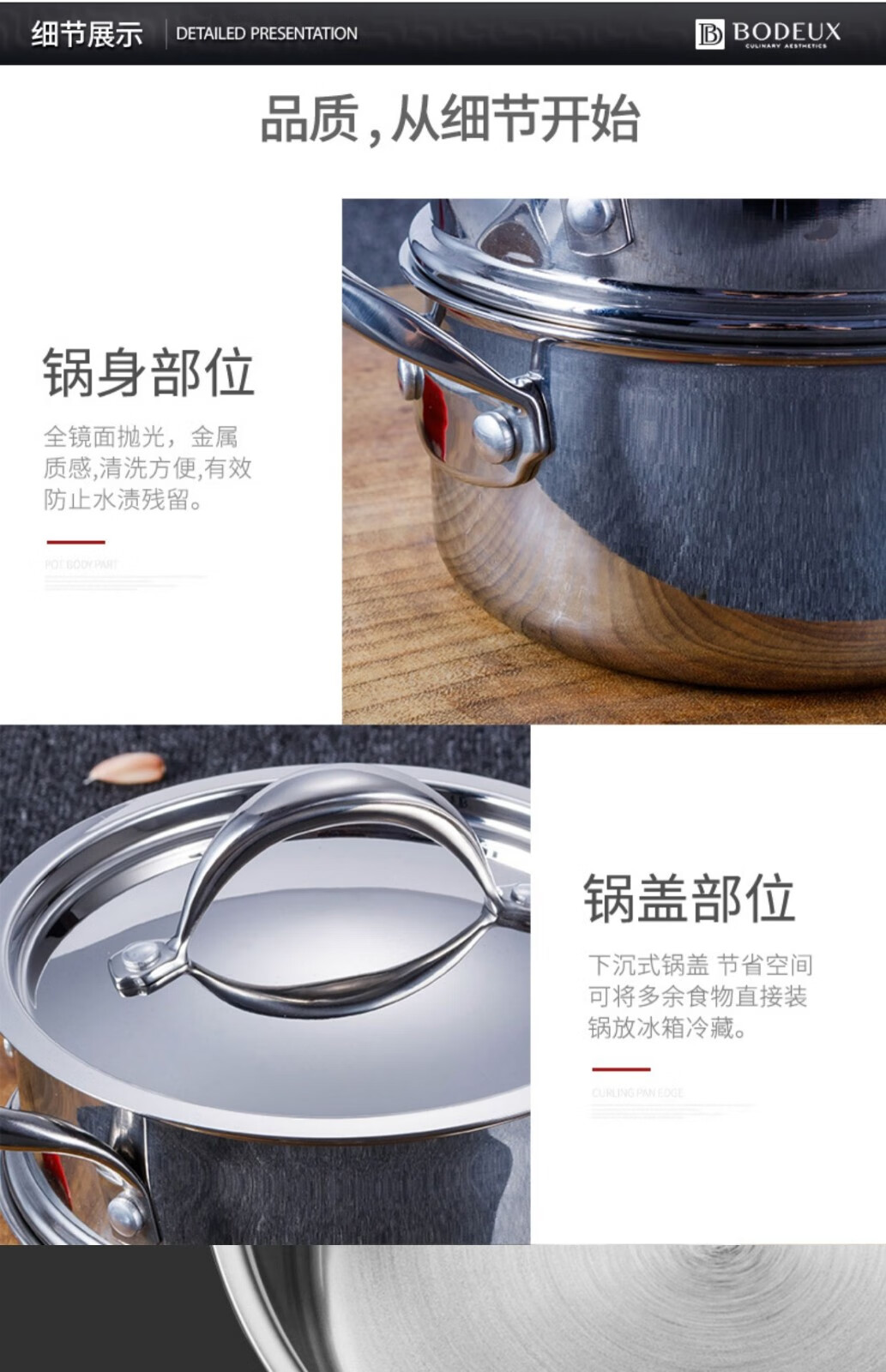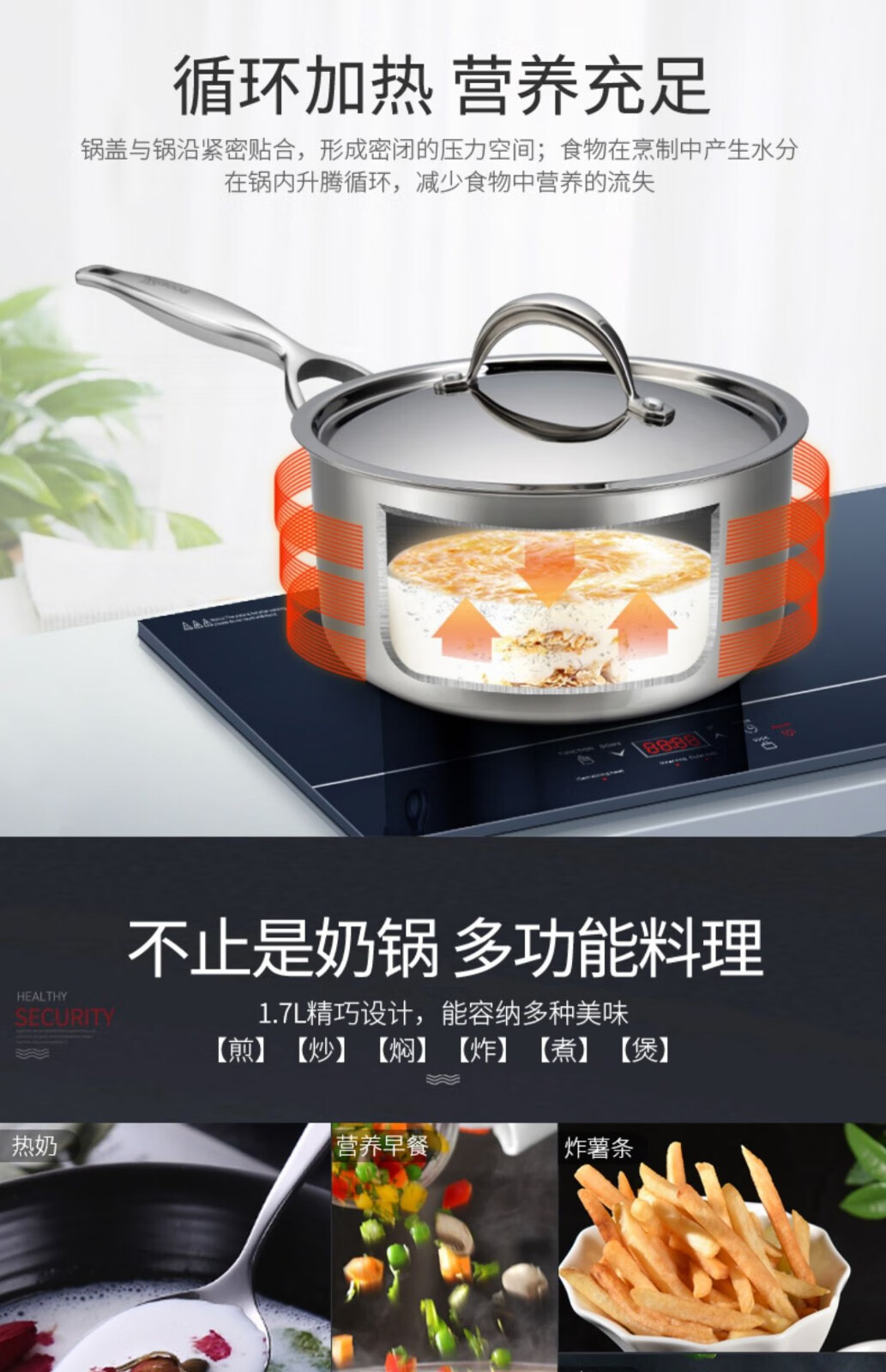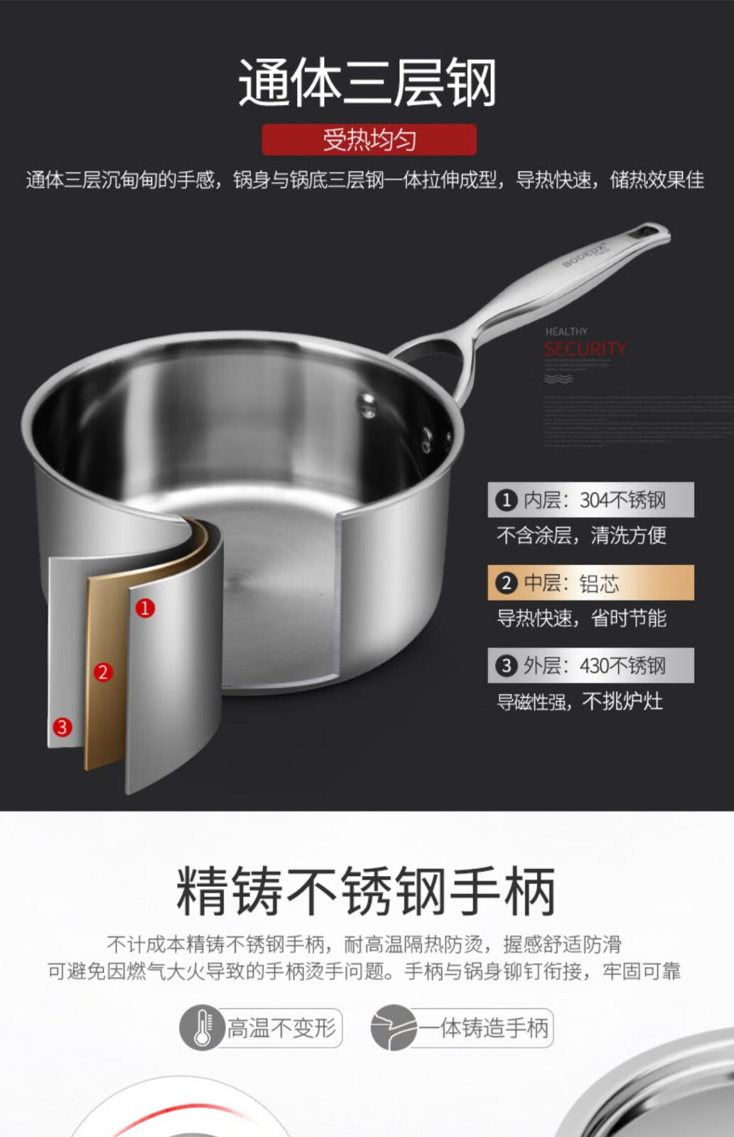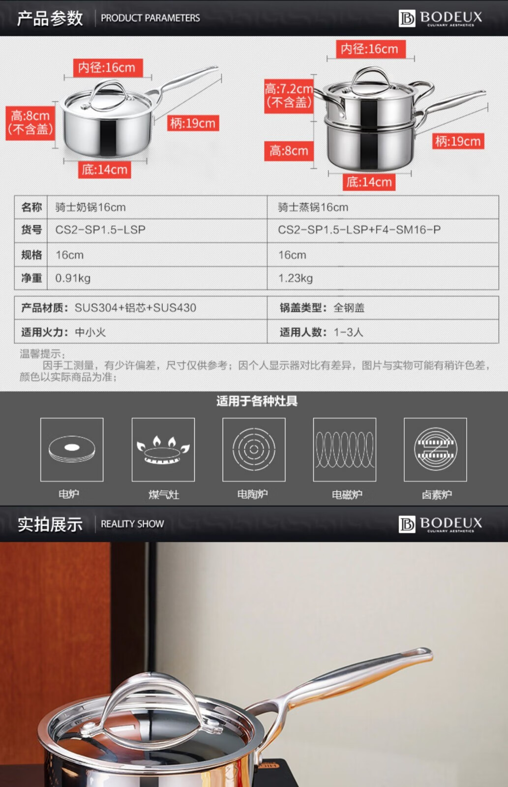BODEUX baby food pot, baby small milk pot, non-stick pot 304 stainless steel, household uncoated gas induction cooker, universal knight milk pot 16cm