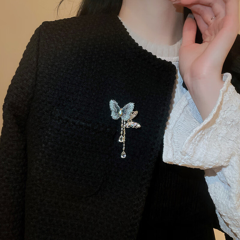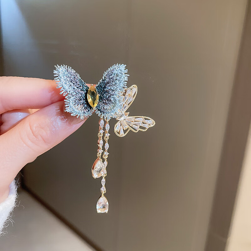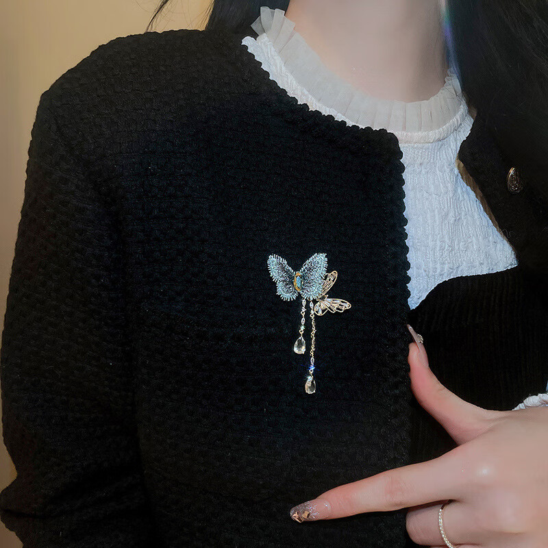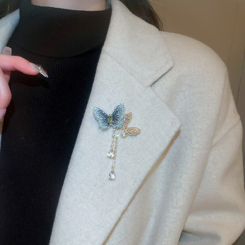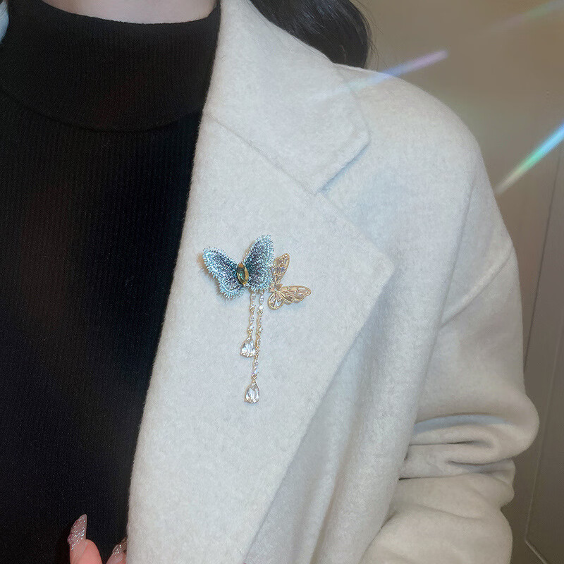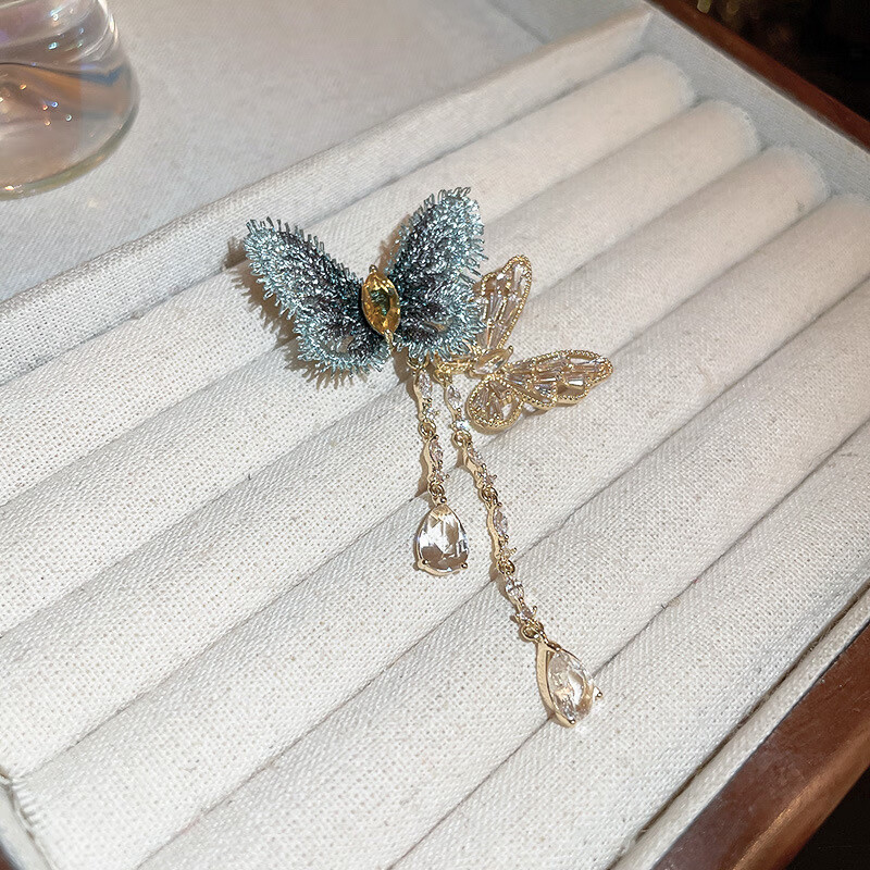 South Korea Zircon Butterfly Tassel Brooch Light Luxury Niche Suit Pin Fashion New Accessories Women's Brooch - Blue