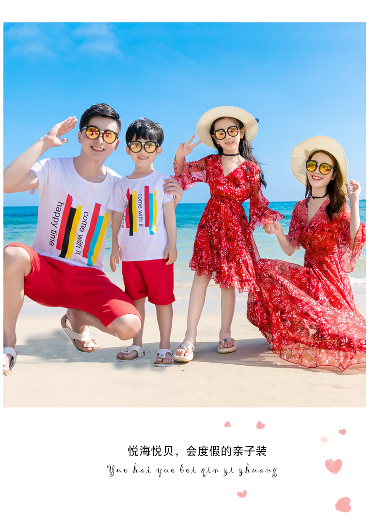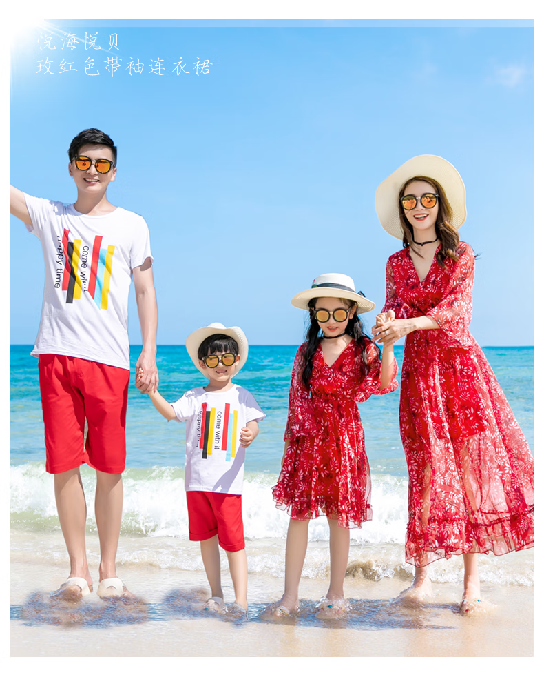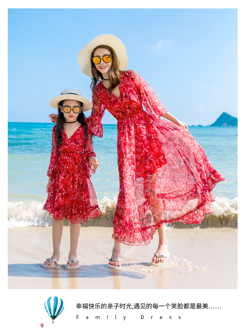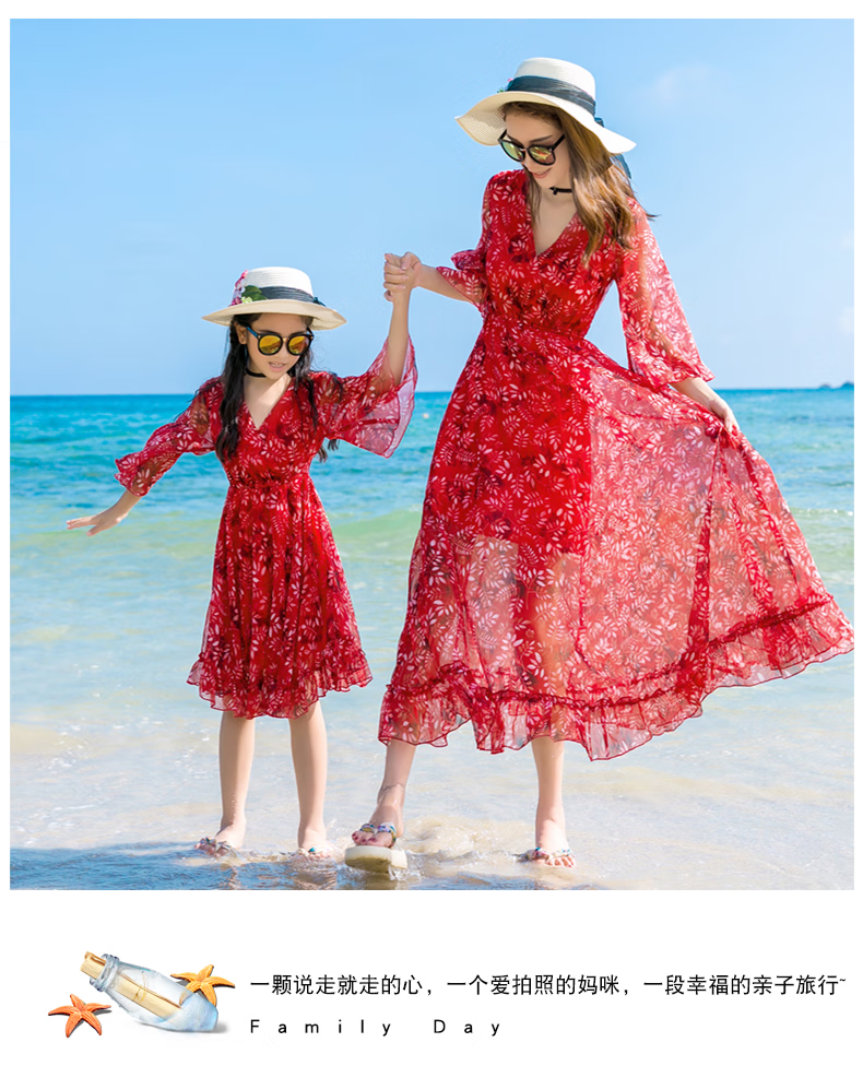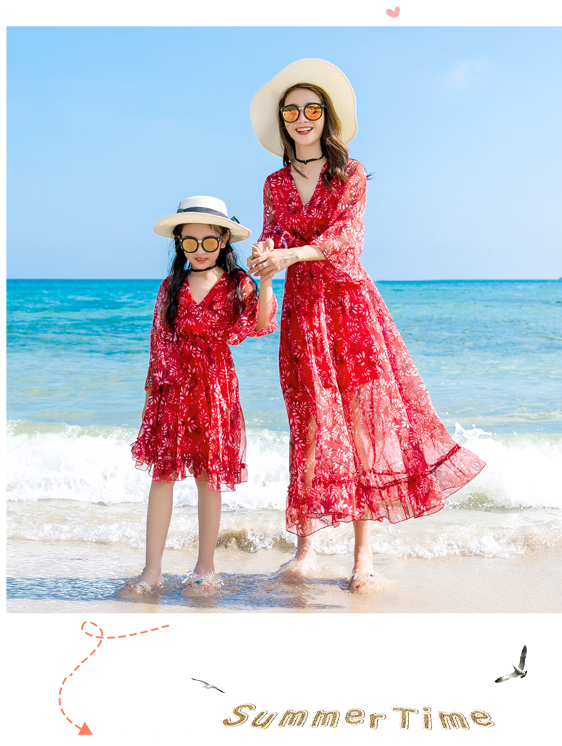 Yuehaiyuebei parent-child clothing for a family of three, beach vacation, mother-daughter clothing, red dress, long skirt, Sanya travel family of four, burgundy, women's XL