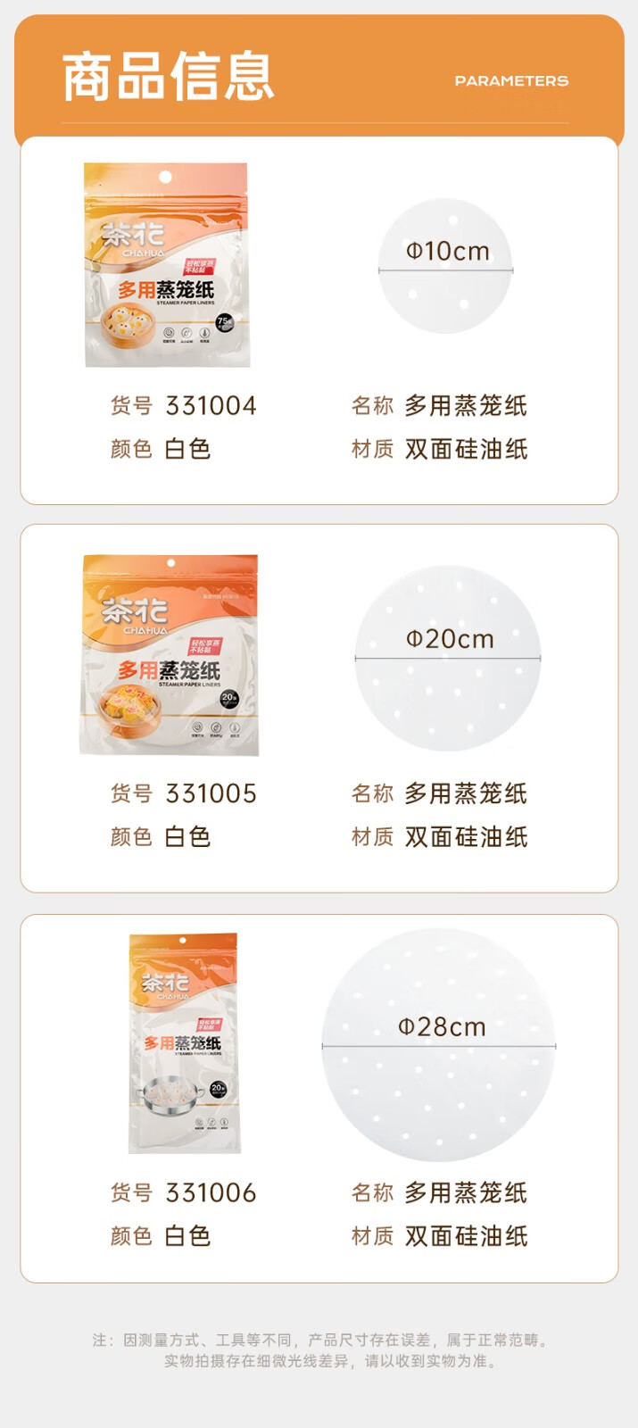 Camellia (CHAHUA) steamer paper non-stick disposable steamer pad food grade steamed bun steamer silicone paper pad household steamer drawer paper 1 bag 20 sheets diameter 28cm