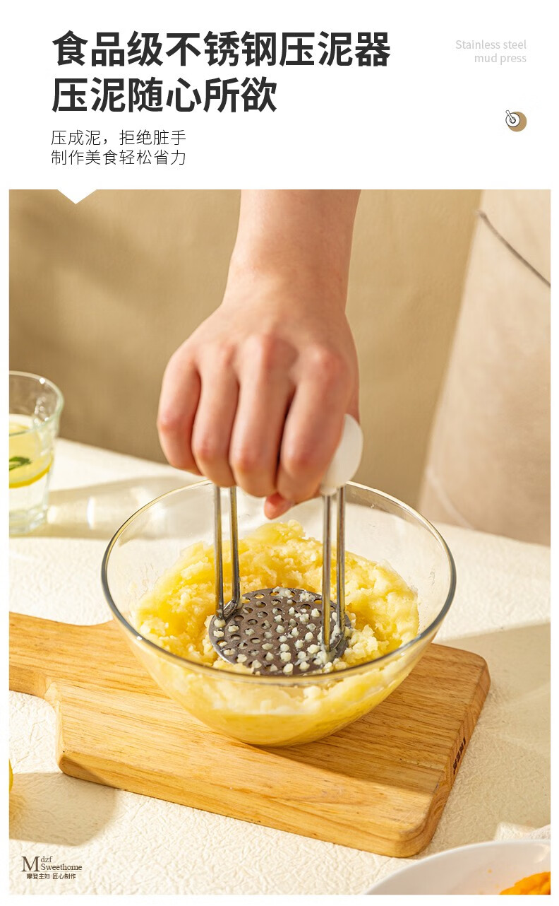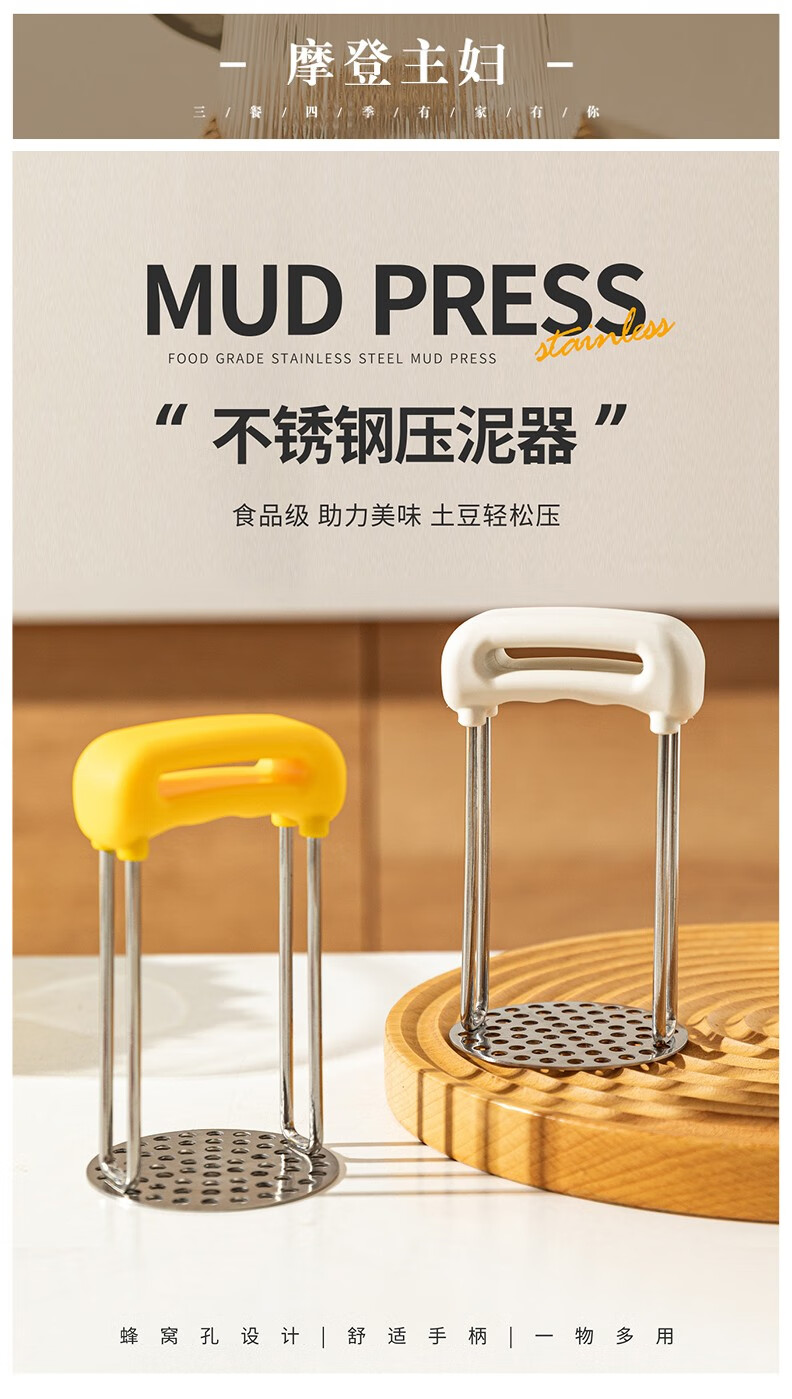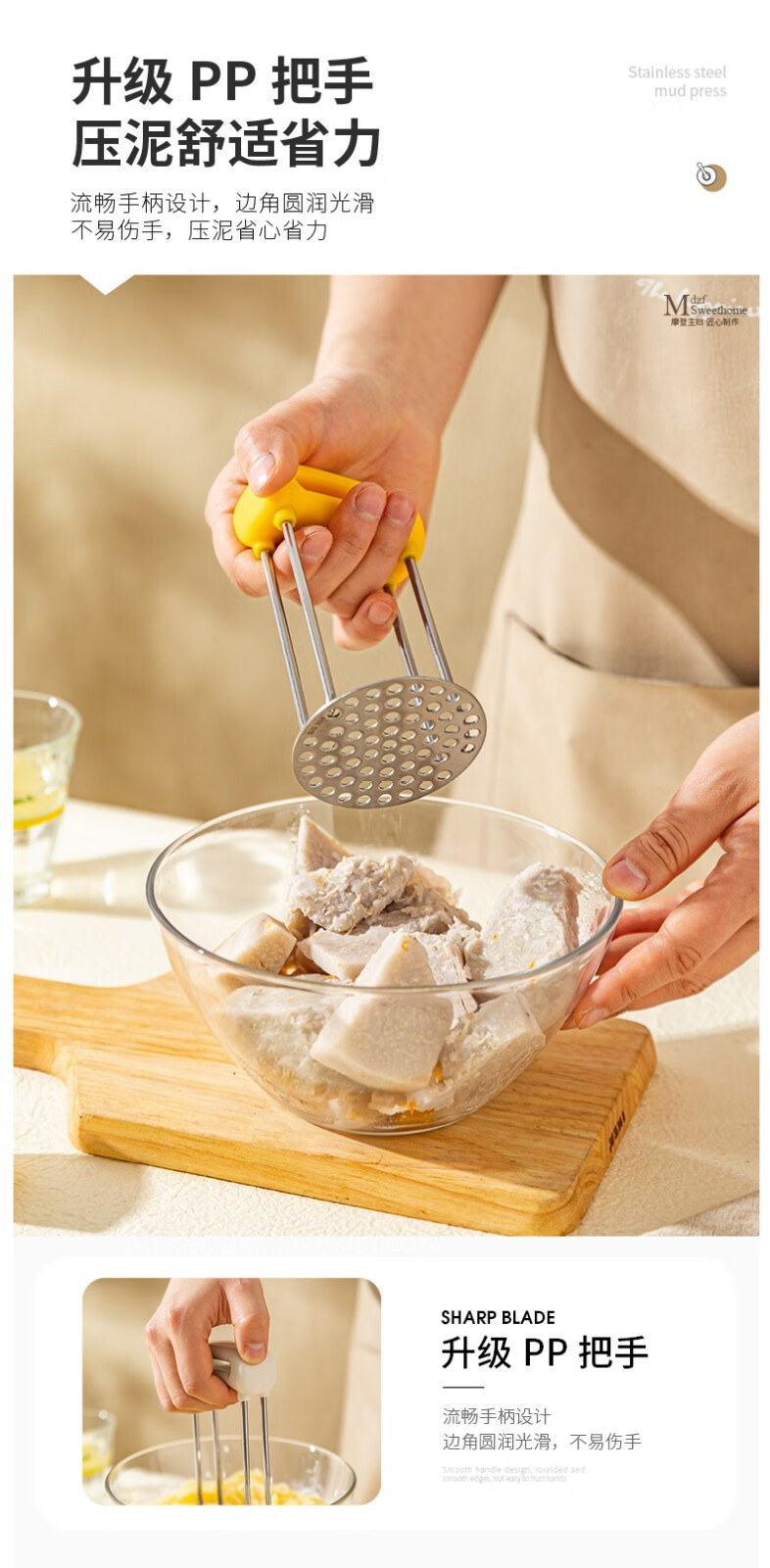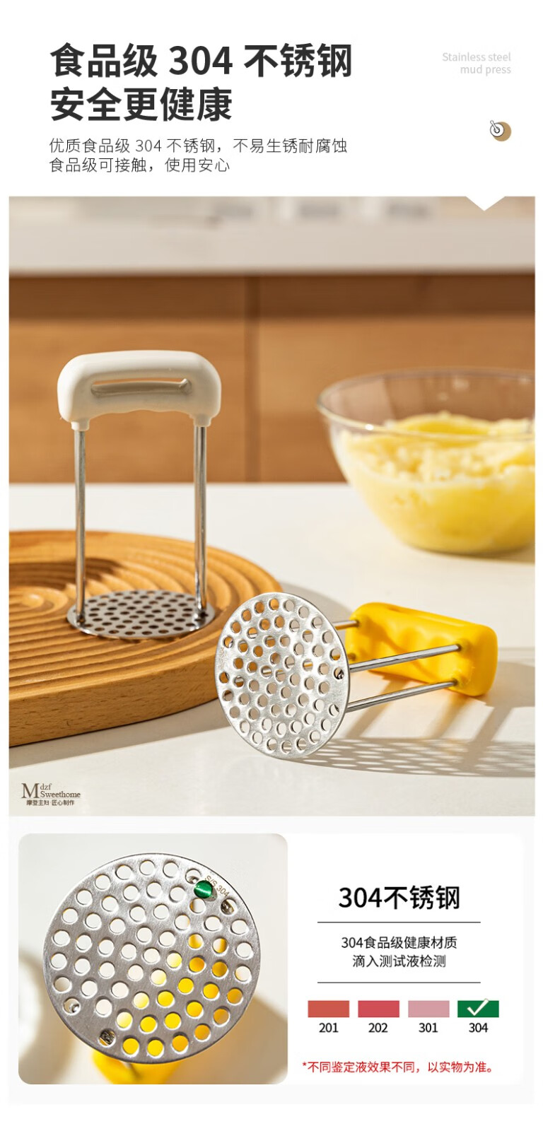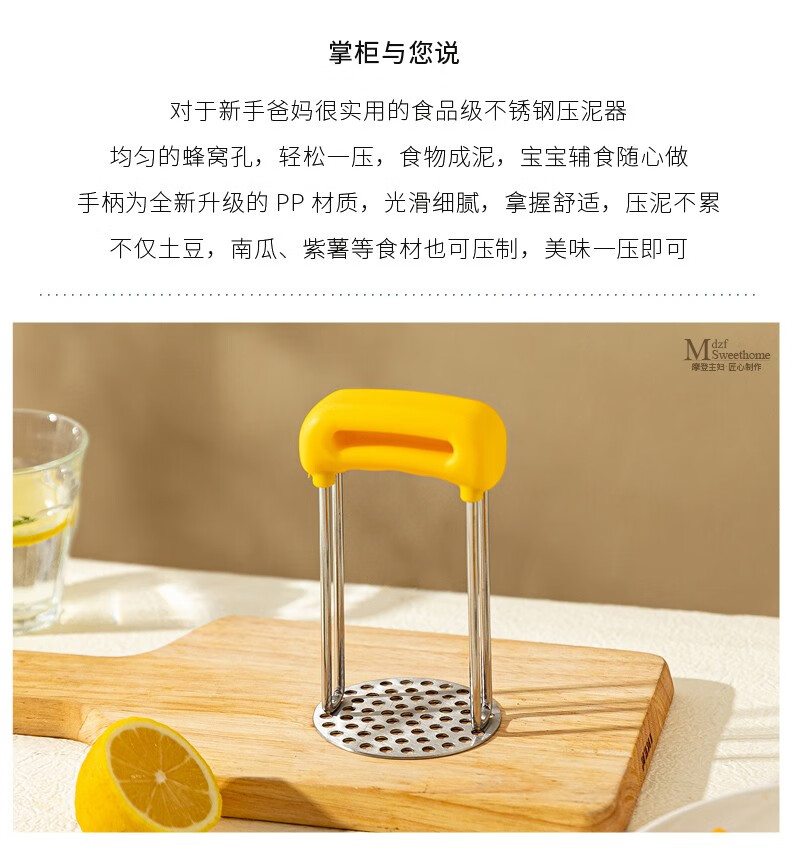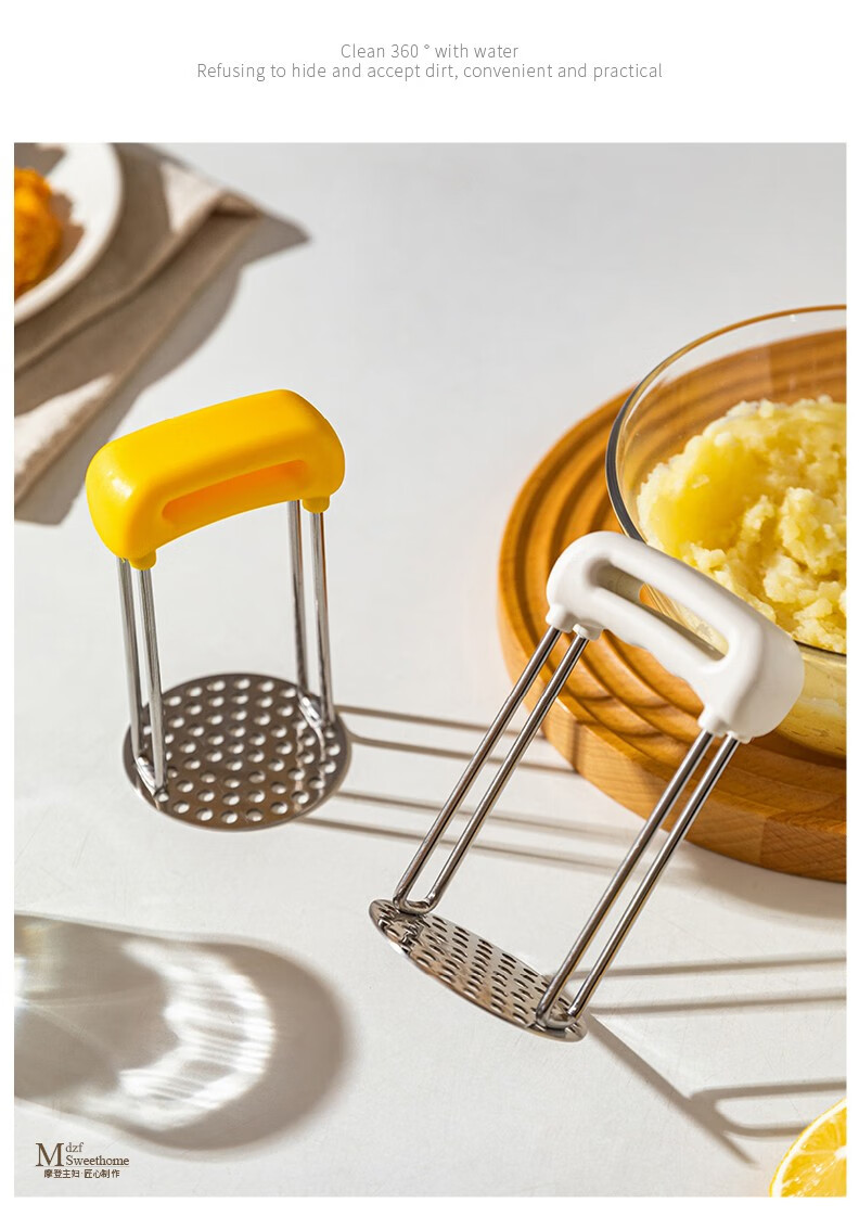 Modern housewife mashed potato masher baby food supplement masher spoon mashed potato artifact rolling masher 304 stainless steel masher-yellow