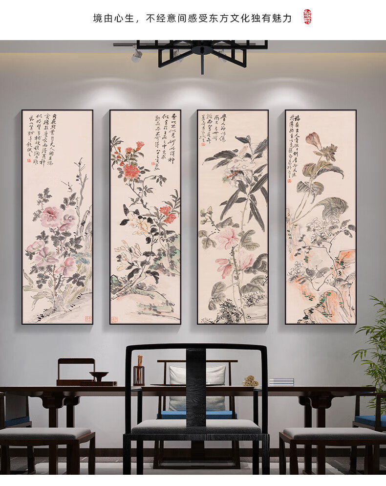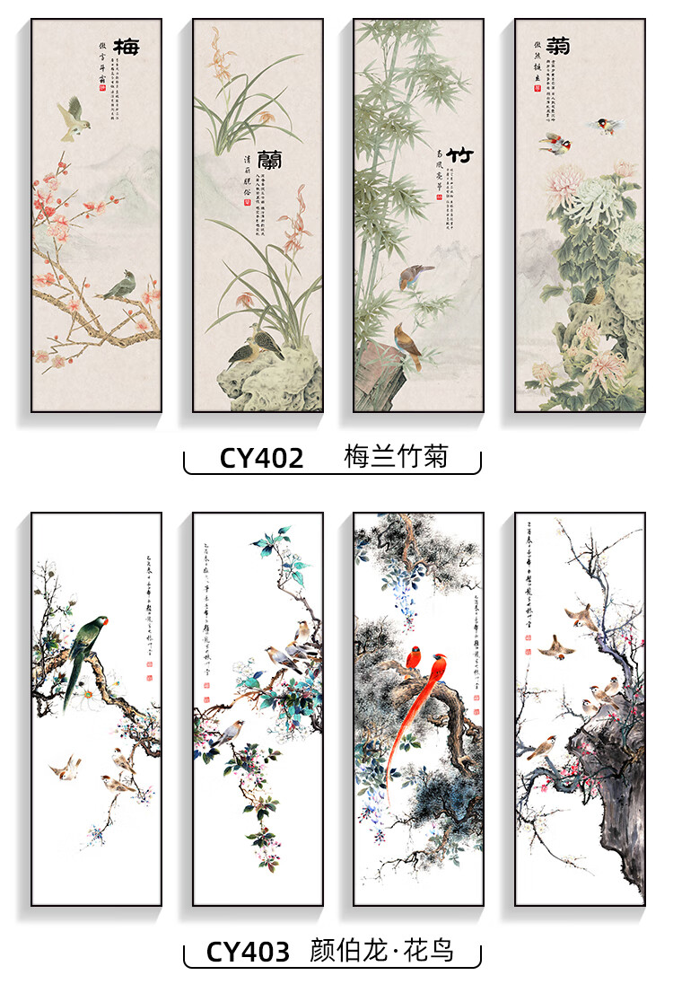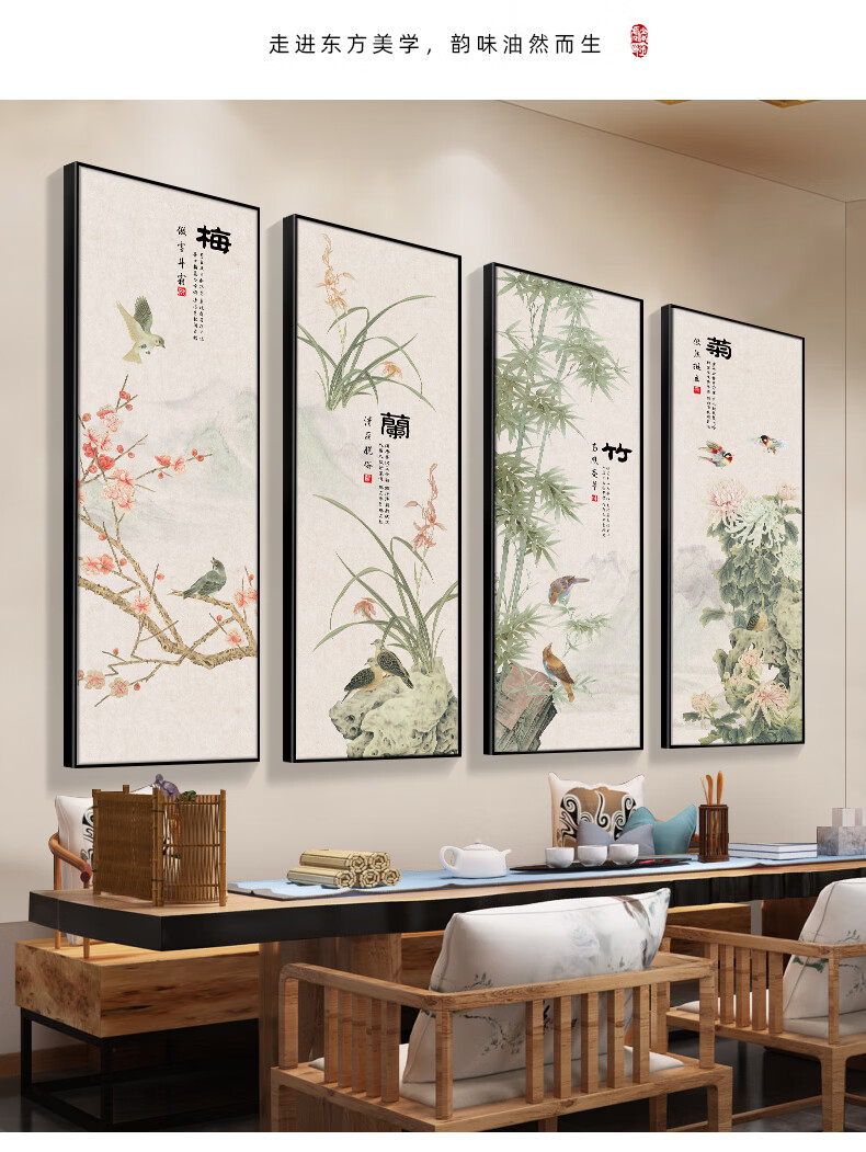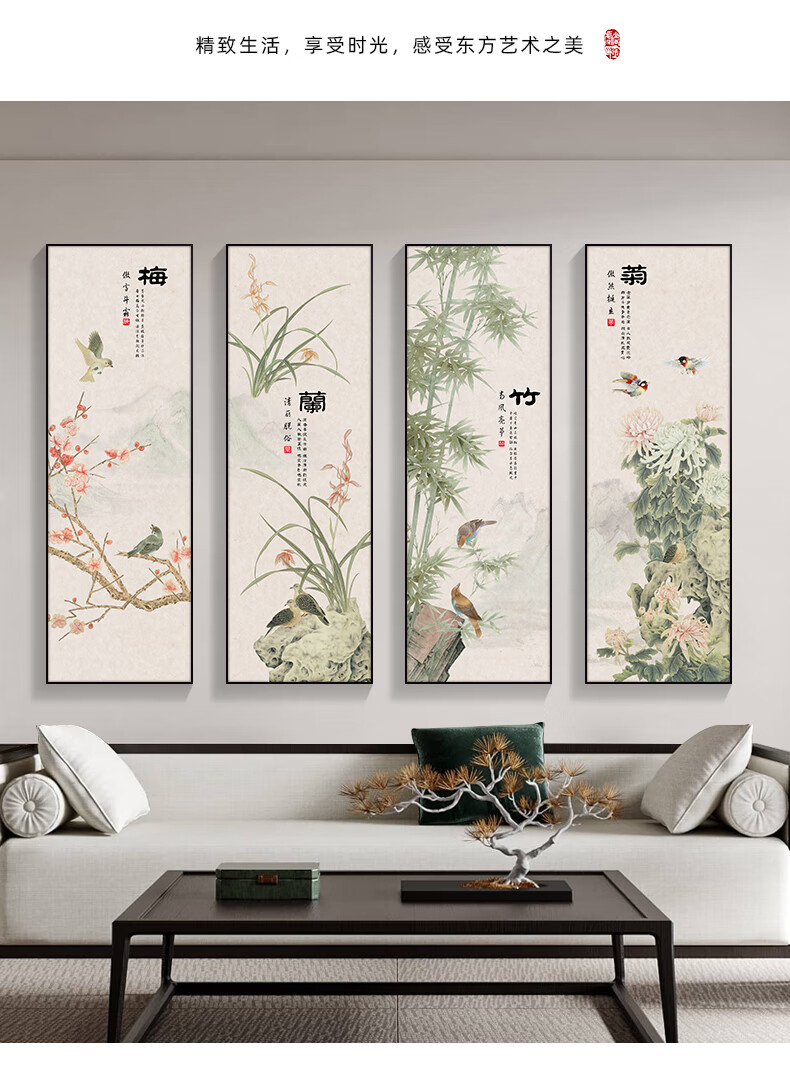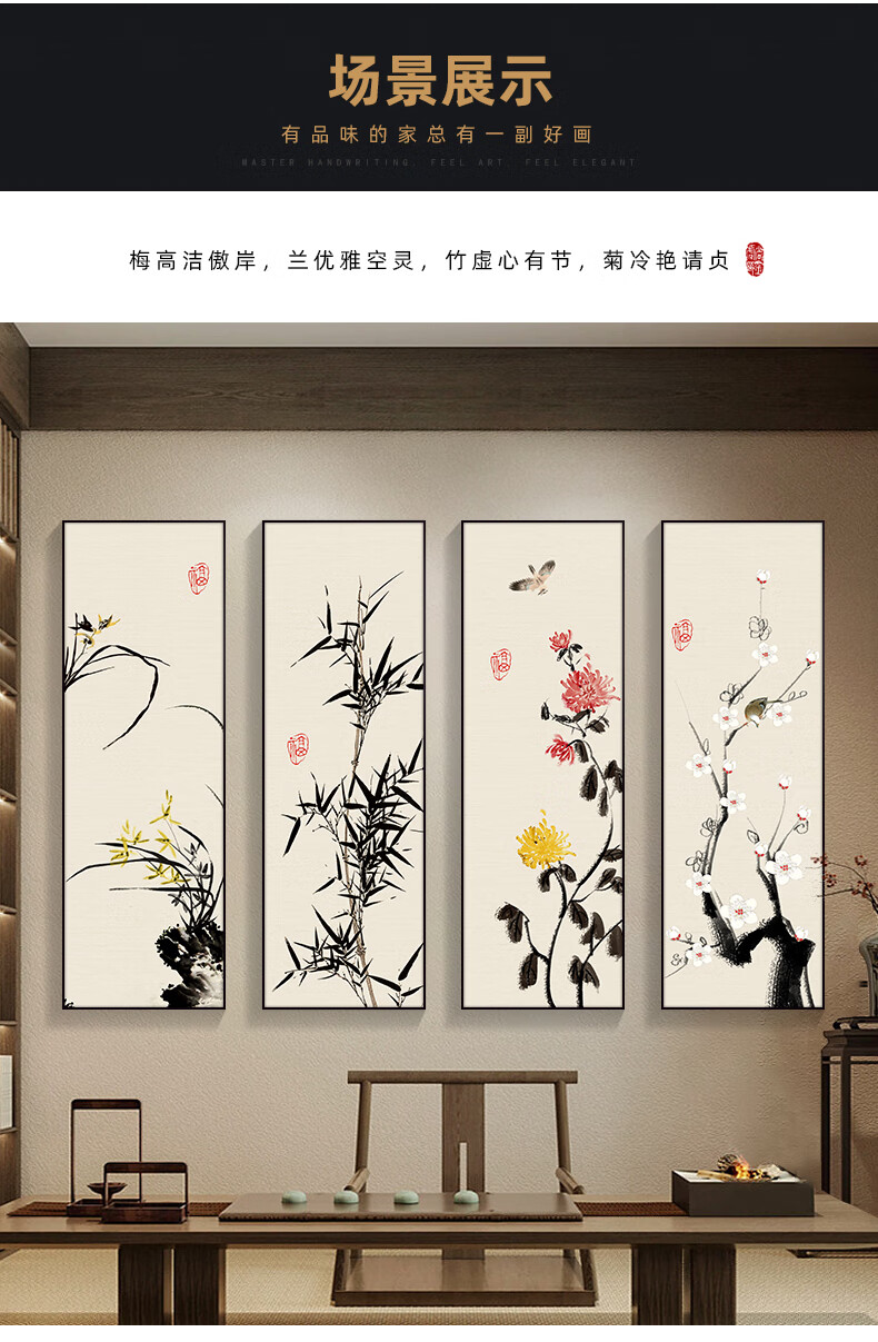 Manyu Qingsi Plum, Orchid, Bamboo and Chrysanthemum Living Room Decoration Painting Quadruple Tea Room Hanging Painting New Chinese Restaurant Sofa Background Wall Painting Ink Painting CY402 Plum, Orchid, Bamboo and Chrysanthemum 40*120cm*4 pieces Gold frame + shiny silver cloth