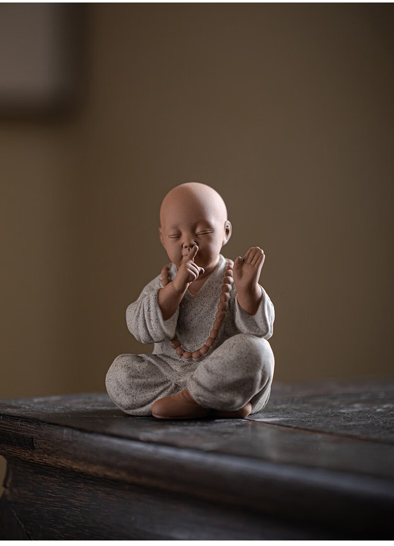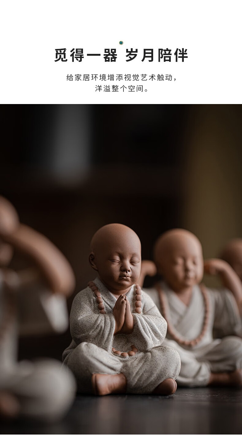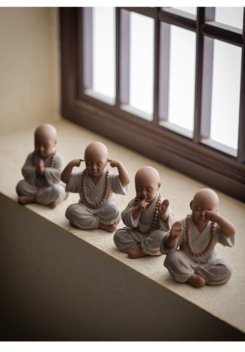 Refining fine ceramics, four little monks, tea pet, tea table, tabletop, small tea ceremony ornaments, tea accessories + three-layer wooden base