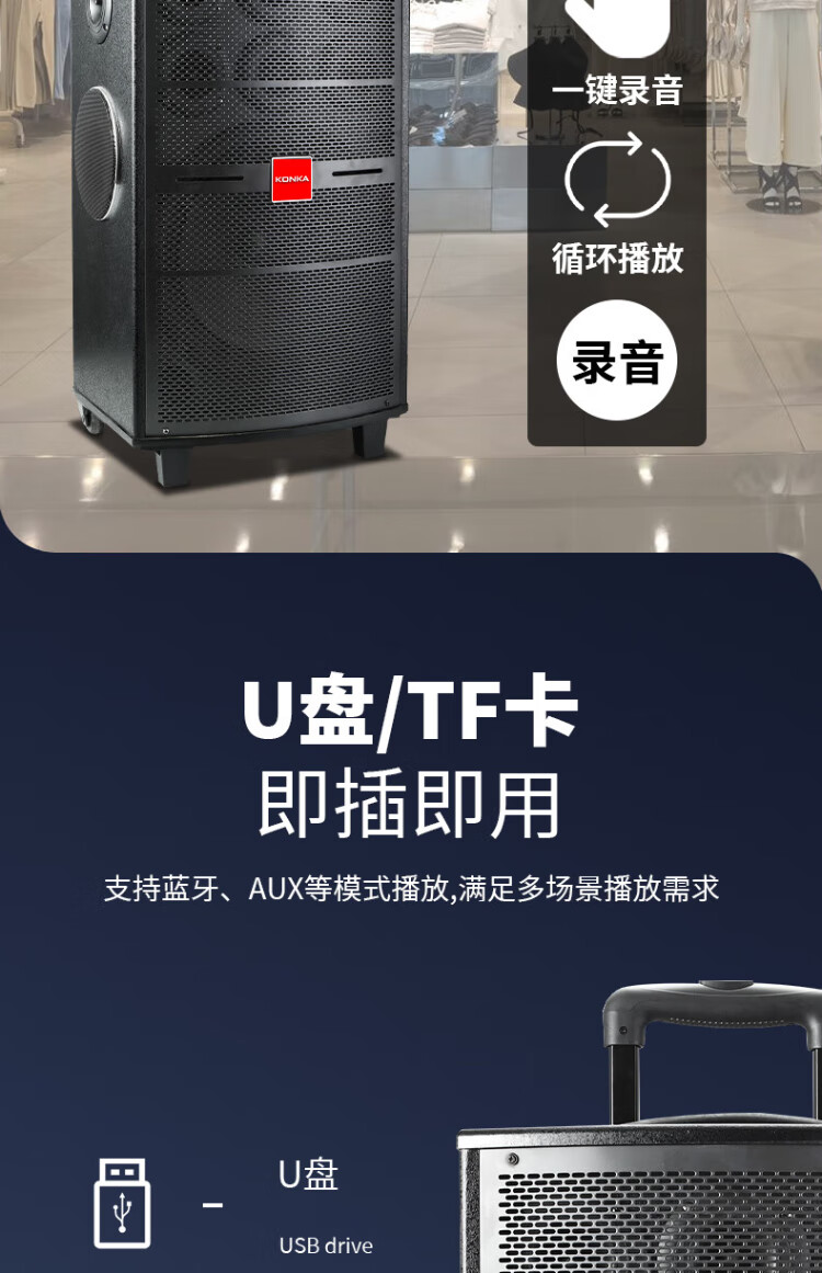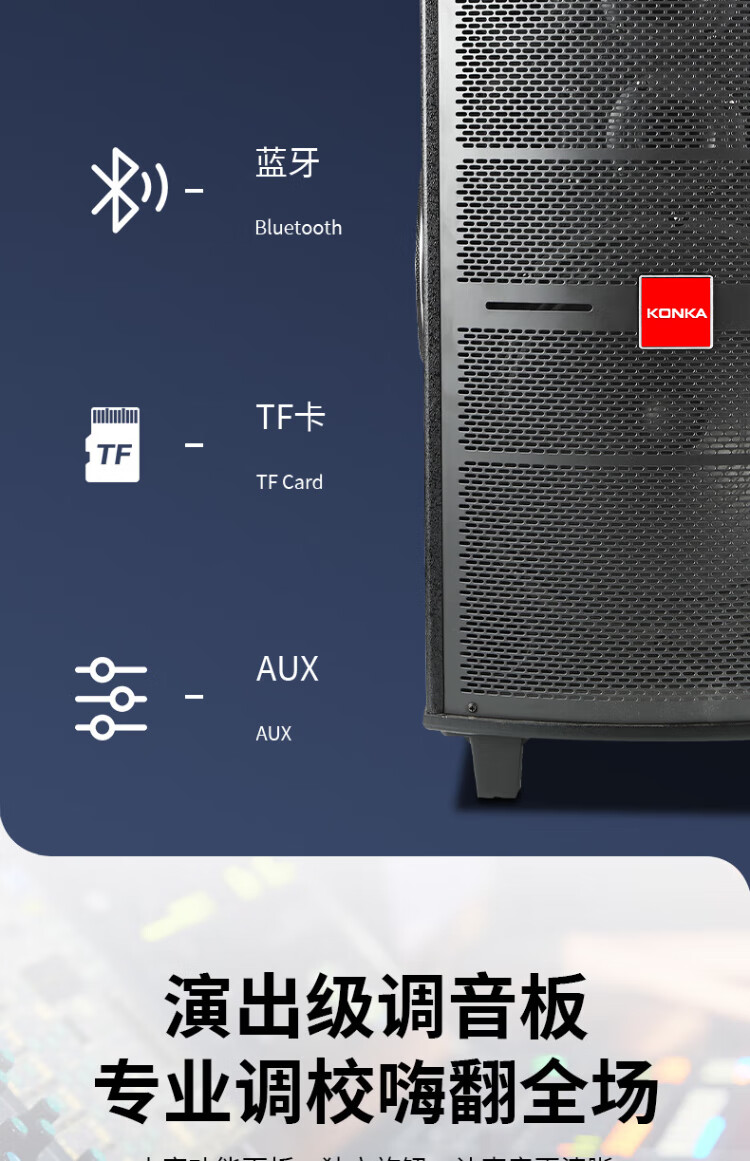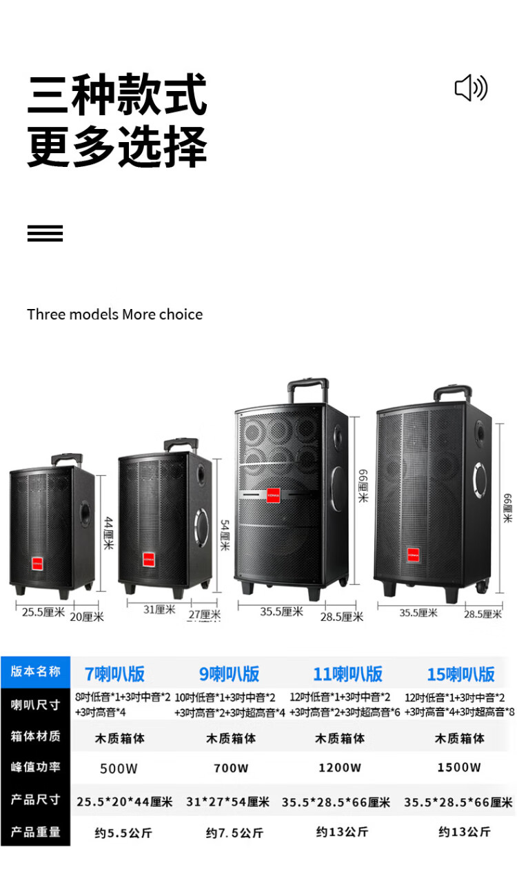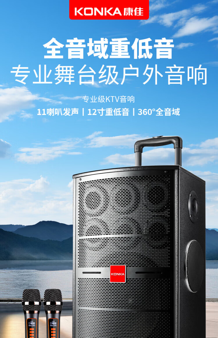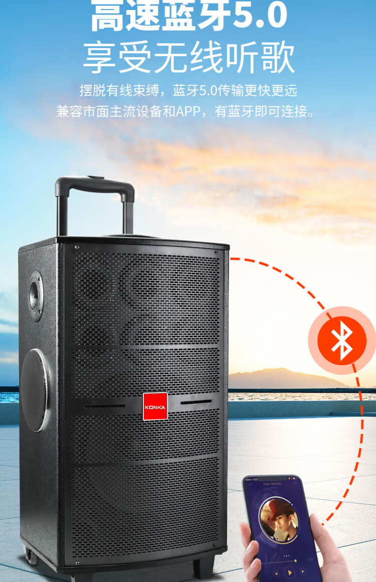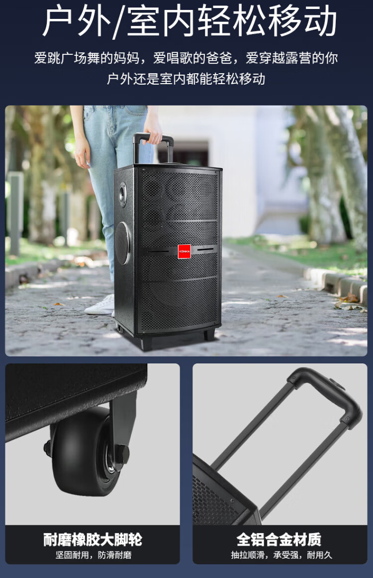 Konka square dance audio three-way outdoor mobile trolley performance singing karaoke wooden speaker subwoofer home portable Bluetooth high power high volume with wireless microphone 7 speakers + 2 rechargeable microphones