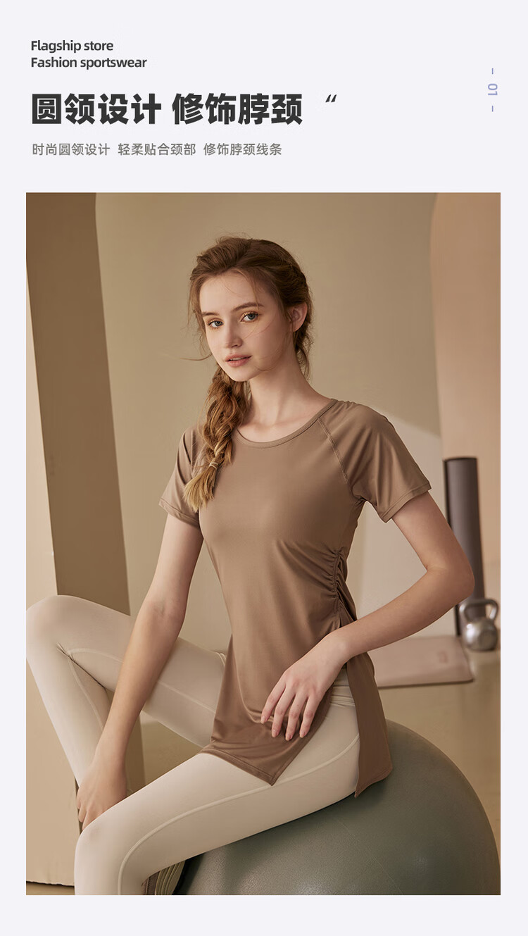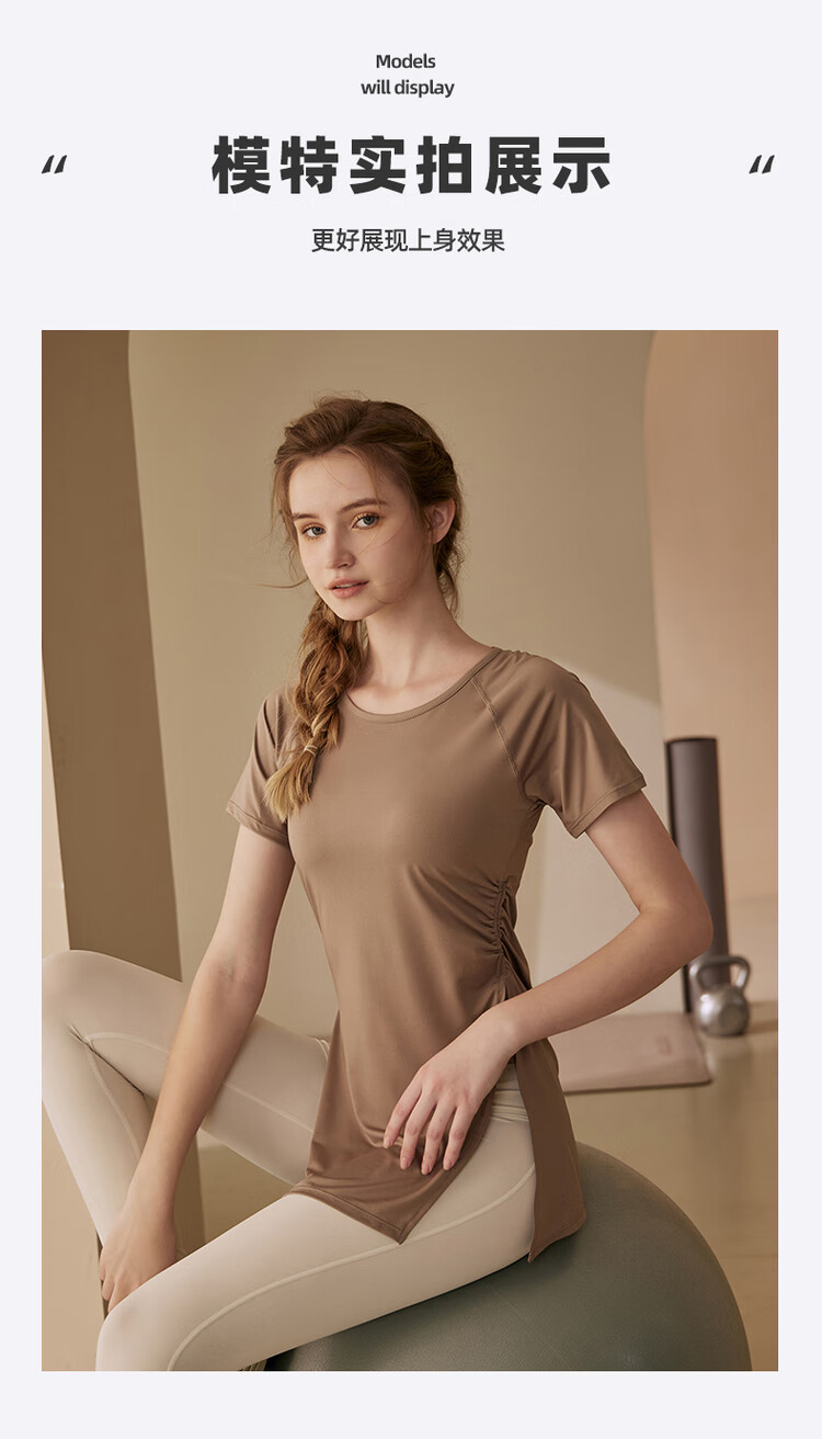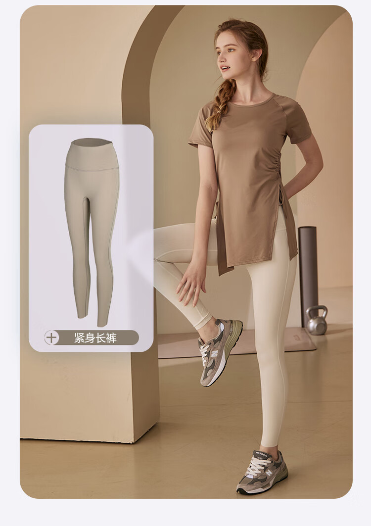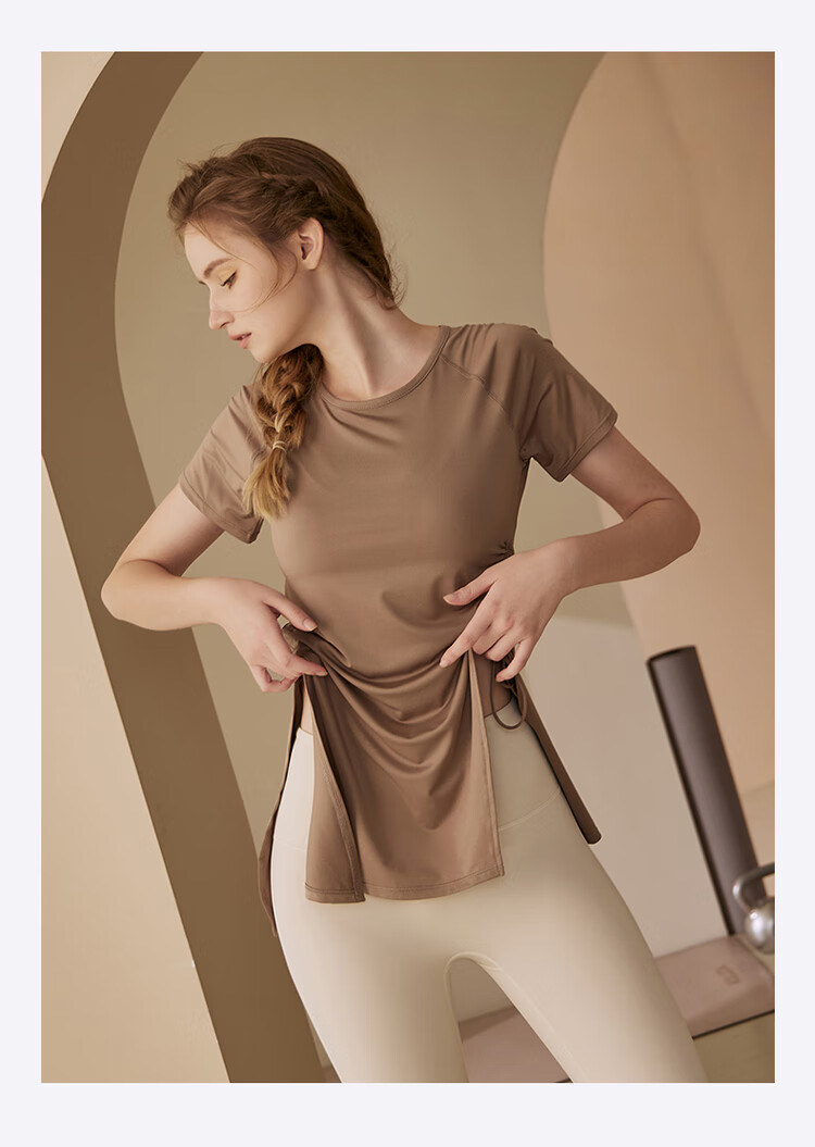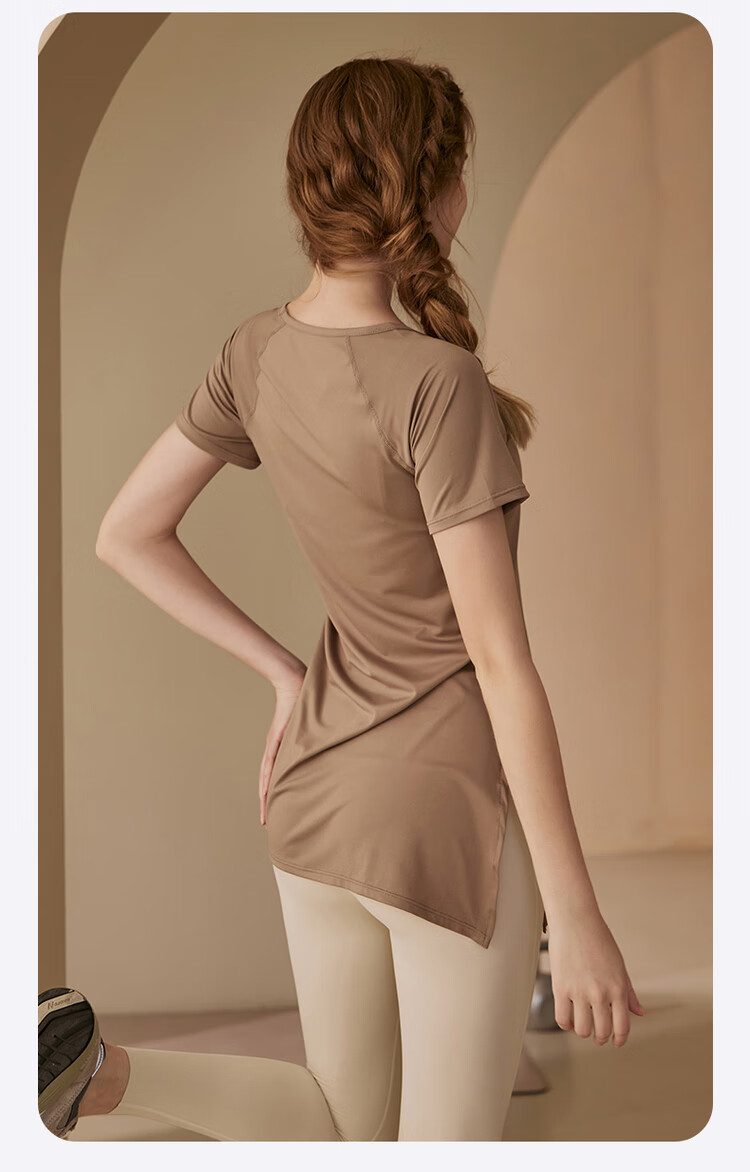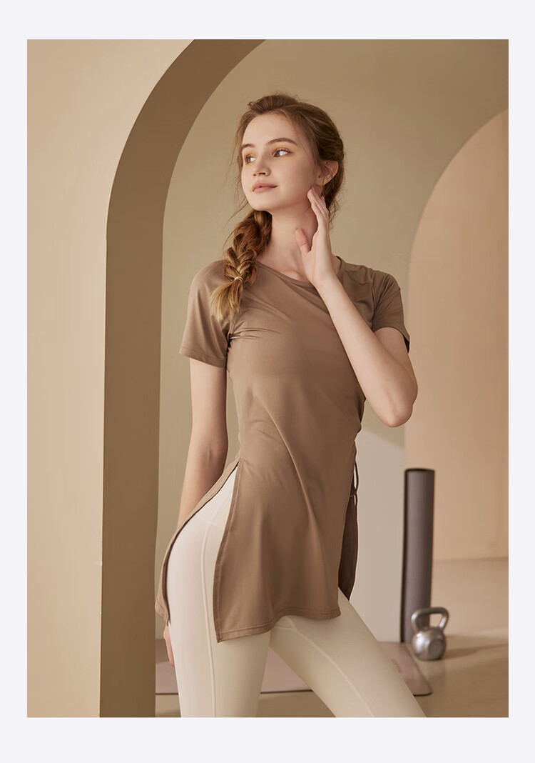 Kong Yu's high-looking sports top for women running yoga short-sleeved Pilates butt-covering breathable fitness T-shirt suit summer pink top + milk coffee pants L