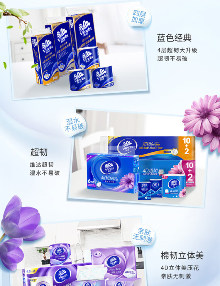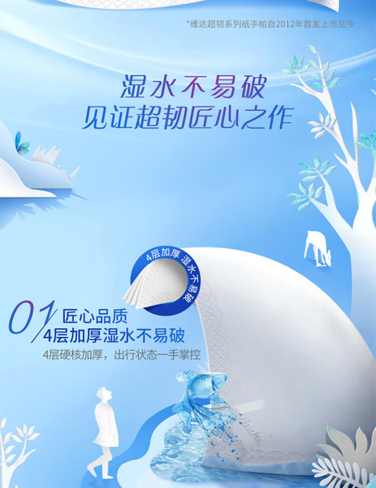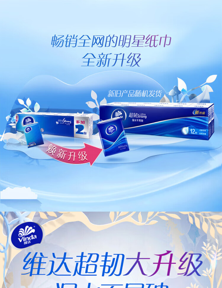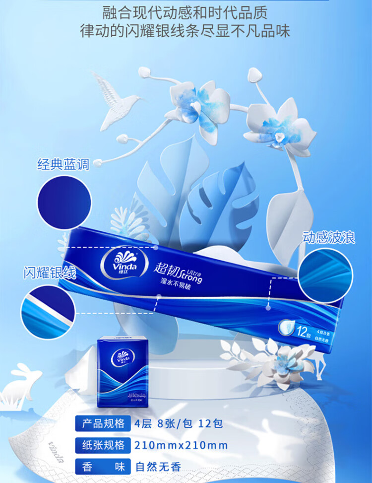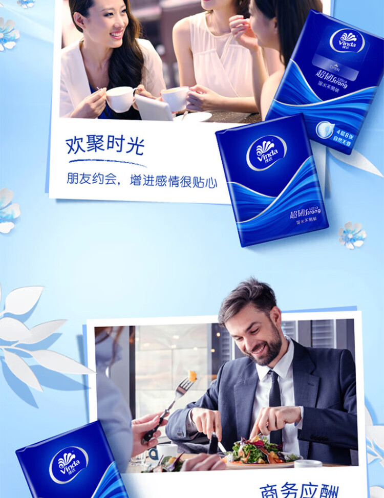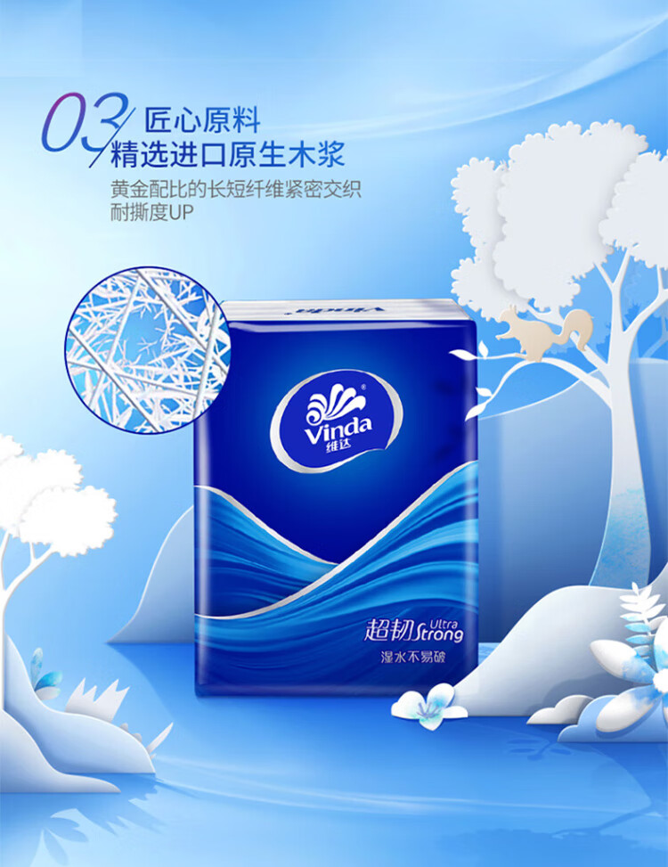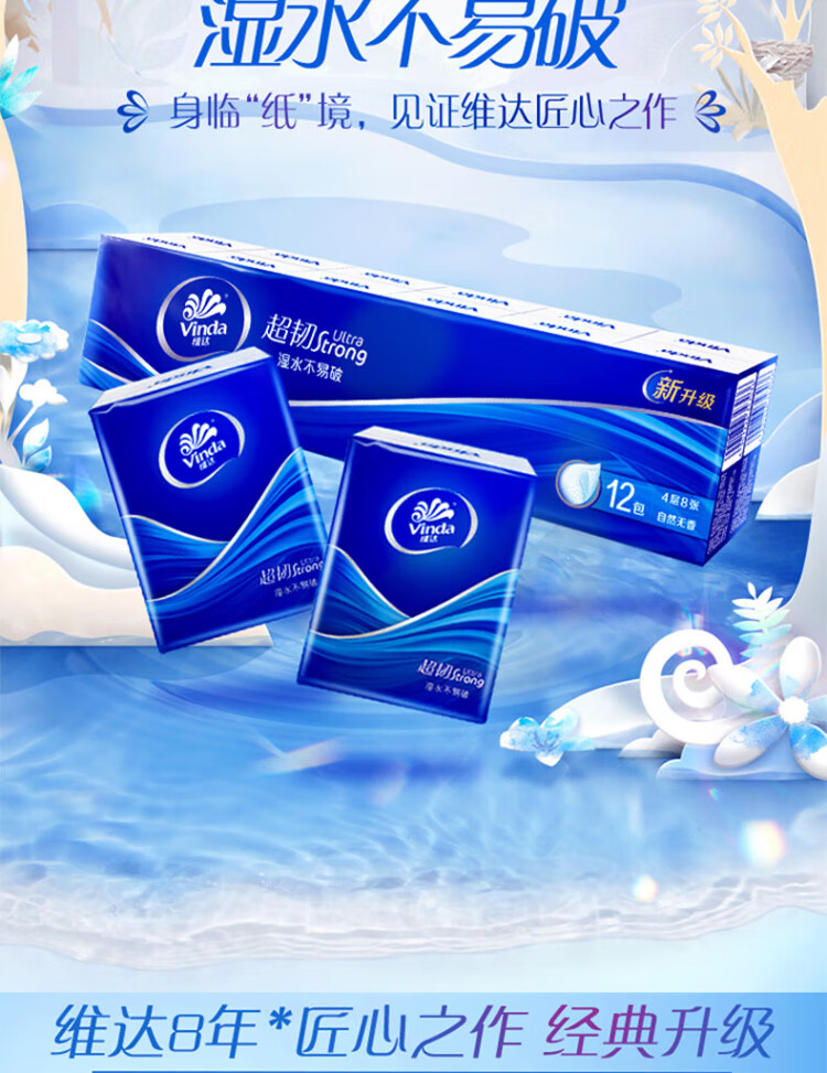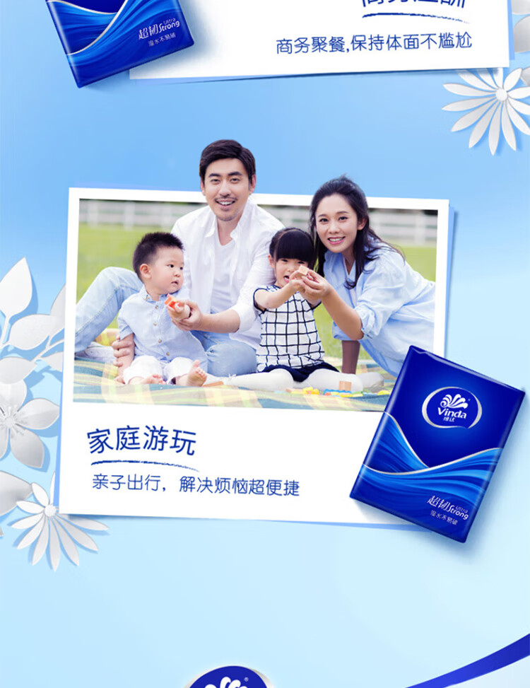 Vinda handkerchief paper super tough 4 layers 8 pieces portable small pack paper towel toilet paper unscented napkin wettable water paper towel 4 layers 8 sheets * 36 pack