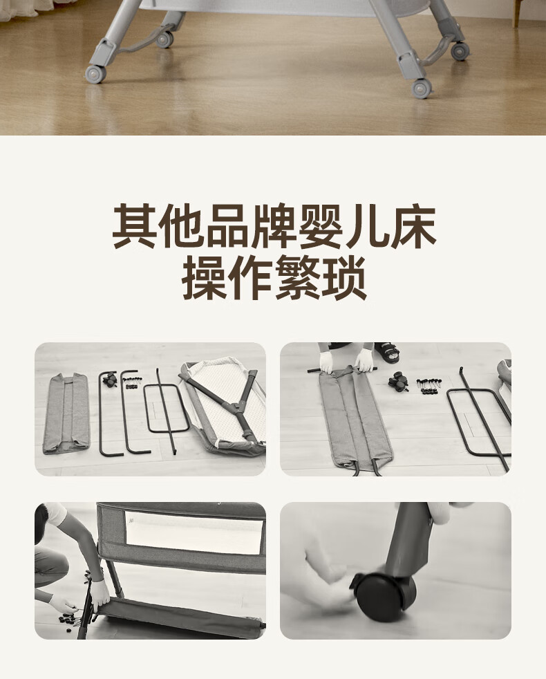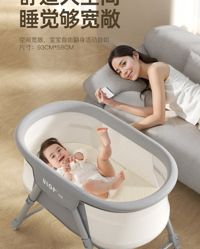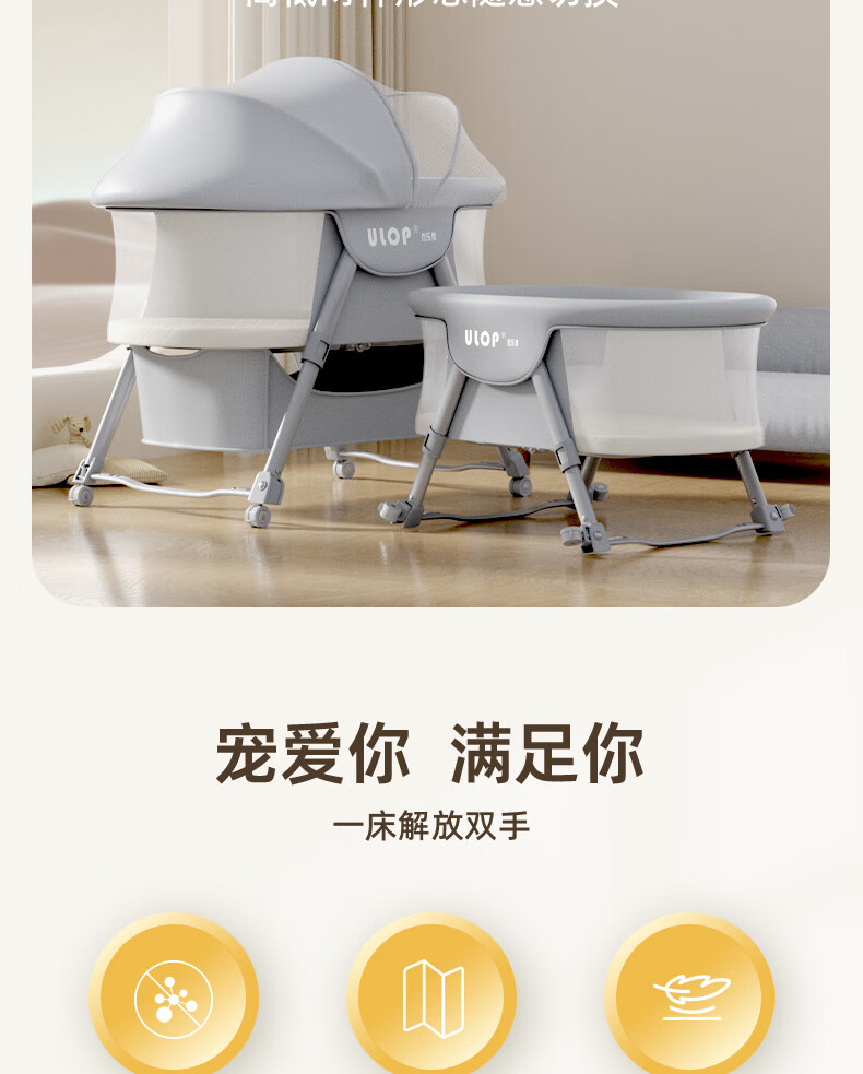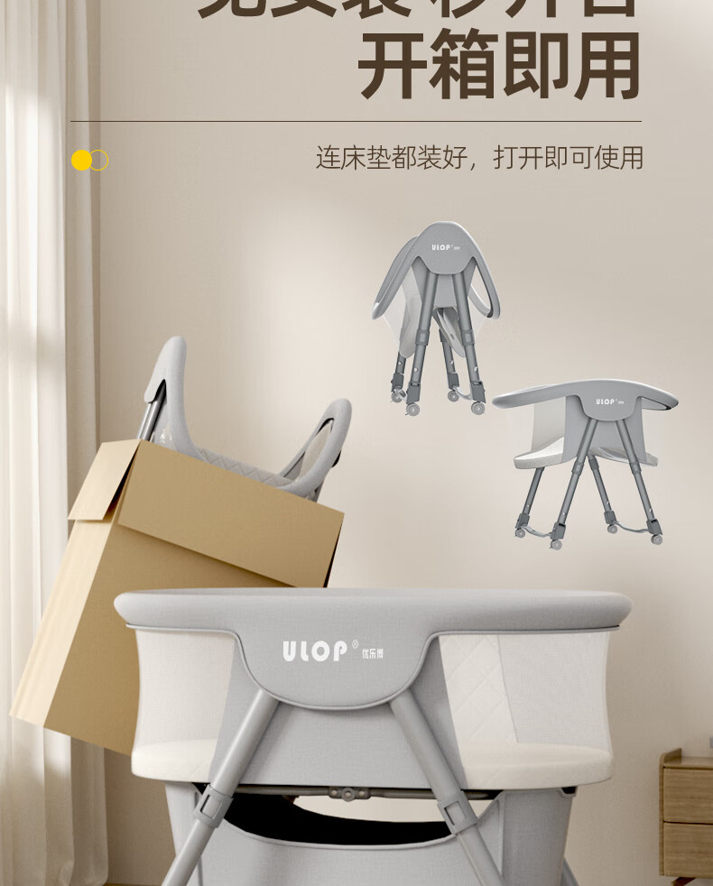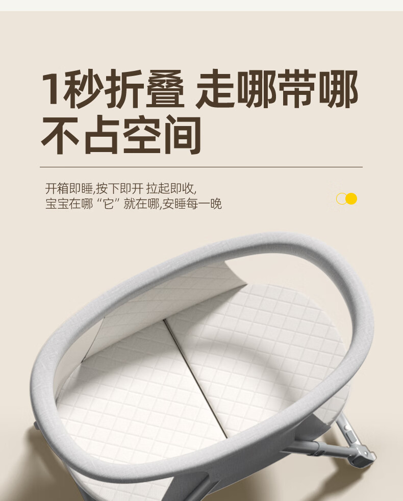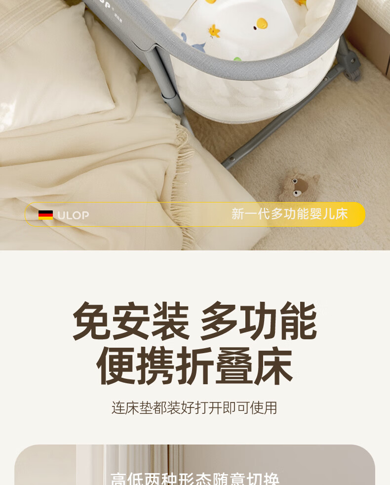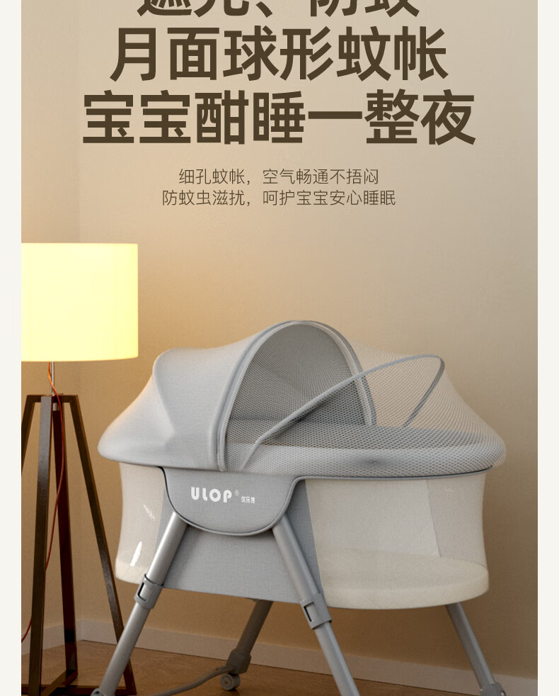 ULOP crib multi-functional mobile baby cradle one-click folding newborn bb rocking bed portable sleep artifact free installation nap bed + mosquito net + mattress khaki