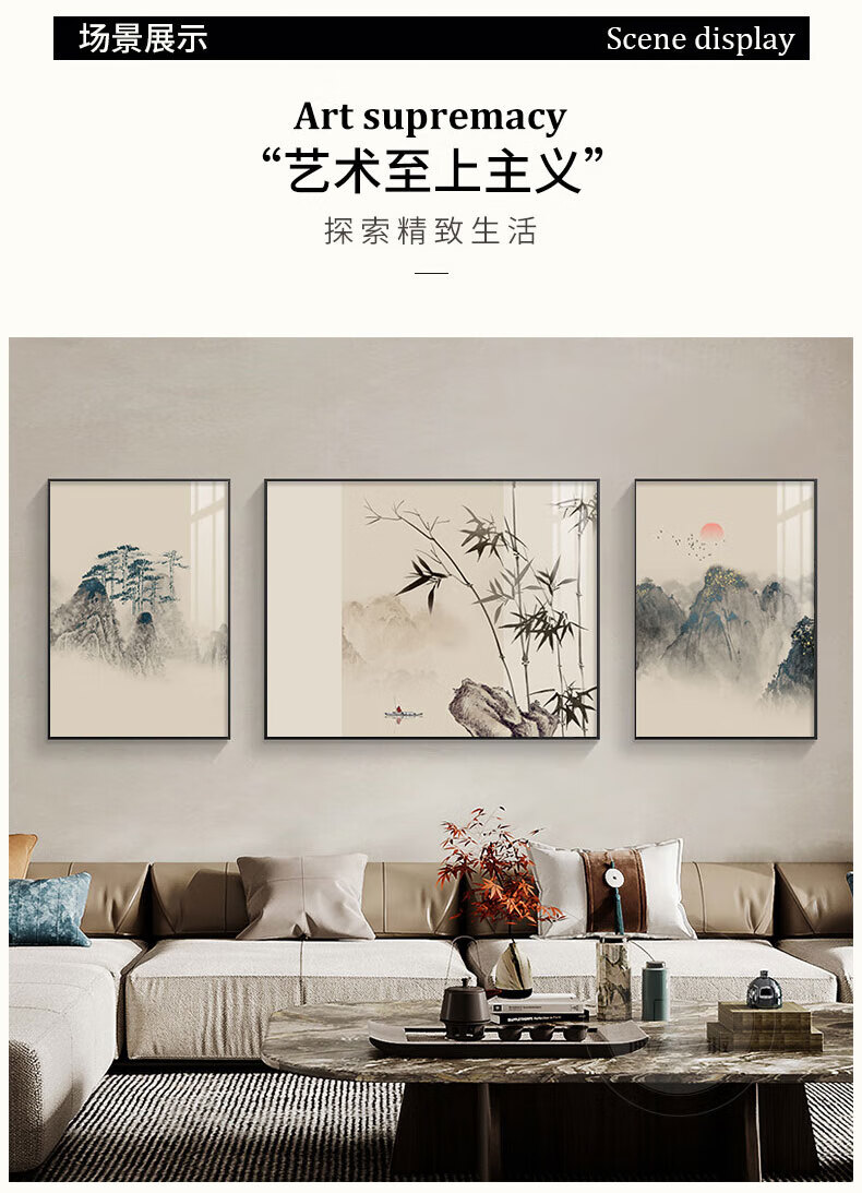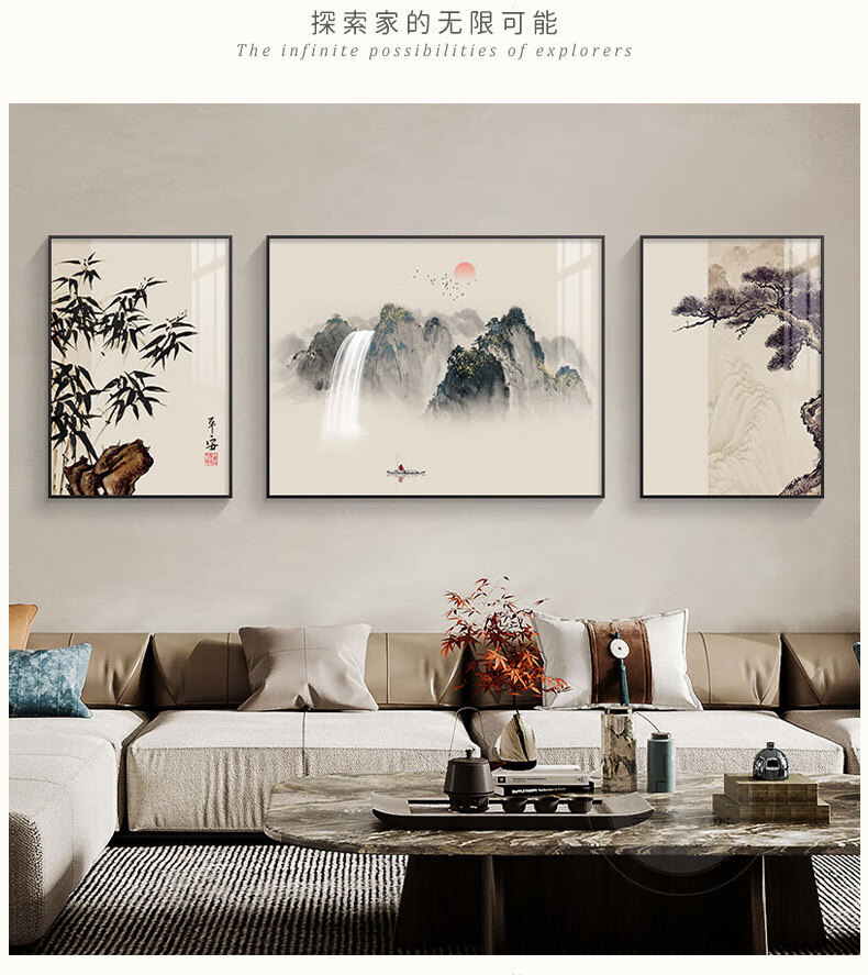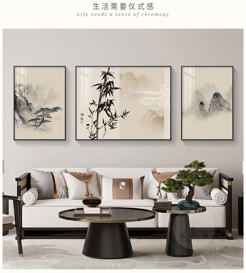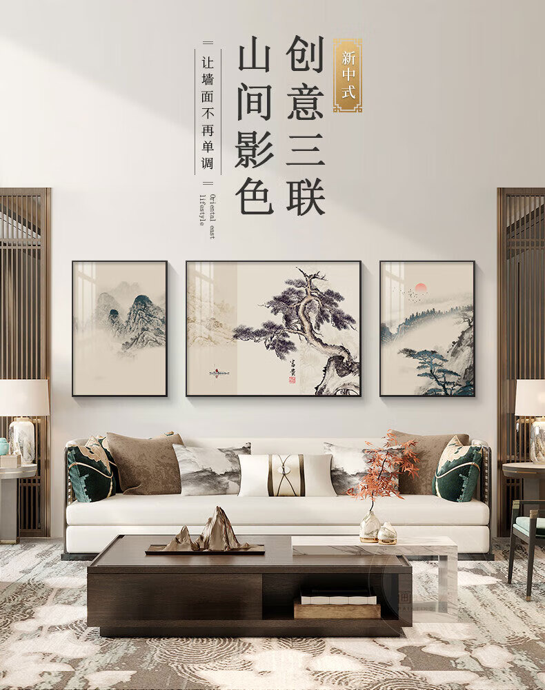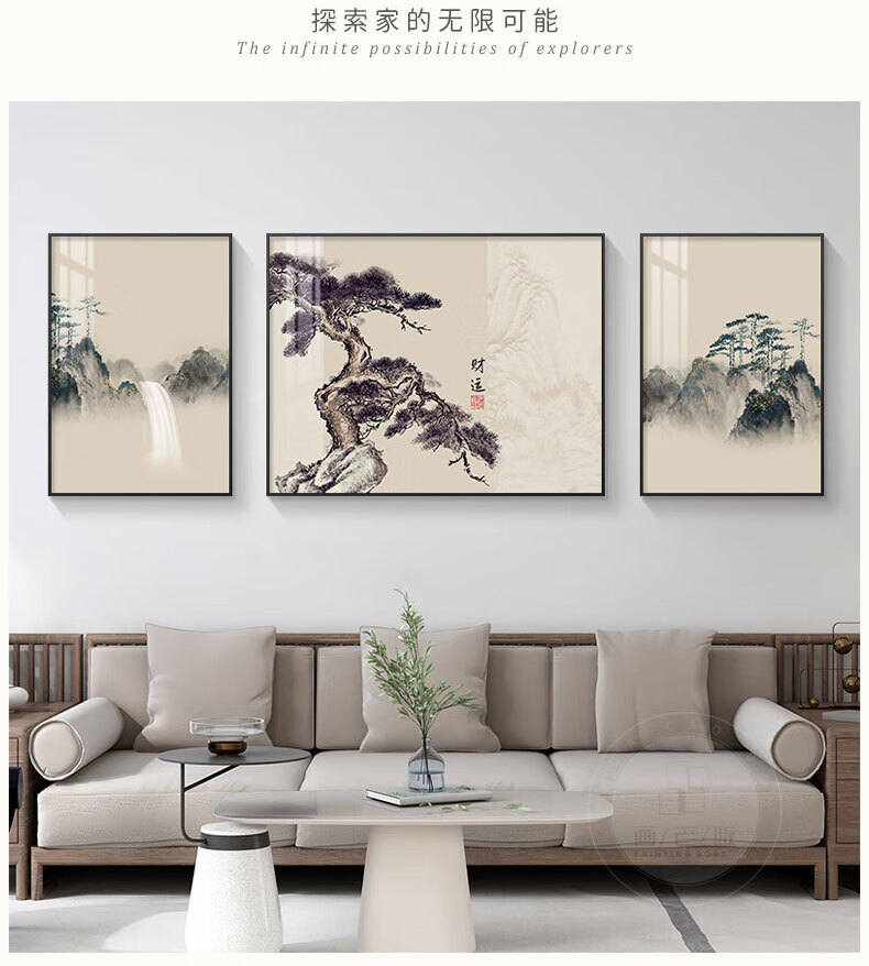 Hehua living room decorative painting ink Chinese painting hanging painting sofa background wall decorative painting triptych new Chinese style simple and atmospheric style welcoming pine-F 60*80*2+120*80 crystal porcelain + aluminum alloy frame