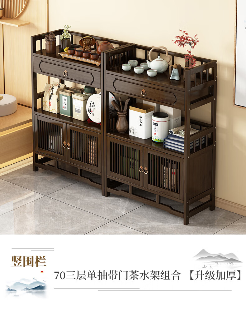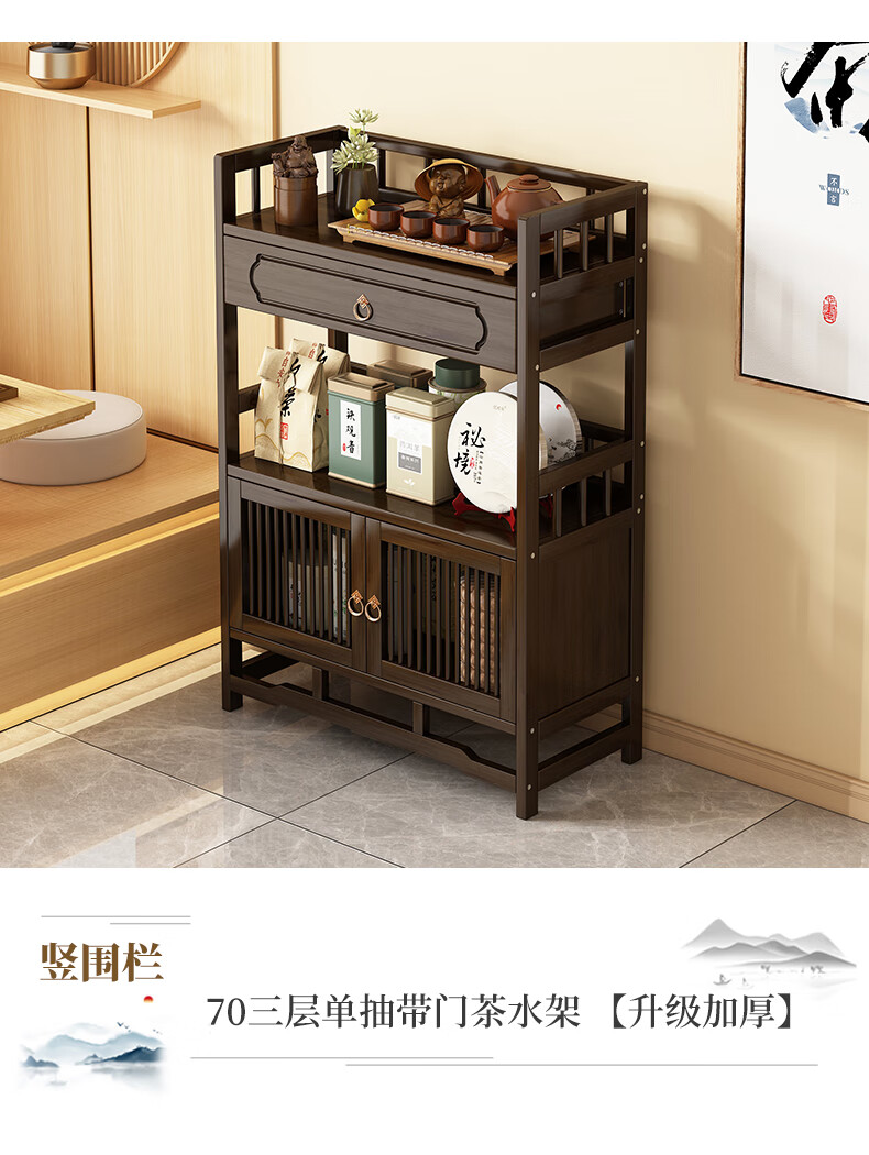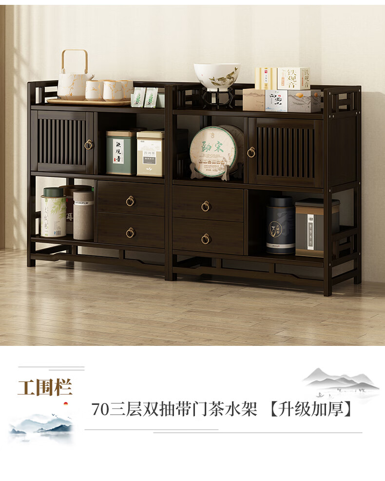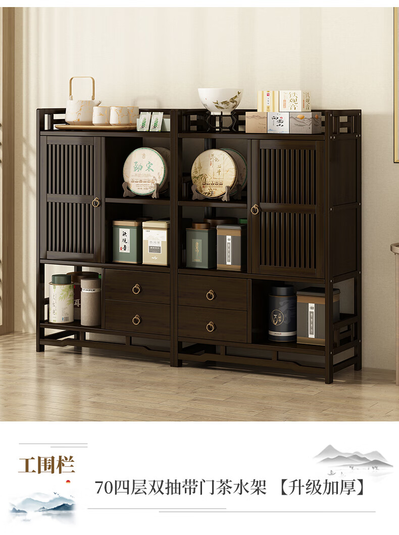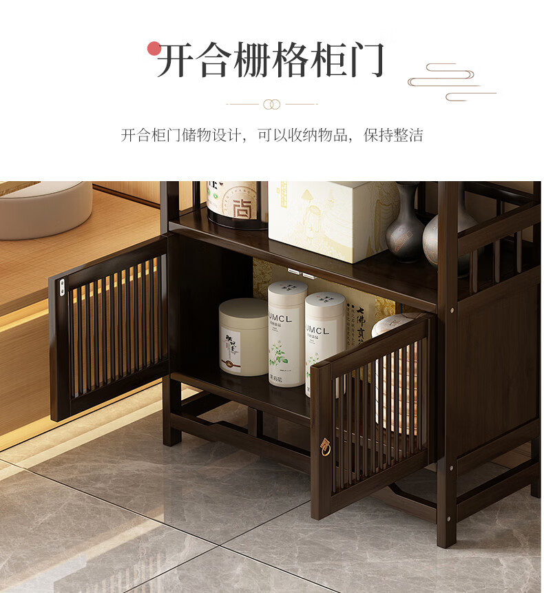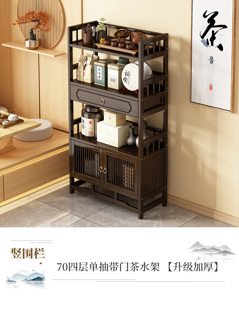 Qiao Tongjiang new Chinese style solid wood ancient rack ornaments tea rack storage rack Duobao Pavilion display cabinet tea set tea cup storage shelf walnut color three-layer middle draw with door 70 length reinforcement