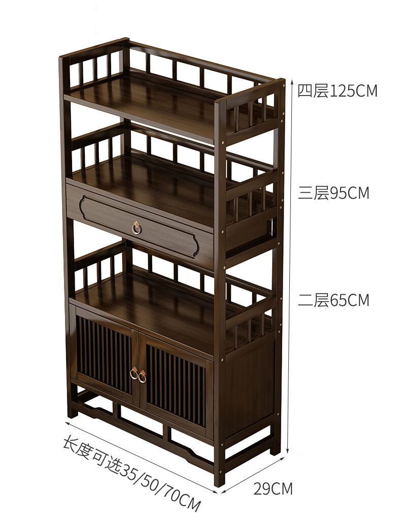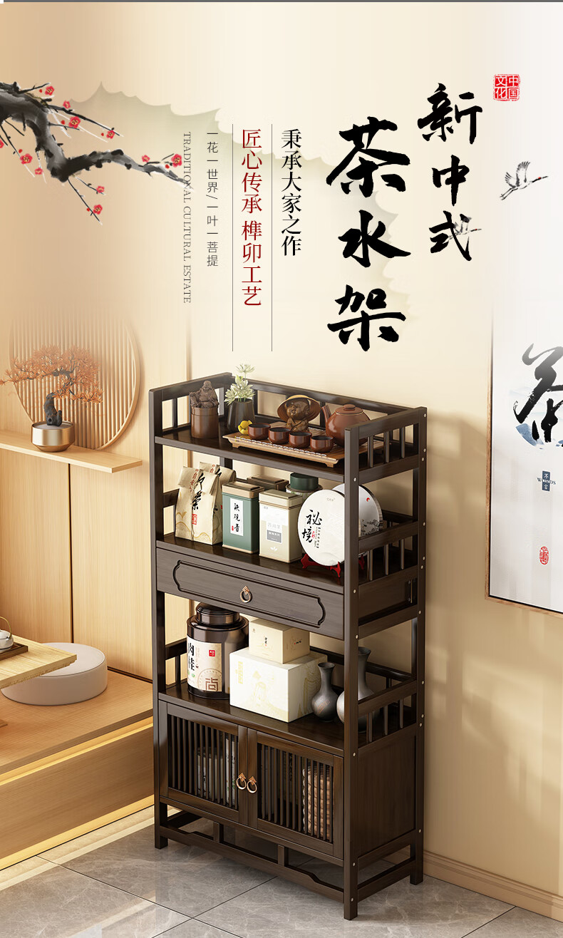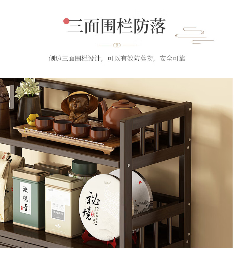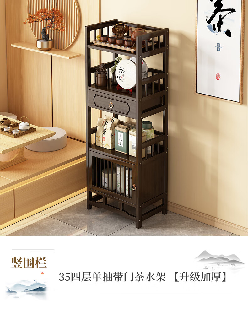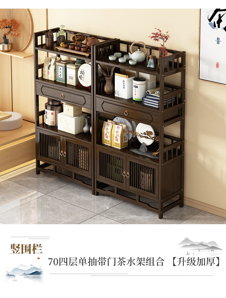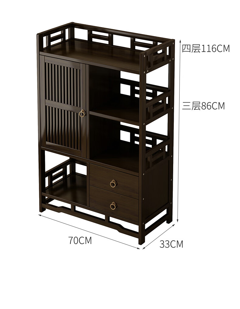 Qiao Tongjiang new Chinese style solid wood ancient rack ornaments tea rack storage rack Duobao Pavilion display cabinet tea set tea cup storage shelf walnut color three-layer middle draw with door 70 length reinforcement