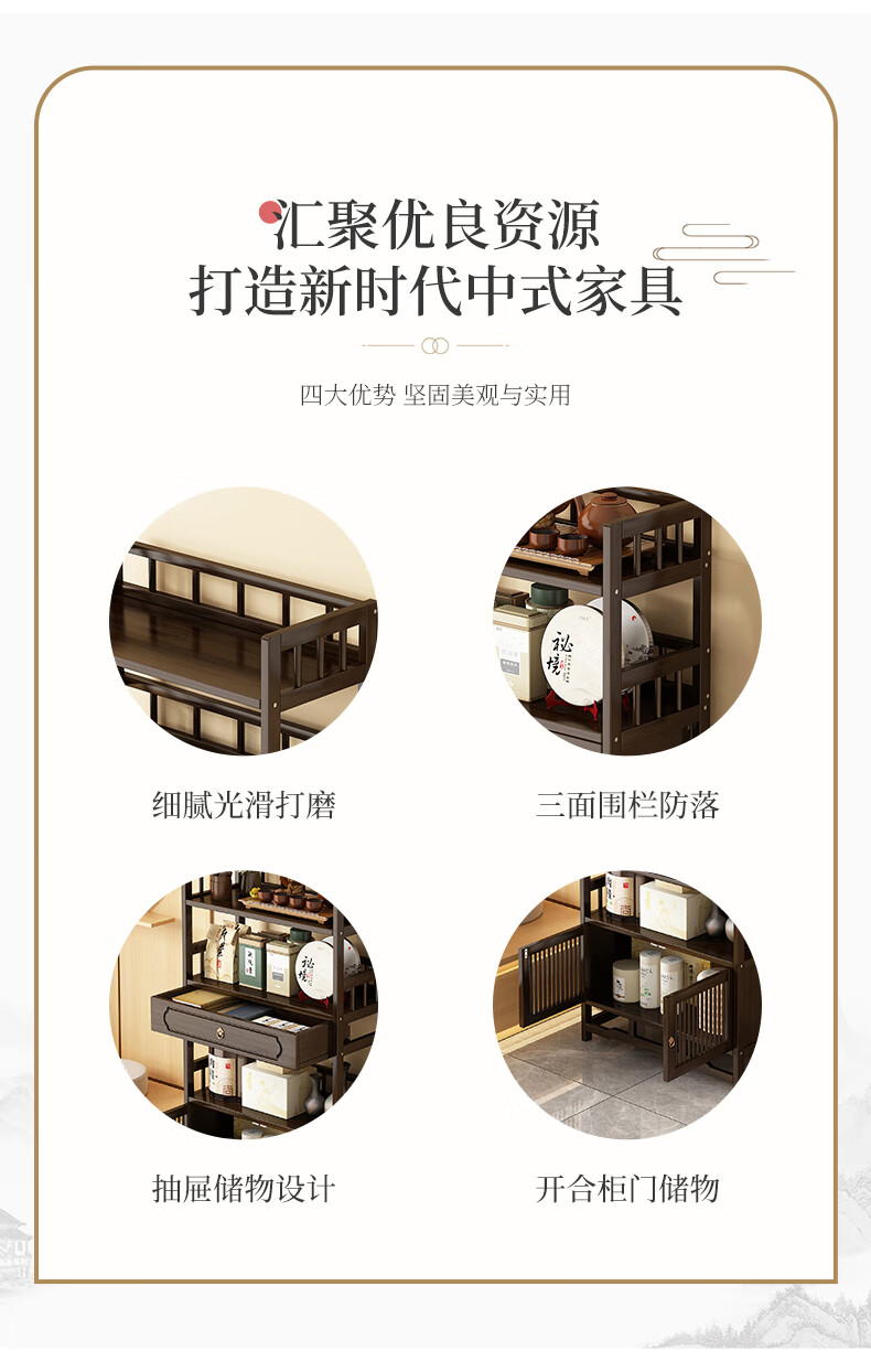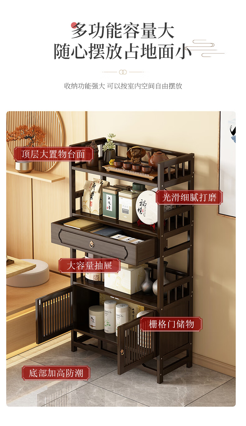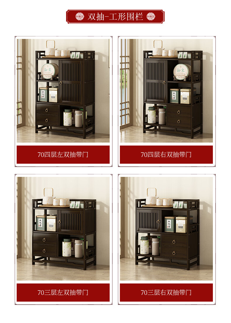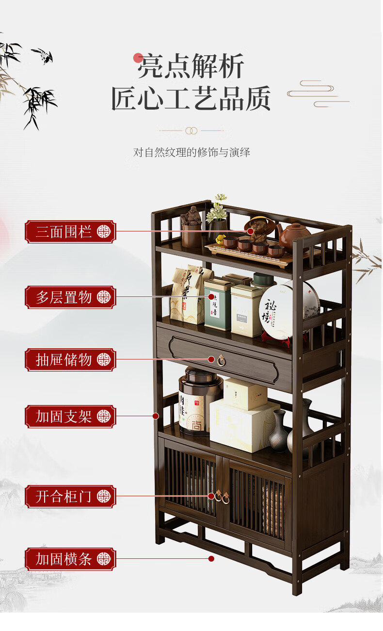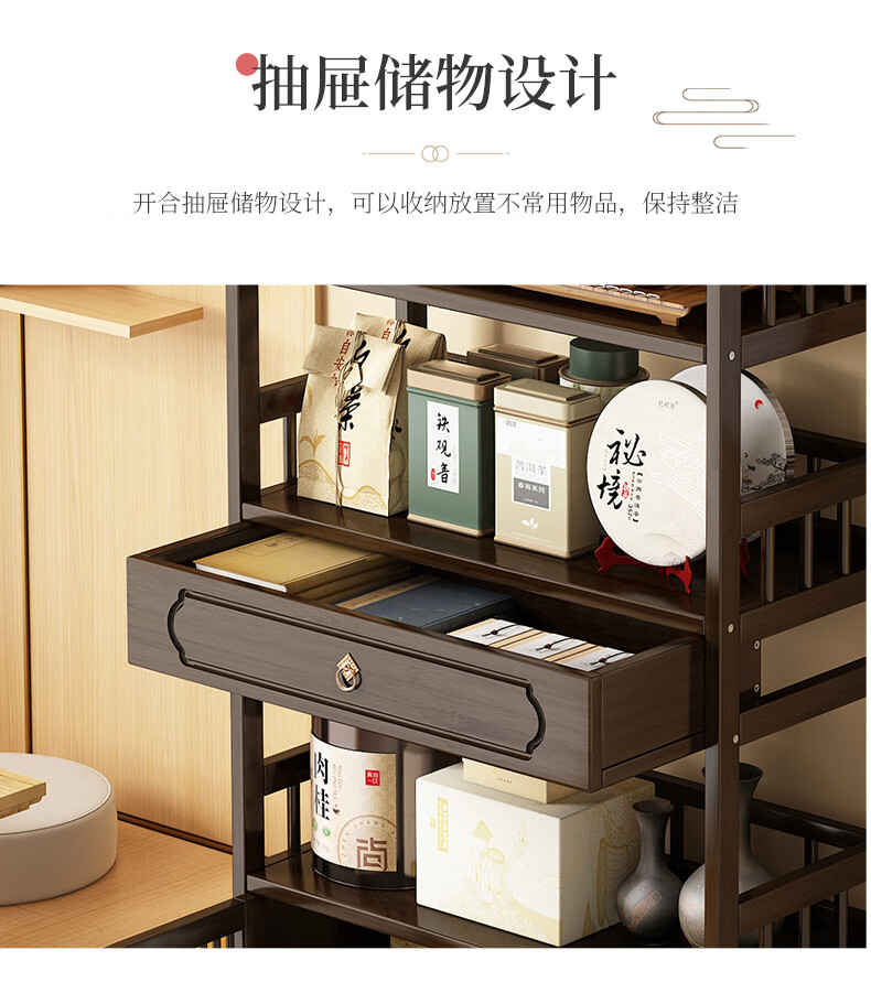 Qiao Tongjiang new Chinese style solid wood ancient rack ornaments tea rack storage rack Duobao Pavilion display cabinet tea set tea cup storage shelf walnut color three-layer middle draw with door 70 length reinforcement