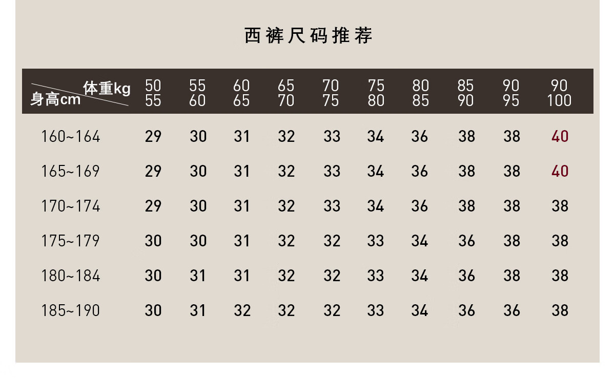 China (cm) 160-165/84-86 165-170 / 88-90 167-172 / 92-96 168-173 / 98-102 170-176 / 106-110