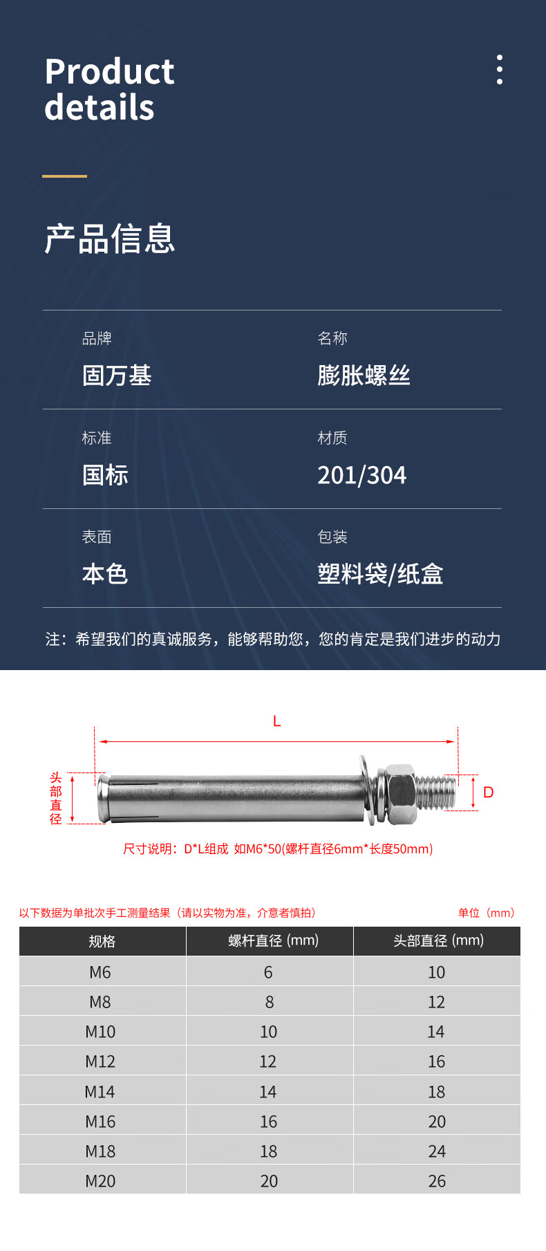 GUWANJI 304/201 stainless steel external expansion screw galvanized extended expansion bolt pull-out screw expansion tube national standard M6x100 (10 pieces - 201 material)