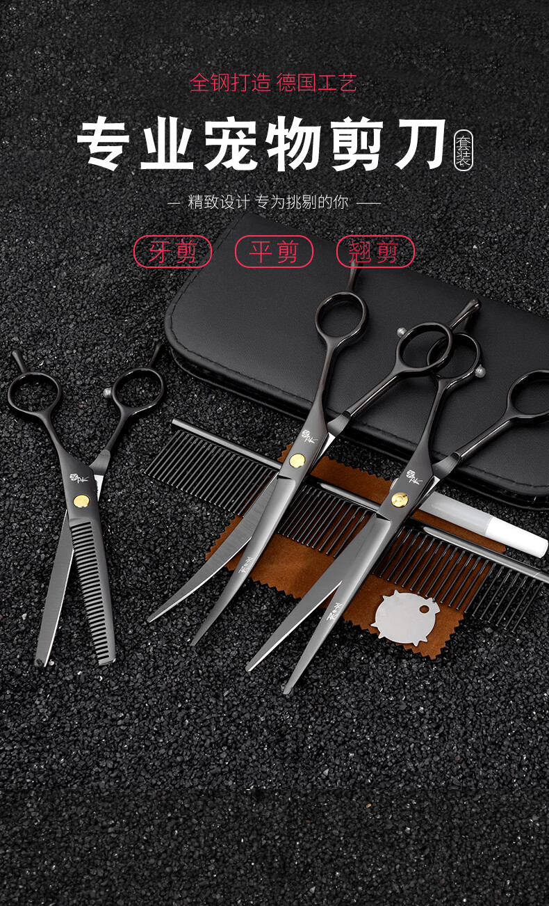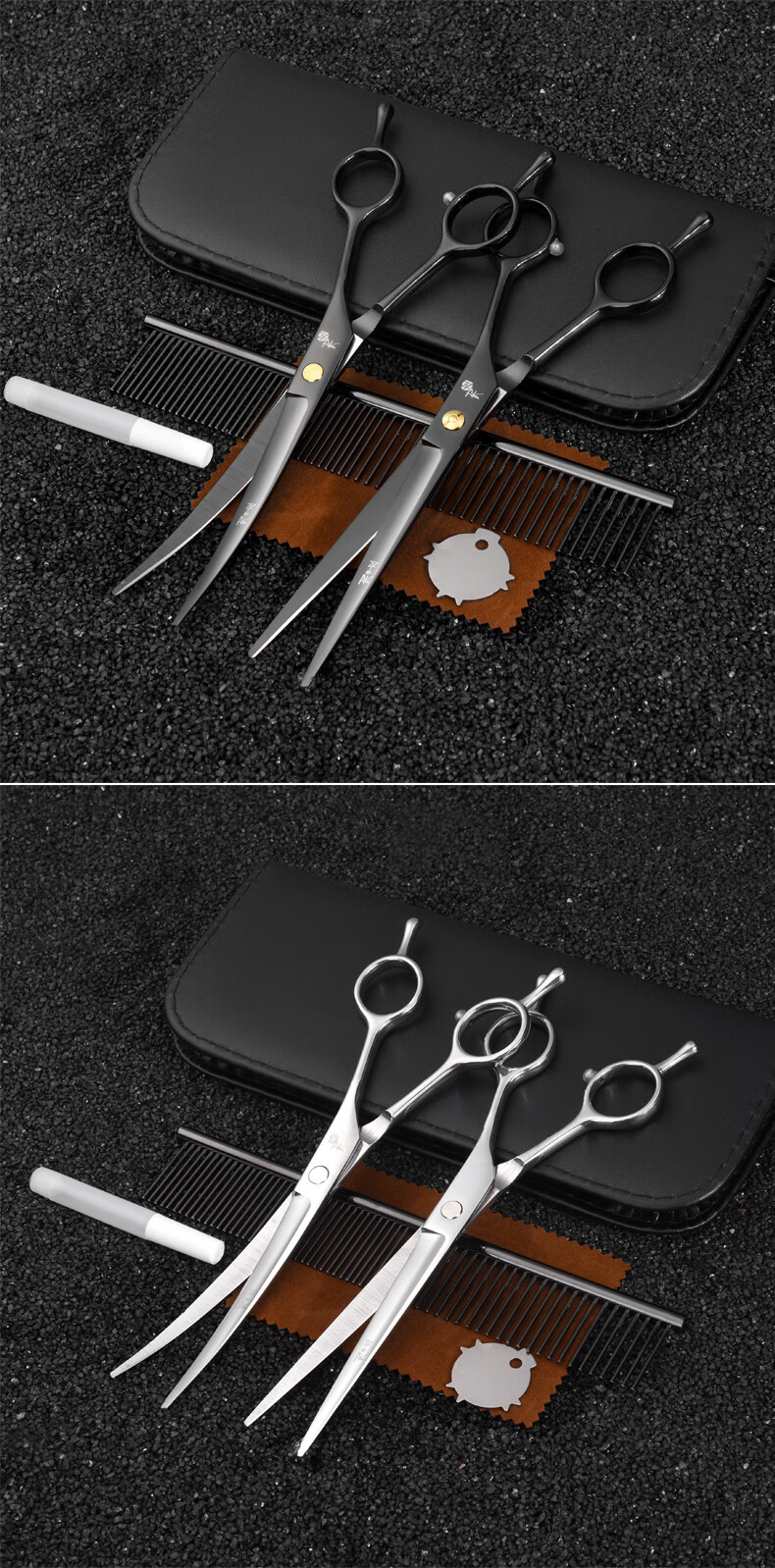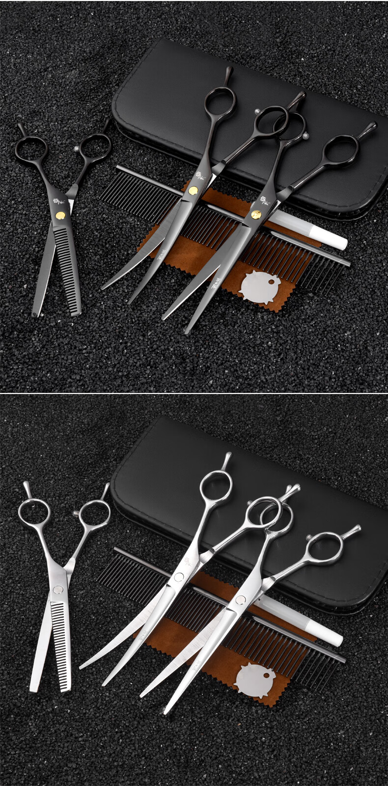 NOPPS Pet Grooming Scissors Professional Hair Trimming Set Curved Scissors Dental Scissors Teddy Self-Cut Dog Hair Cat Hair Trimming Tool Silver Flat Scissors + Dental Scissors + Curved Scissors + Steel Comb + Bag