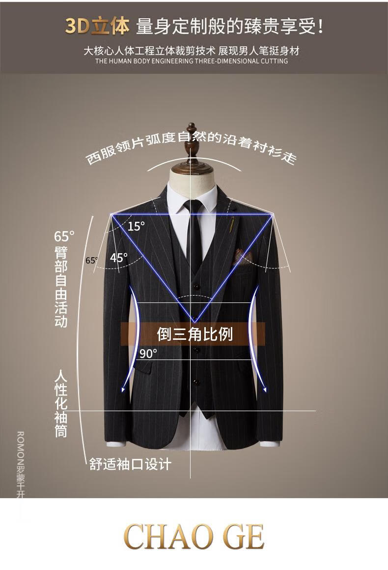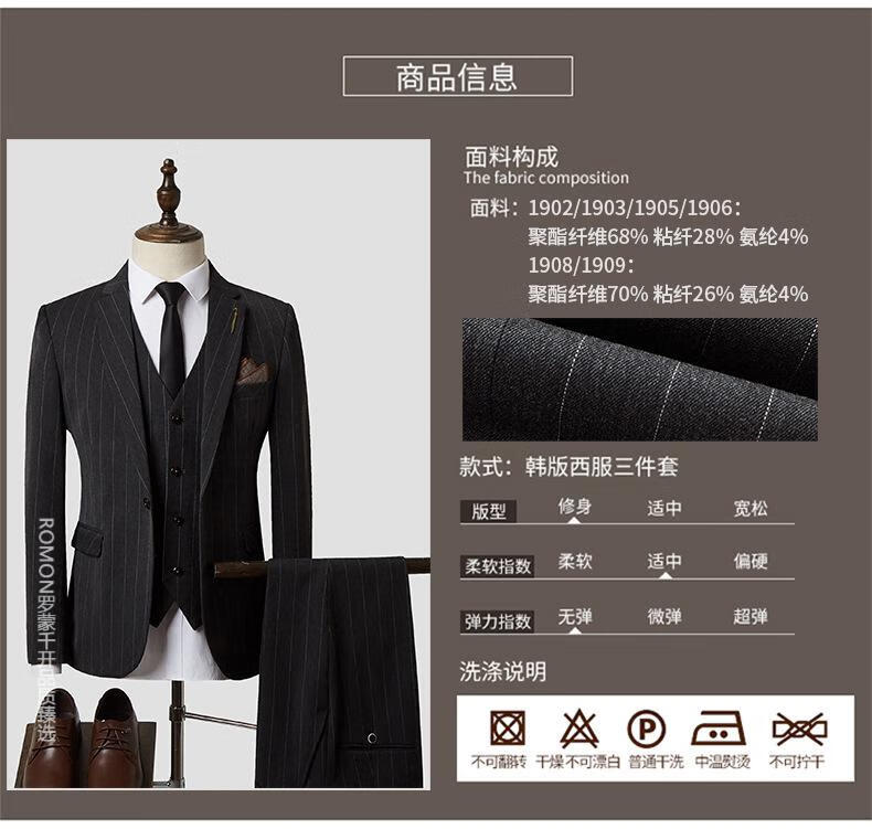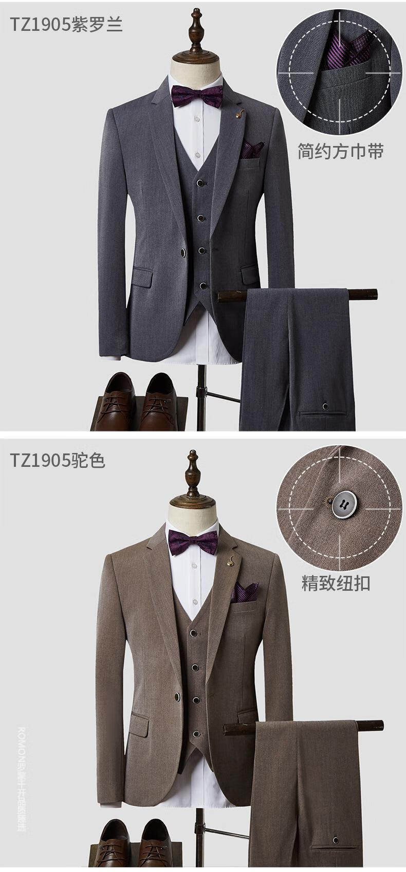 ROMON suit men's three-piece suit business formal casual small suit groomsmen groom wedding dress men's SJT1903 brown L