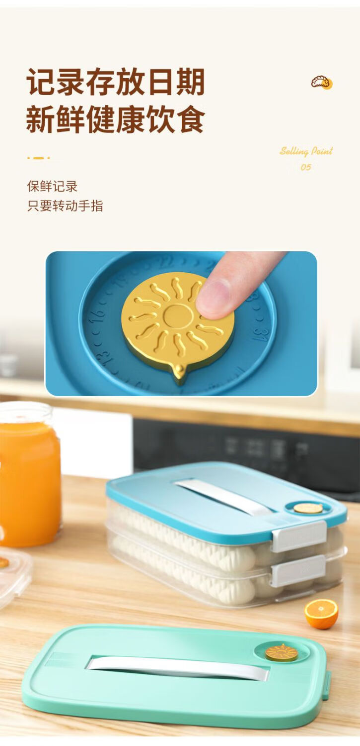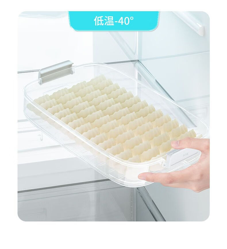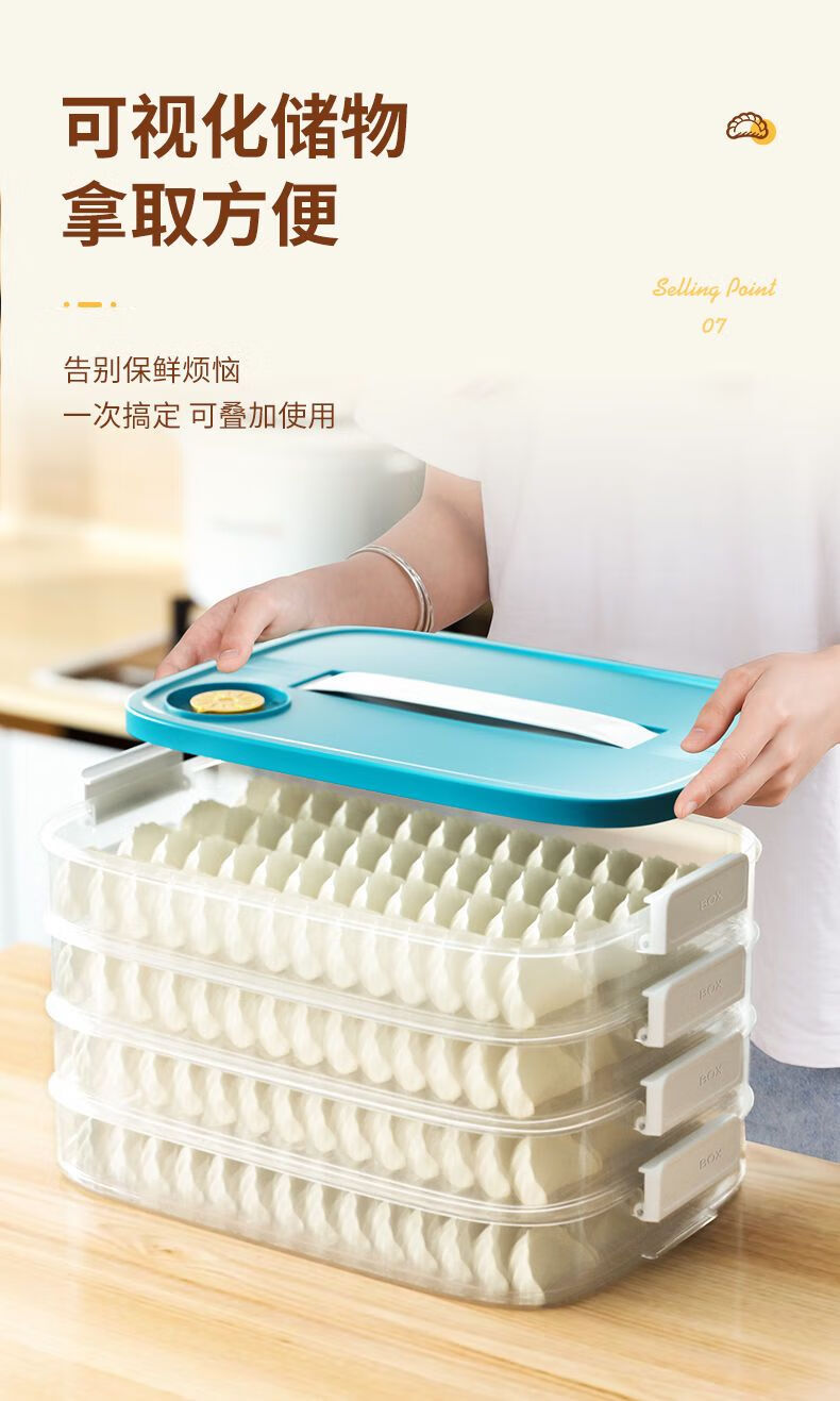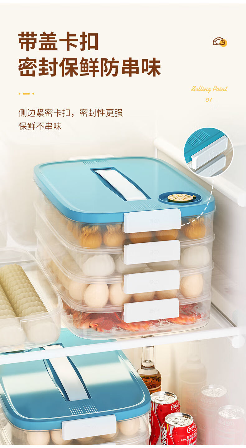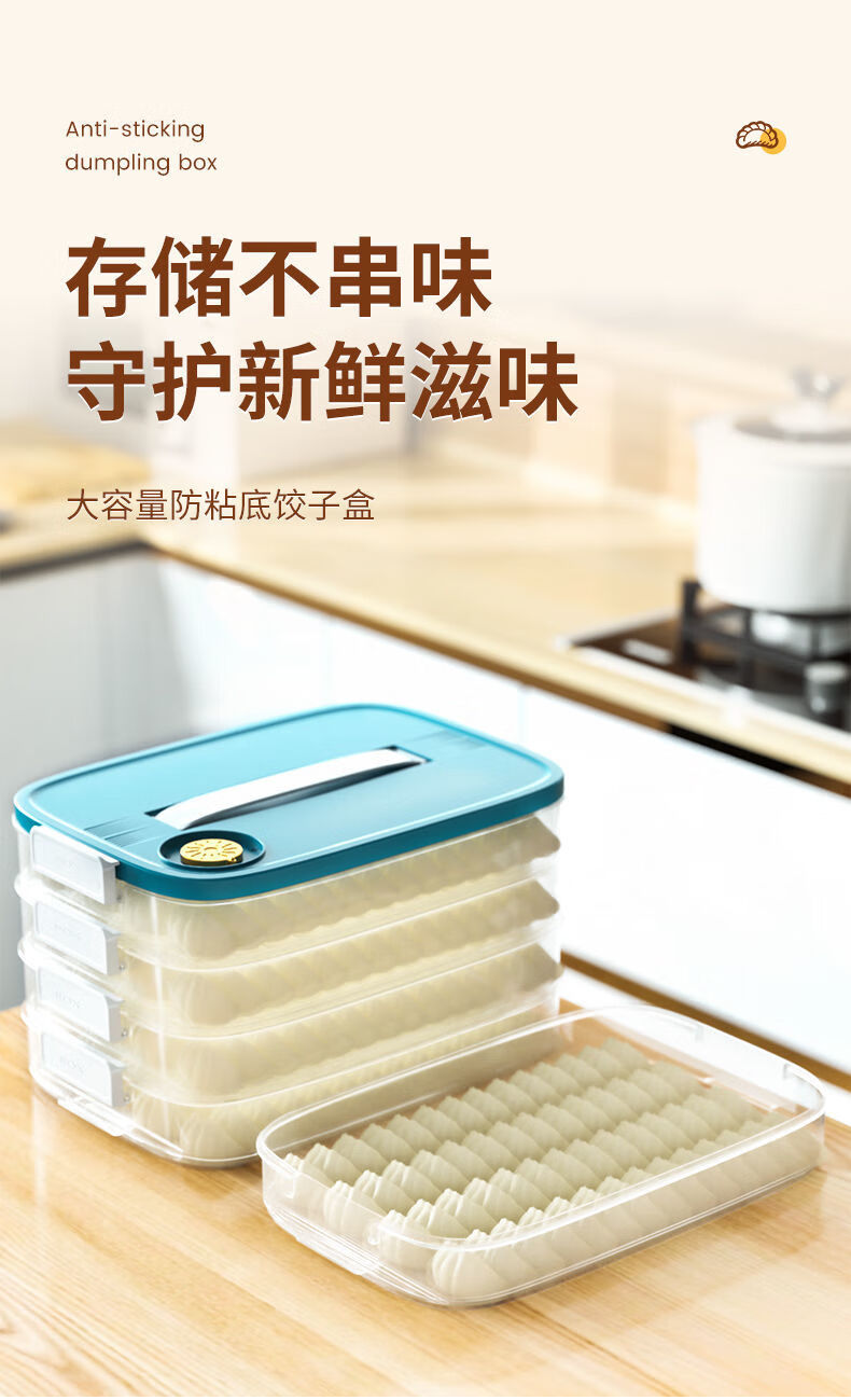 Jie Yintong dumpling storage box, large-capacity 4-layer quick-frozen wonton crisper tray, multi-layer household kitchen refrigerator, one layer, one cover, holds about 60 dumplings, blue, keeps fresh without odor/records storage date