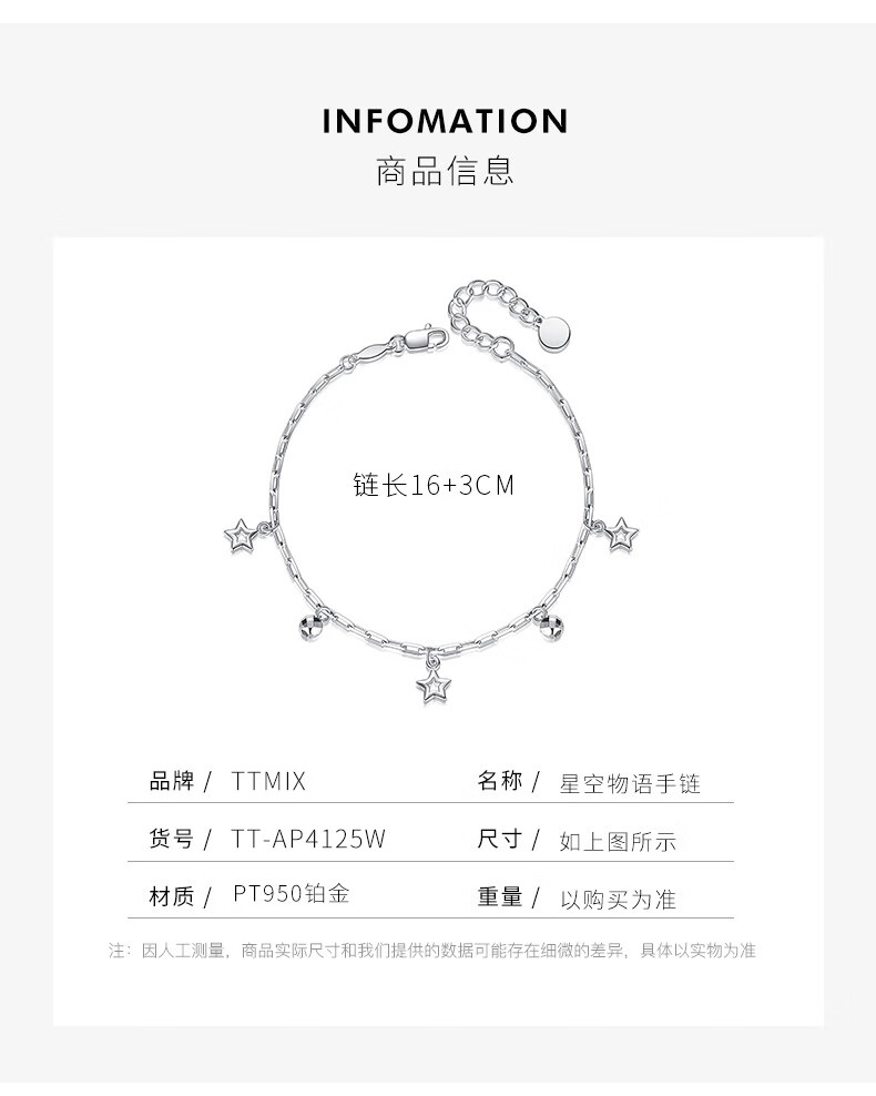 TTMIX platinum bracelet for women PT950 platinum star cross buckle chain fashion jewelry for girlfriend 4.8-5.0g 16+3cm