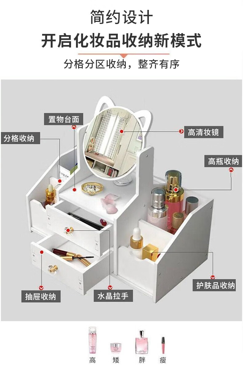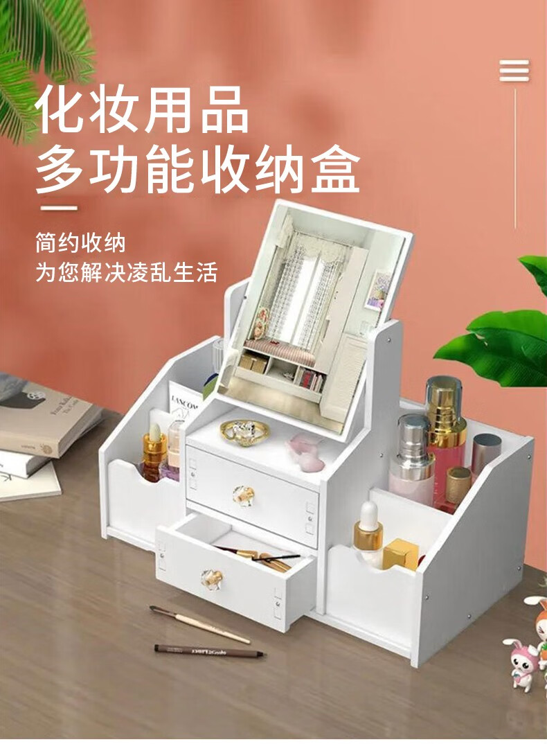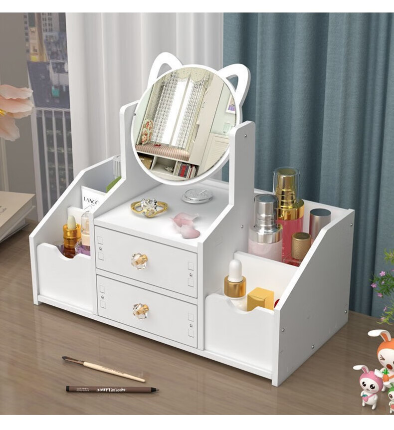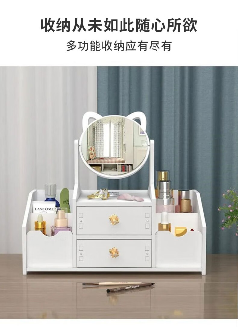 Zhenxiqi cosmetics storage box with mirror makeup box dormitory home desktop jewelry storage box miscellaneous storage box large double grid round mirror