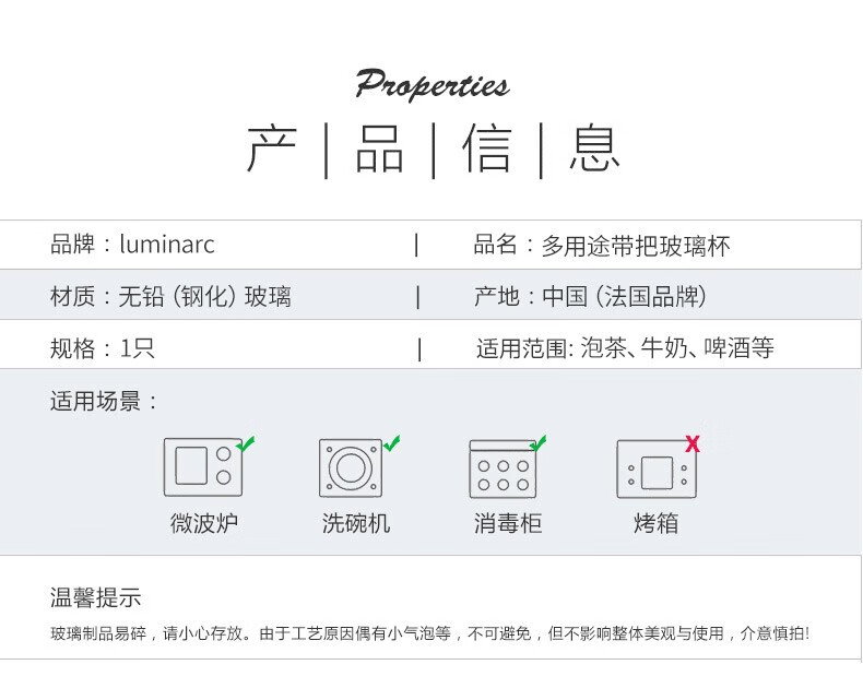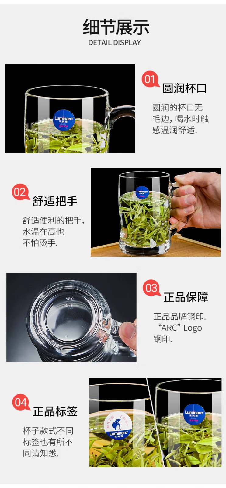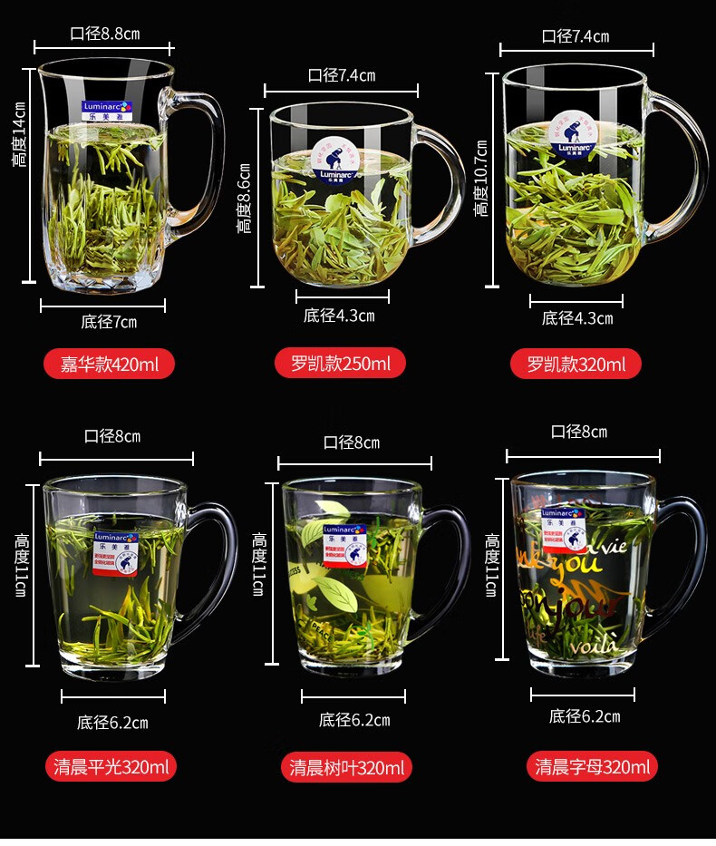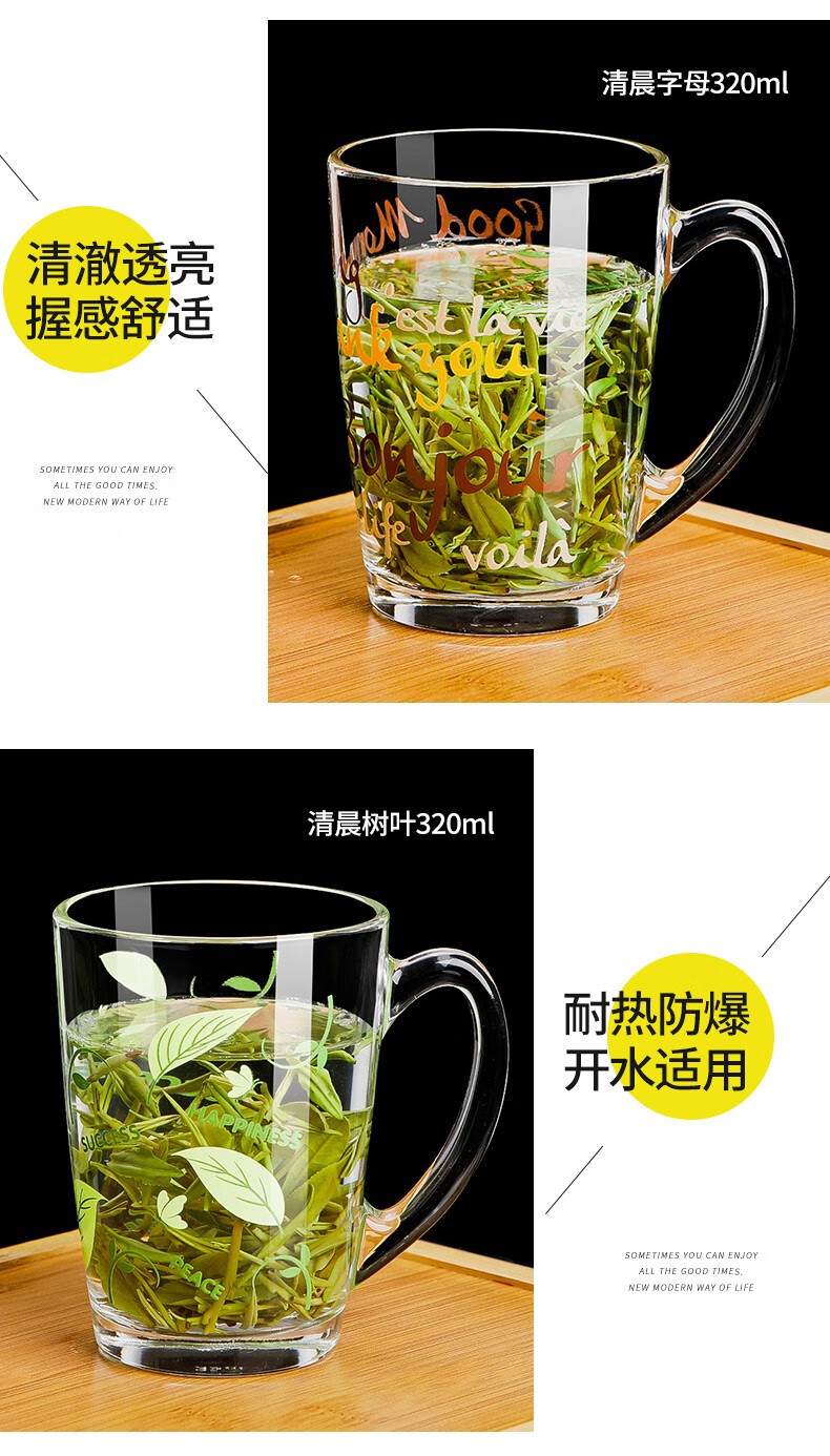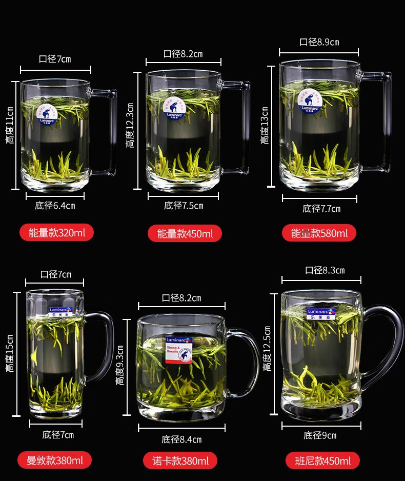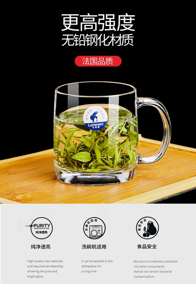 Luminarc thickened tempered glass cup household tea cup with handle large capacity tea cup green tea cup drinking cup with handle Benny 450ml two