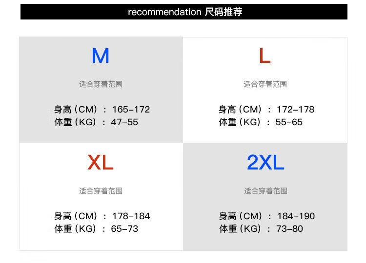 China (cm) 165 / 88-90 170 / 96-98 175 / 108-110 180 / 118-122 185 / 126-130