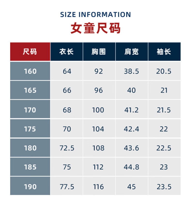 China (cm) 160-165/84-86 165-170 / 88-90 167-172 / 92-96 168-173 / 98-102 170-176 / 106-110