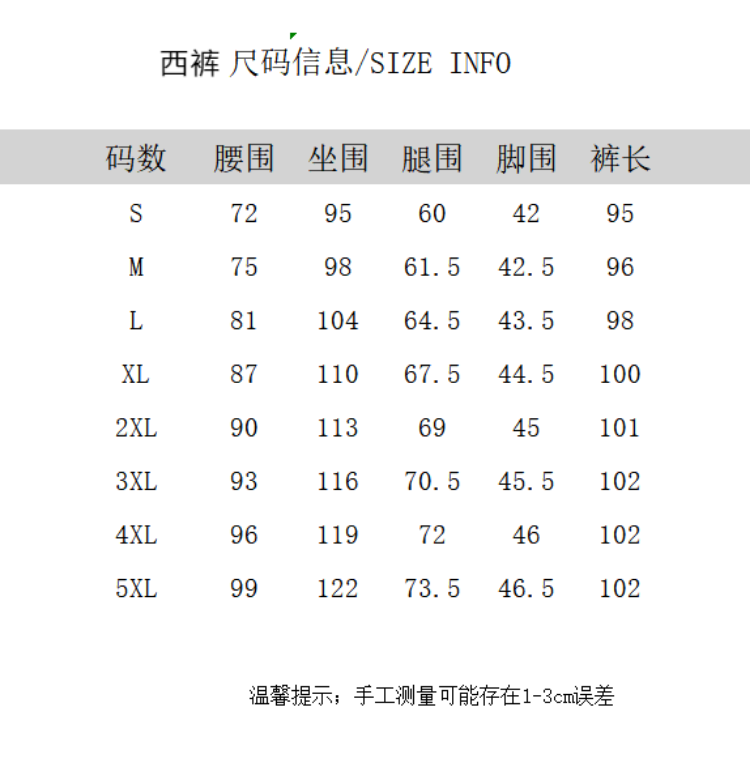 Outseam (cm) 99 cm 101.5 cm 104 cm 106.5 cm 109 cm