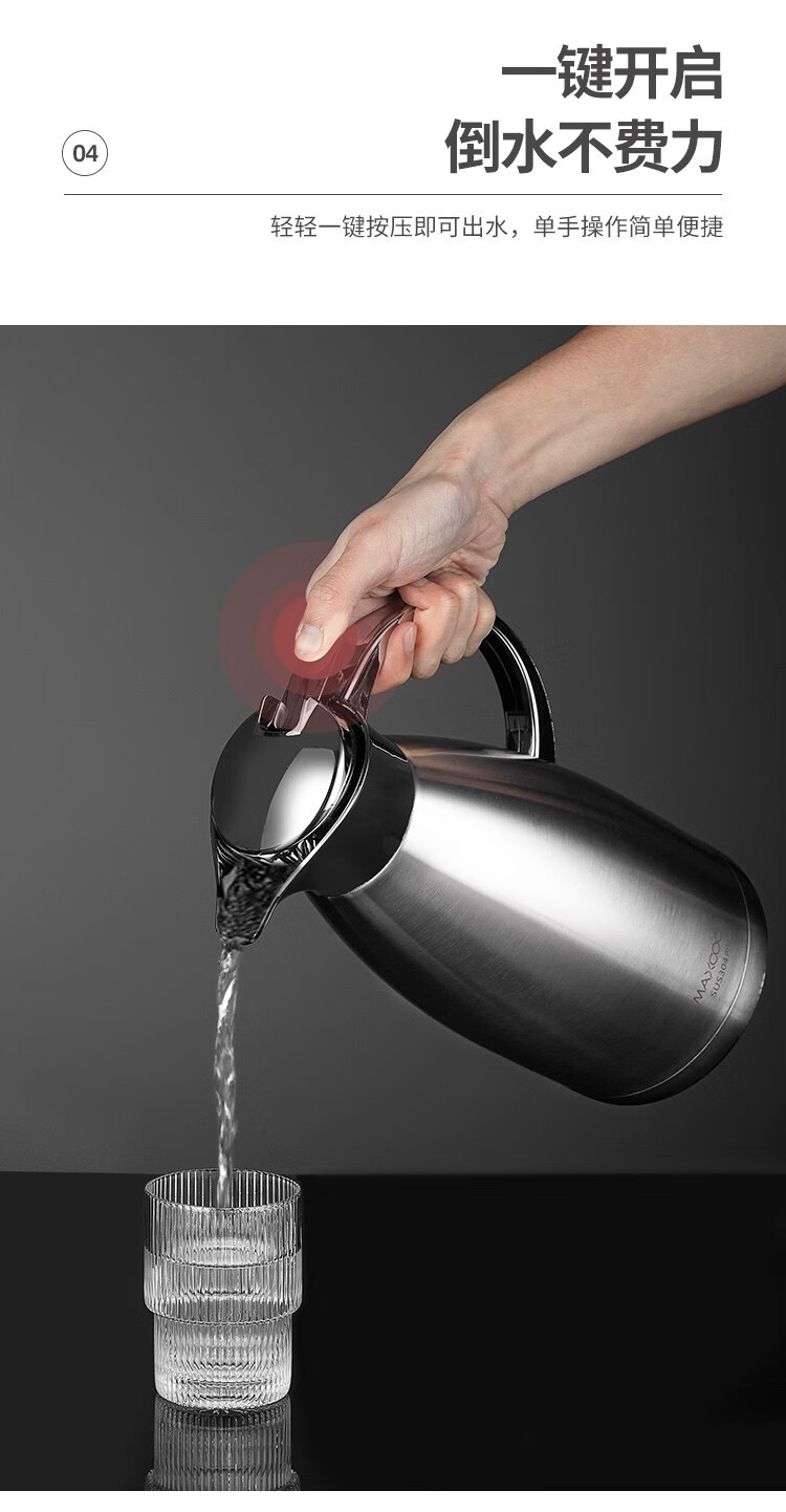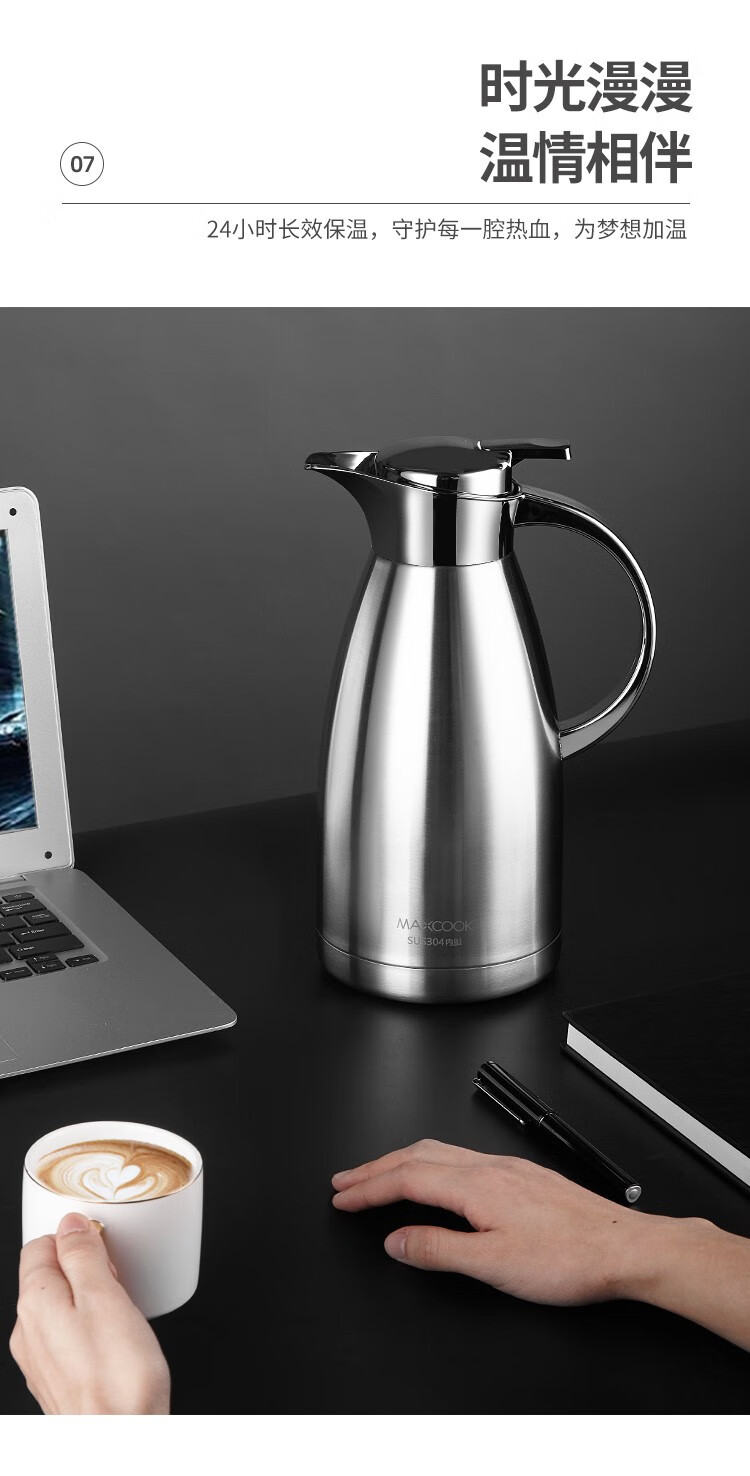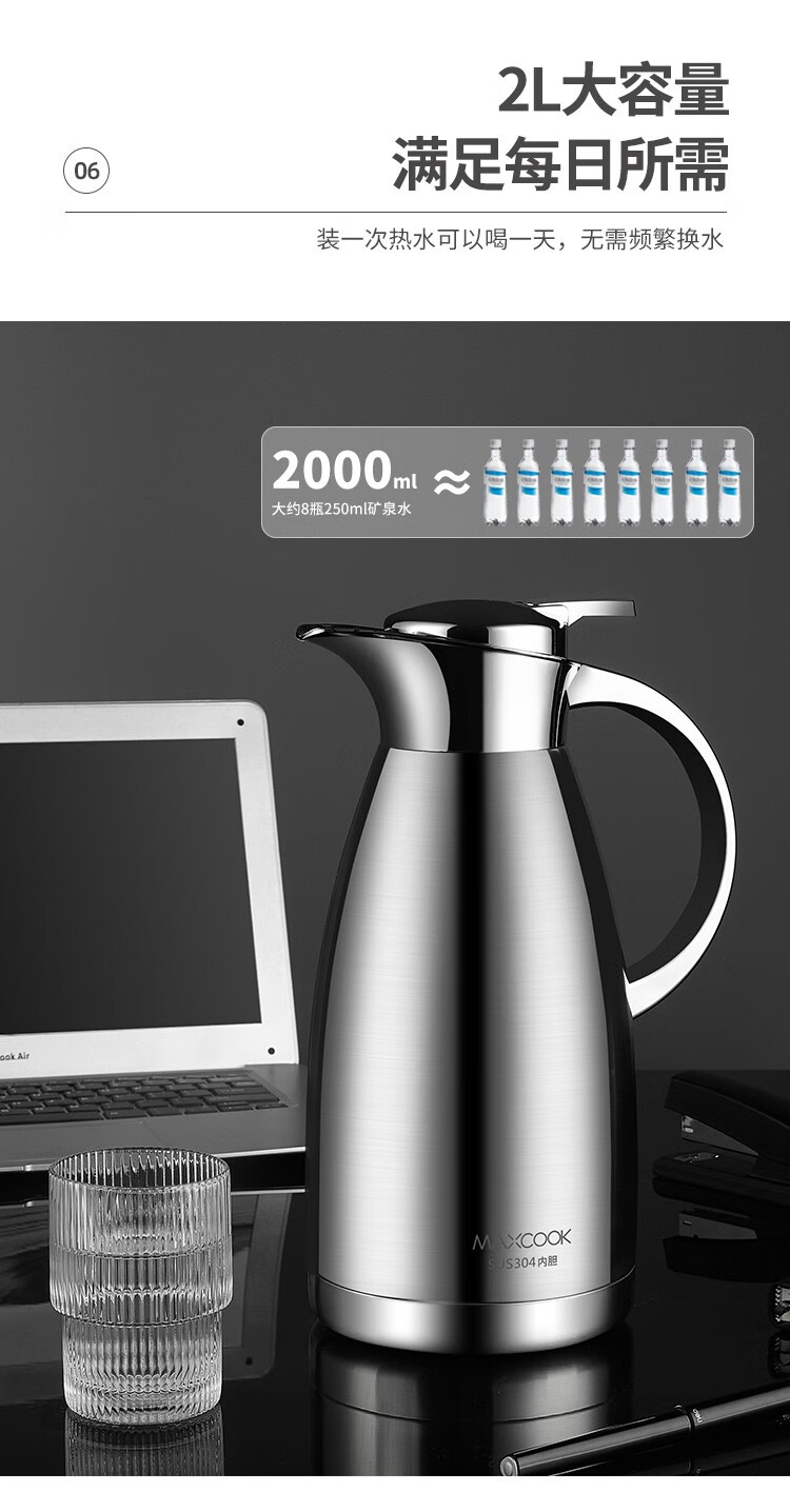 MAXCOOK thermos kettle 304 stainless steel vacuum hot water kettle thermos flask thermos boiling water bottle large capacity non-slip coffee pot 2L natural color MCB3932L
